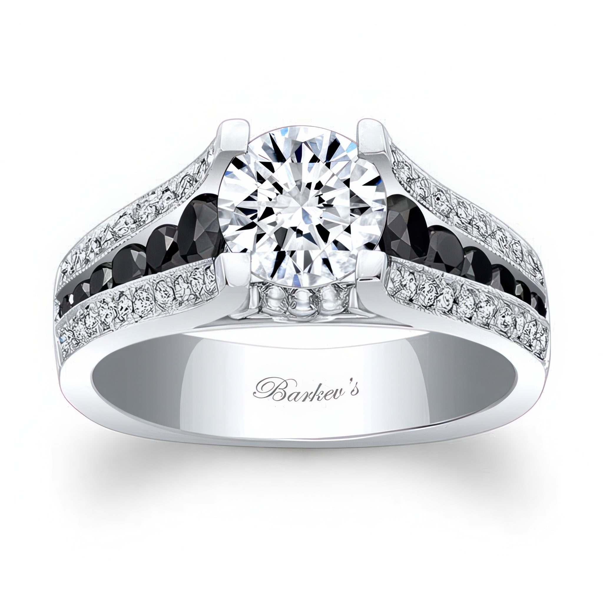 This 3 row pave black diamond accent moissanite ring sports a prong set round center with a row of channel set black diamonds and flanking rows of pave set diamonds and a milgrain finish for a touch of elegance.