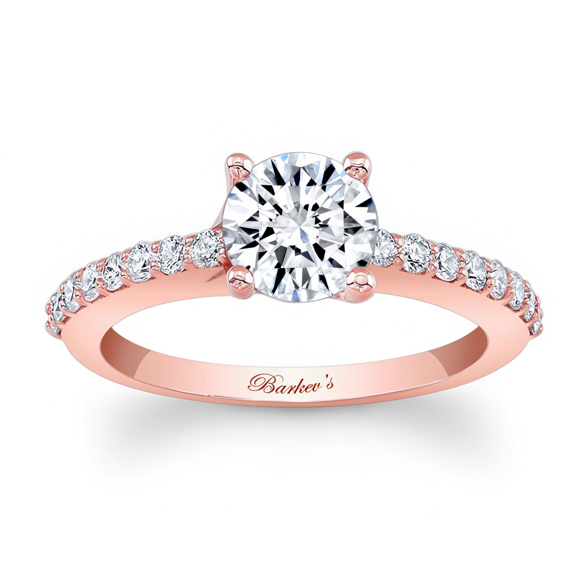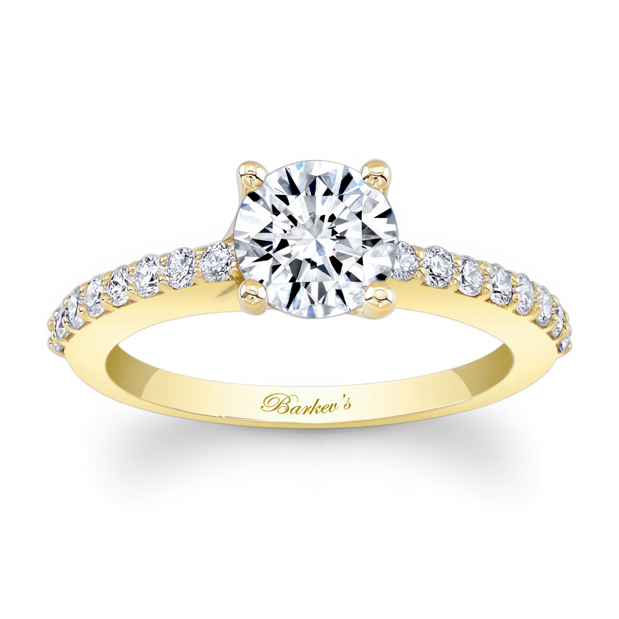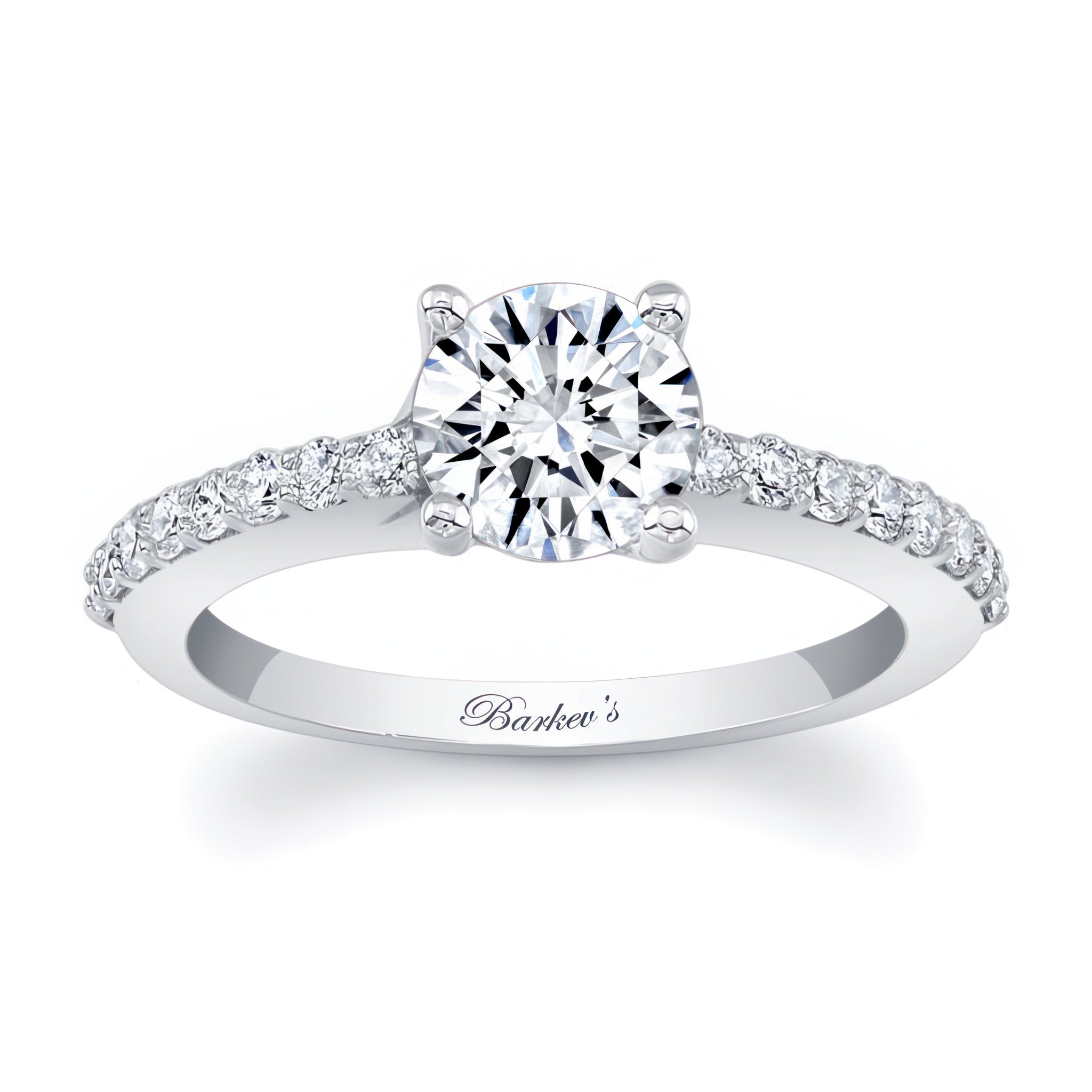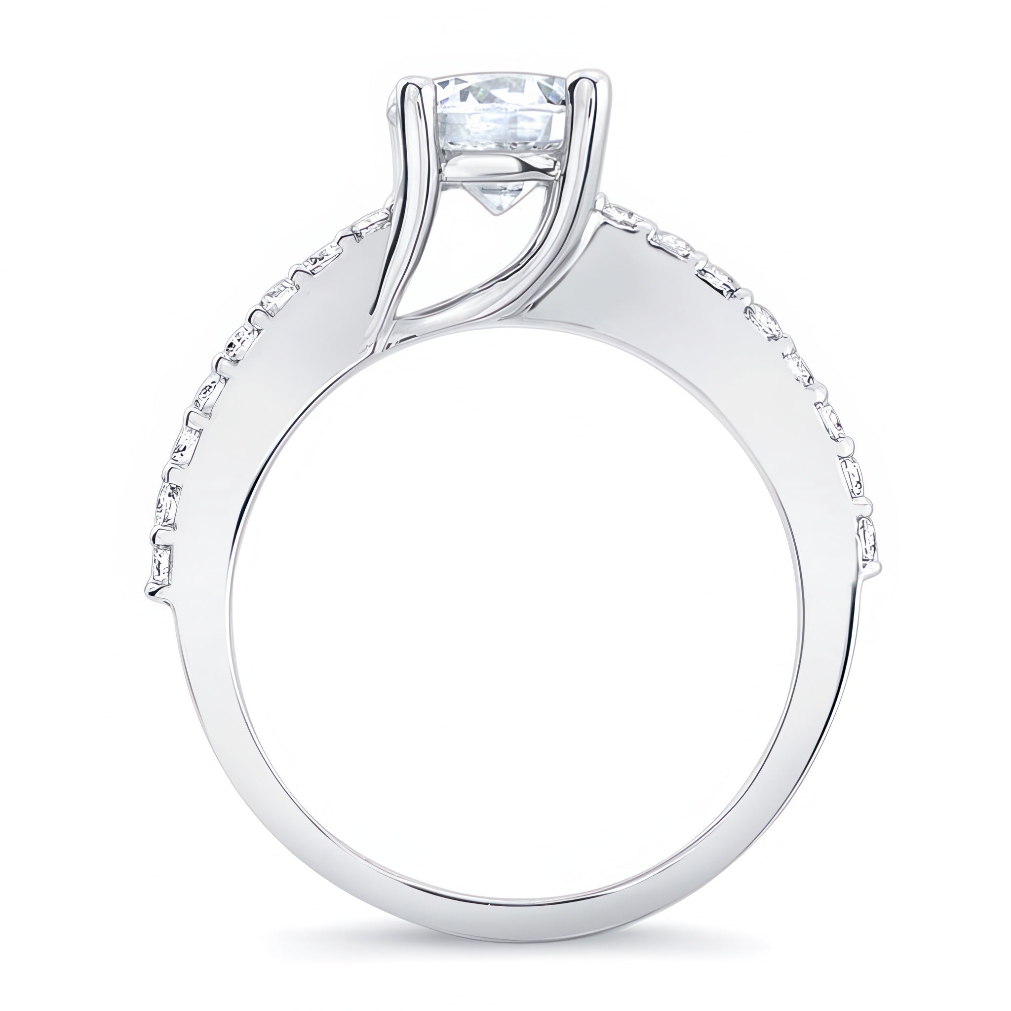 This 4 prong moissanite engagement ring features a round center adorned with shared prong set diamonds cascading down the shoulders.
