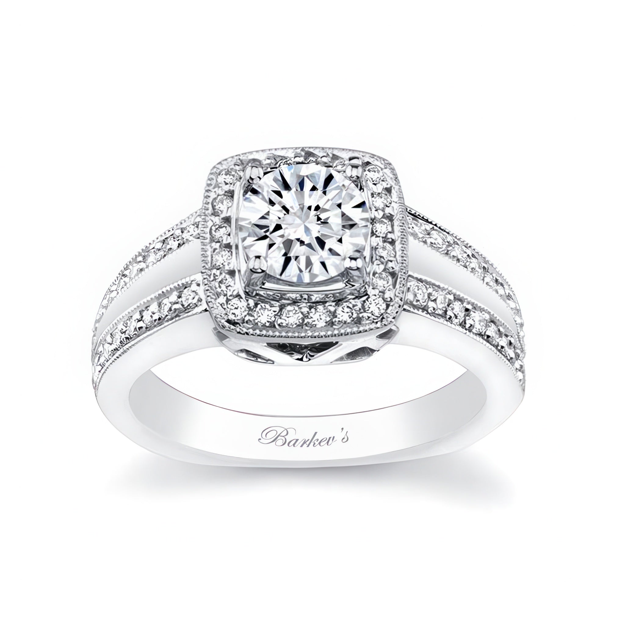 This antique moissanite engagement ring features a prong set round center with a pave set diamond halo and a split shank with pave set diamonds and a milgrain finish for a touch of elegance.