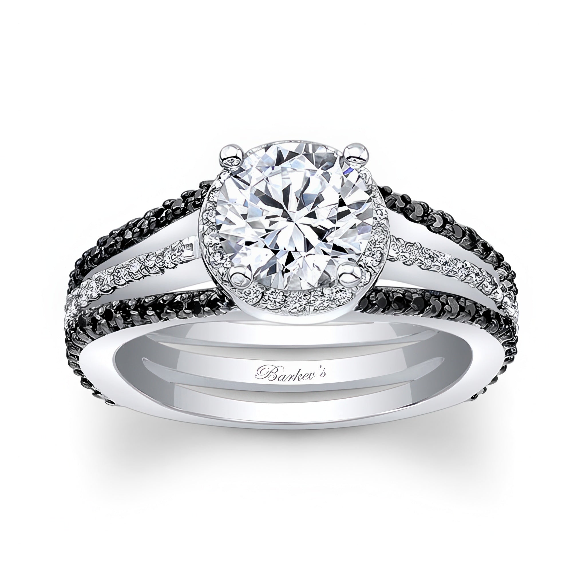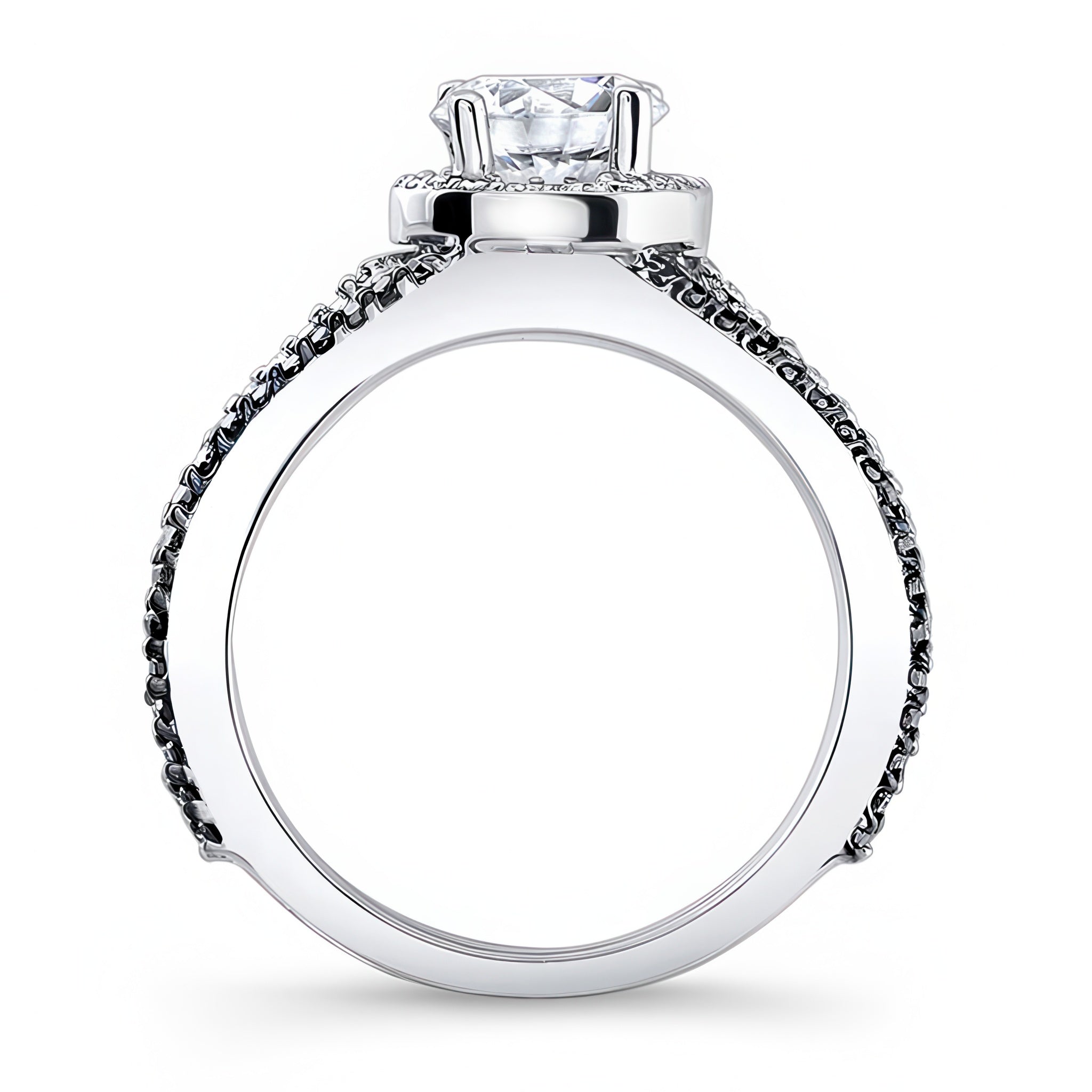 This black diamond accent halo moissanite ring features a prong set round center encircled with diamonds and a split shank sporting shared prong set black and white diamonds on the ridges.
