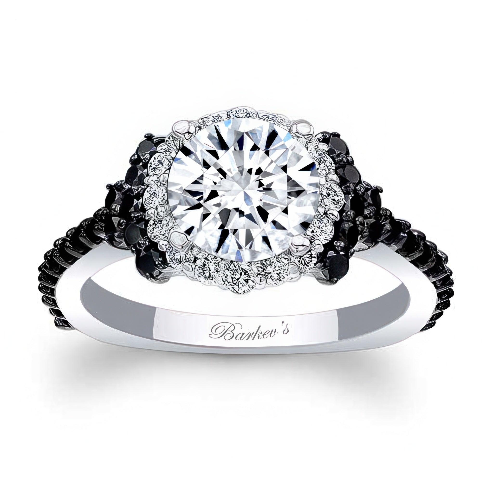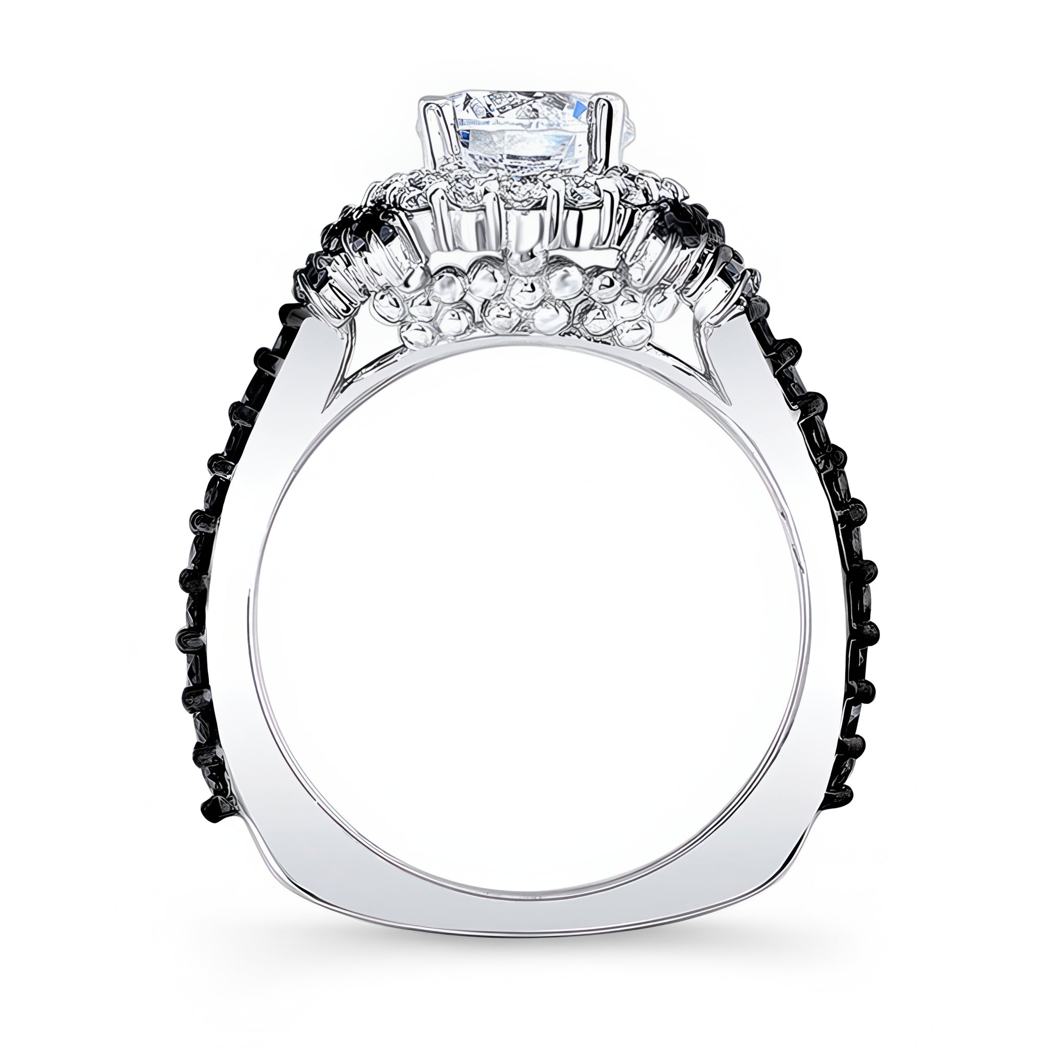 This black diamond accent moissanite cluster ring features a prong set round moissanite center with a diamond halo and shared prong set black diamonds flowing down the shank.