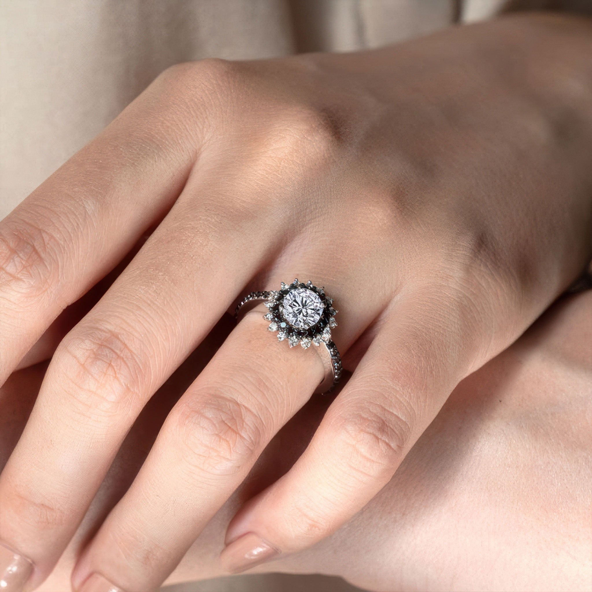 This unique black diamond accent moissanite sunflower ring features a prong set round center encircled with two rows of halo black and white diamond melees. The dainty shank is adorned with shared prong set black diamonds running down the shoulders for an elegant finish.
