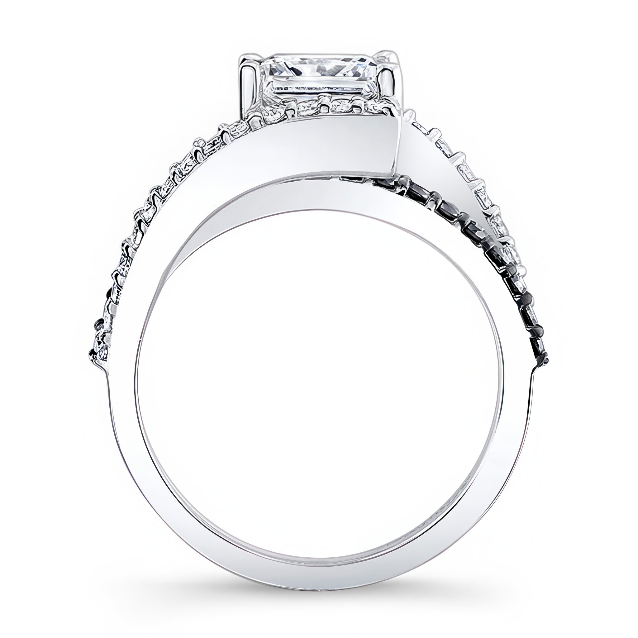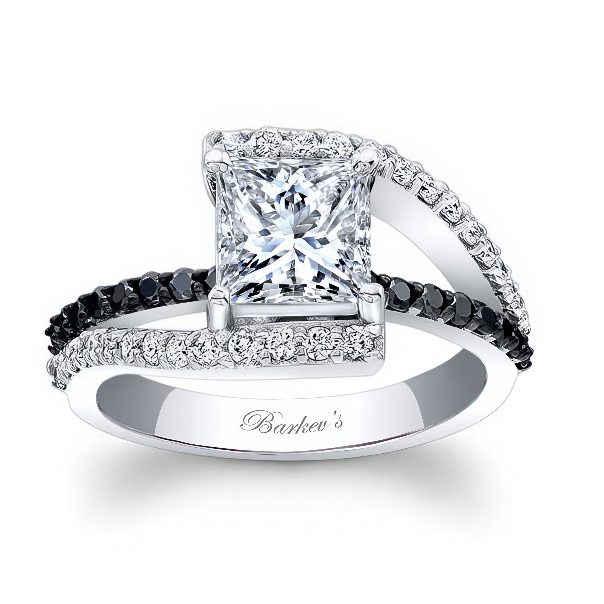This black diamond accent split shank princess moissanite ring features a prong set center with shared prong white diamonds on the shank, shoulders and black diamonds on the bridge for an added touch of elegance.