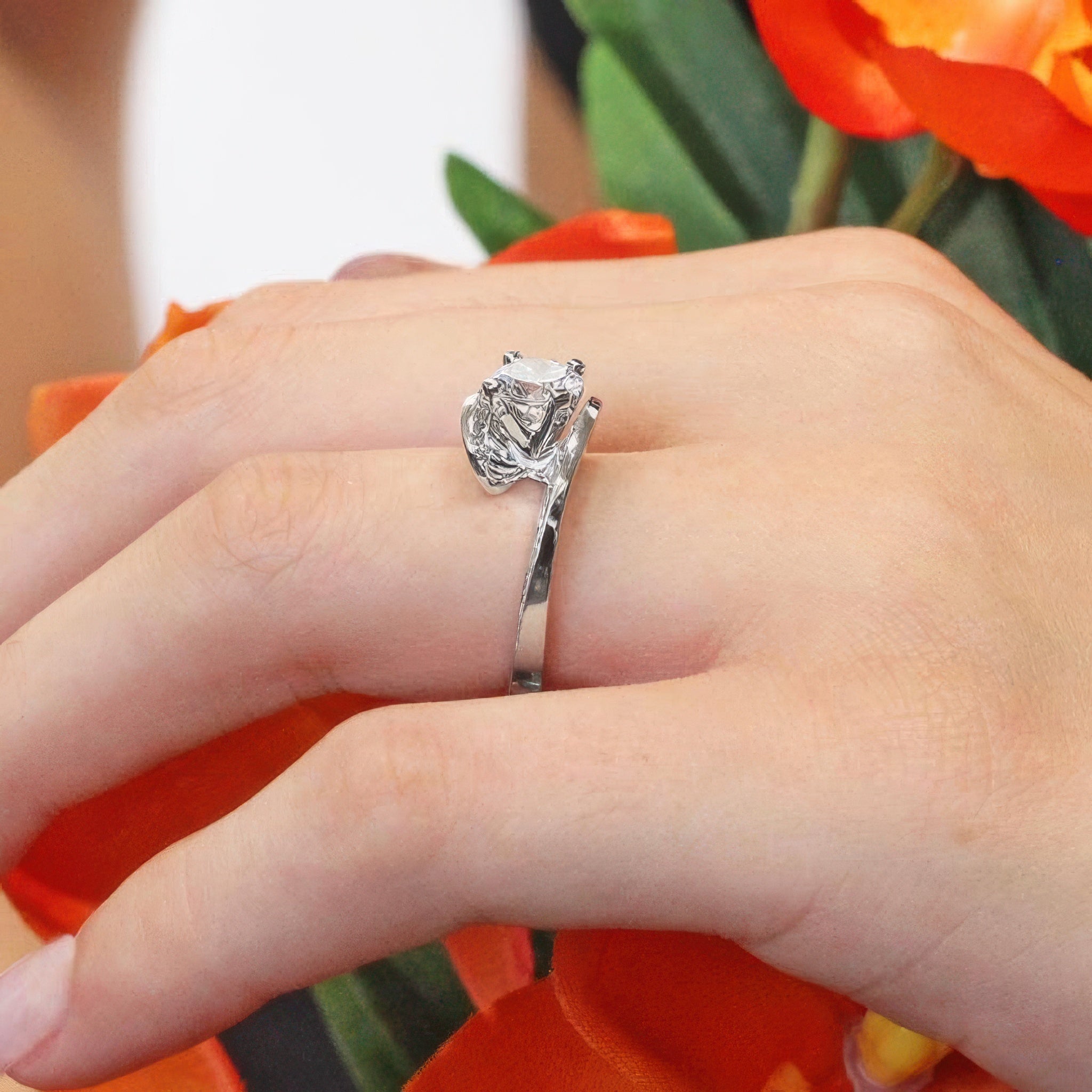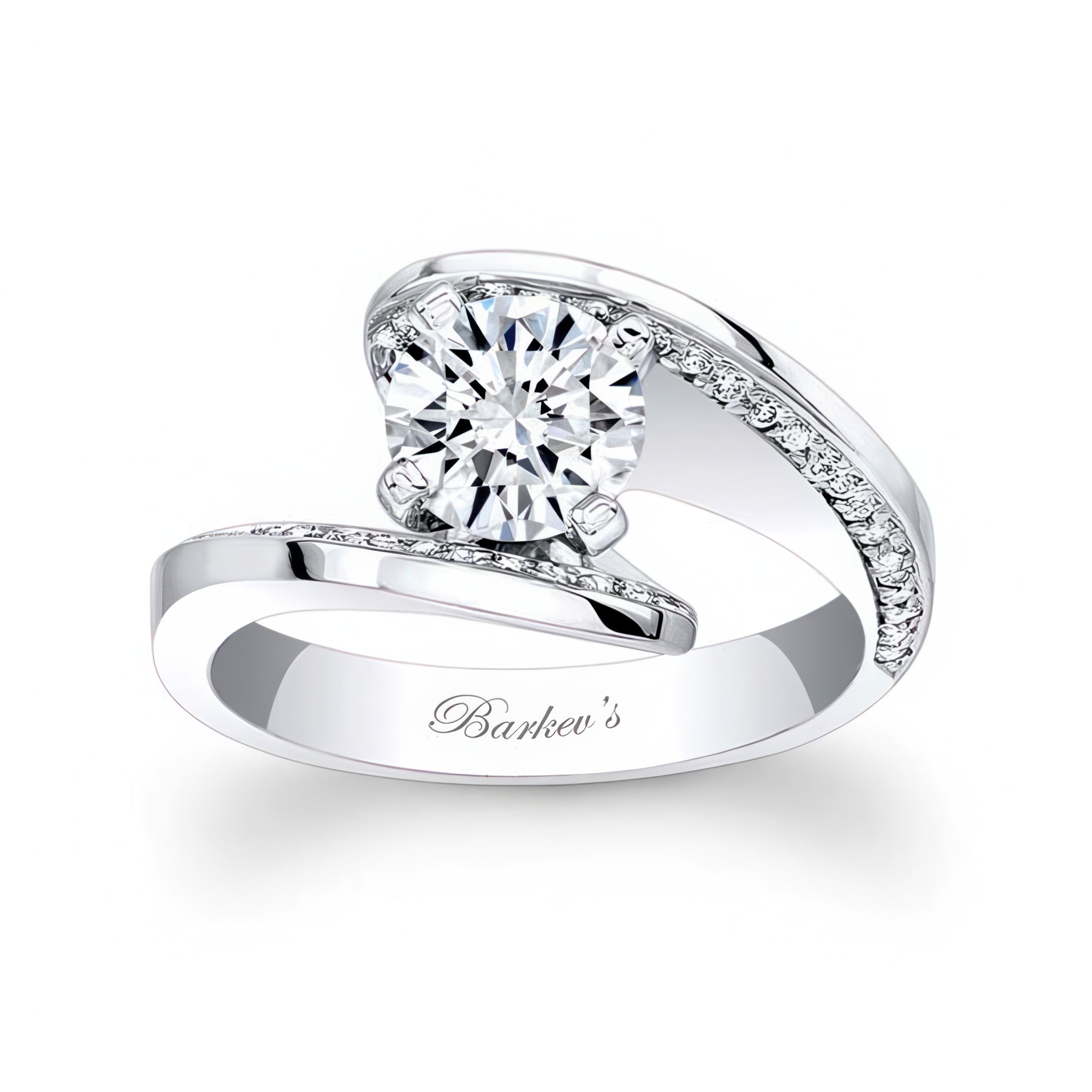 A bypass pave moissanite engagement ring featuring a prong set round center with pave set diamonds on the inner walls of the shank for a touch of drama.