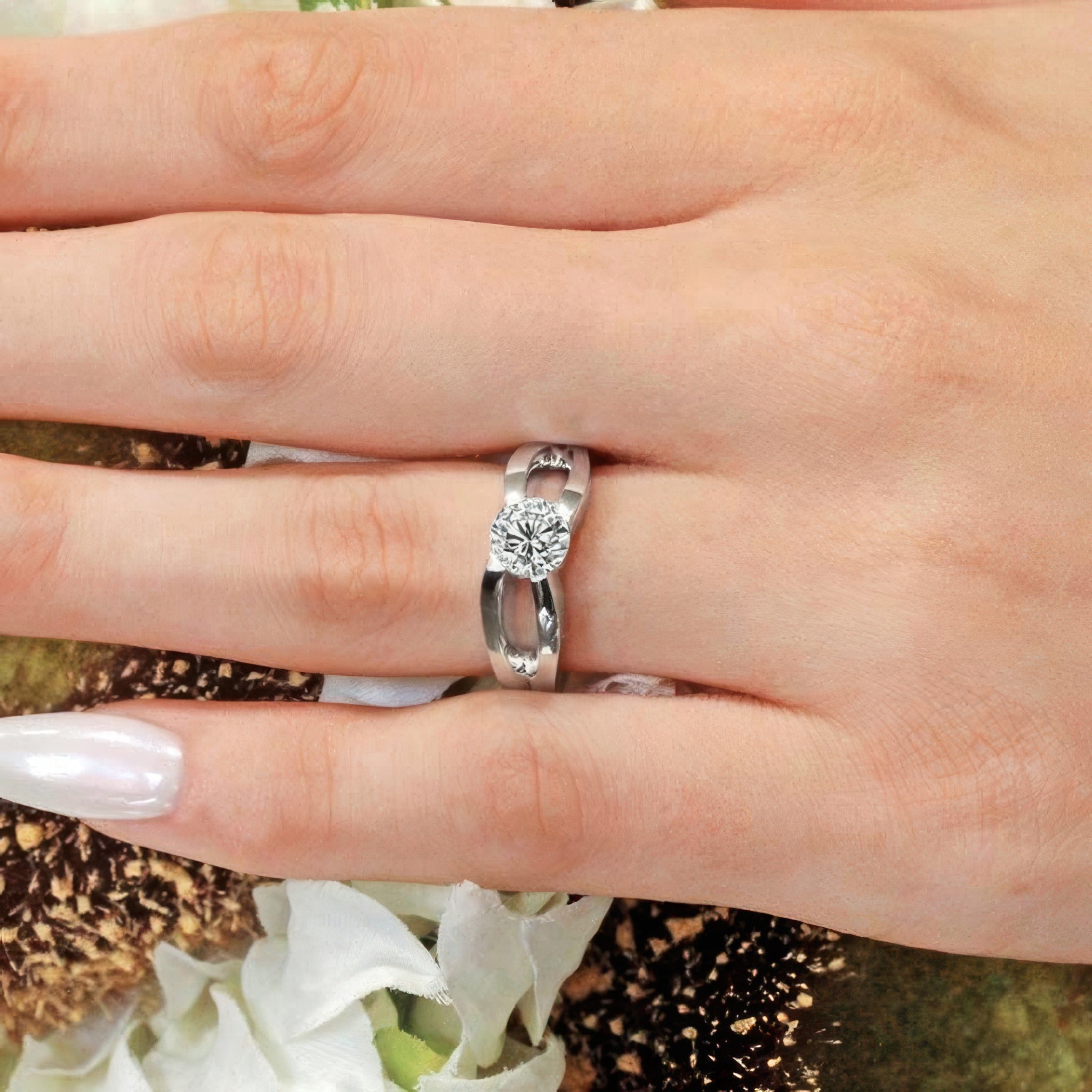 This channel set 1 ct moissanite solitaire ring features a low profile round center with a split shank and a hight polish finish for a unique look.
