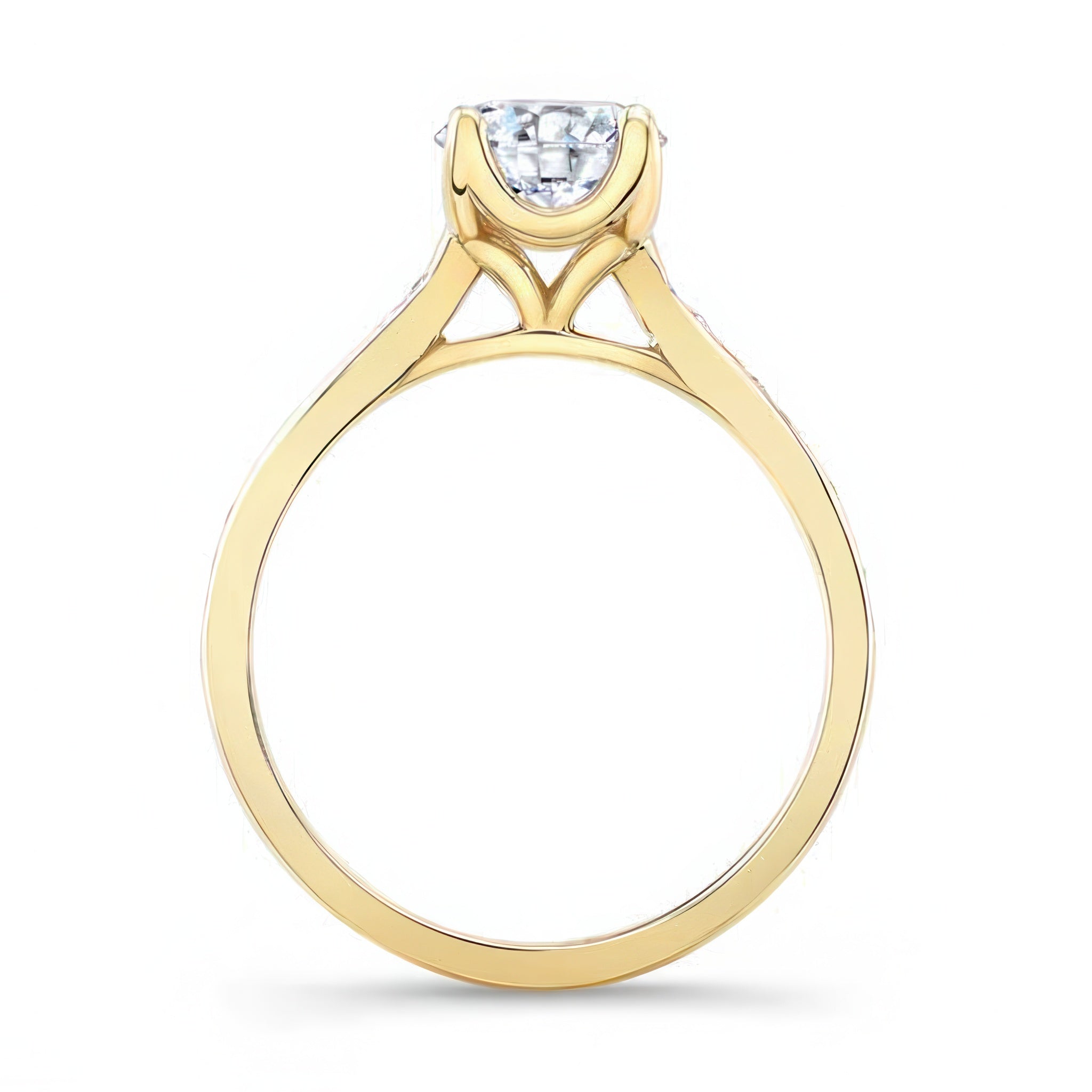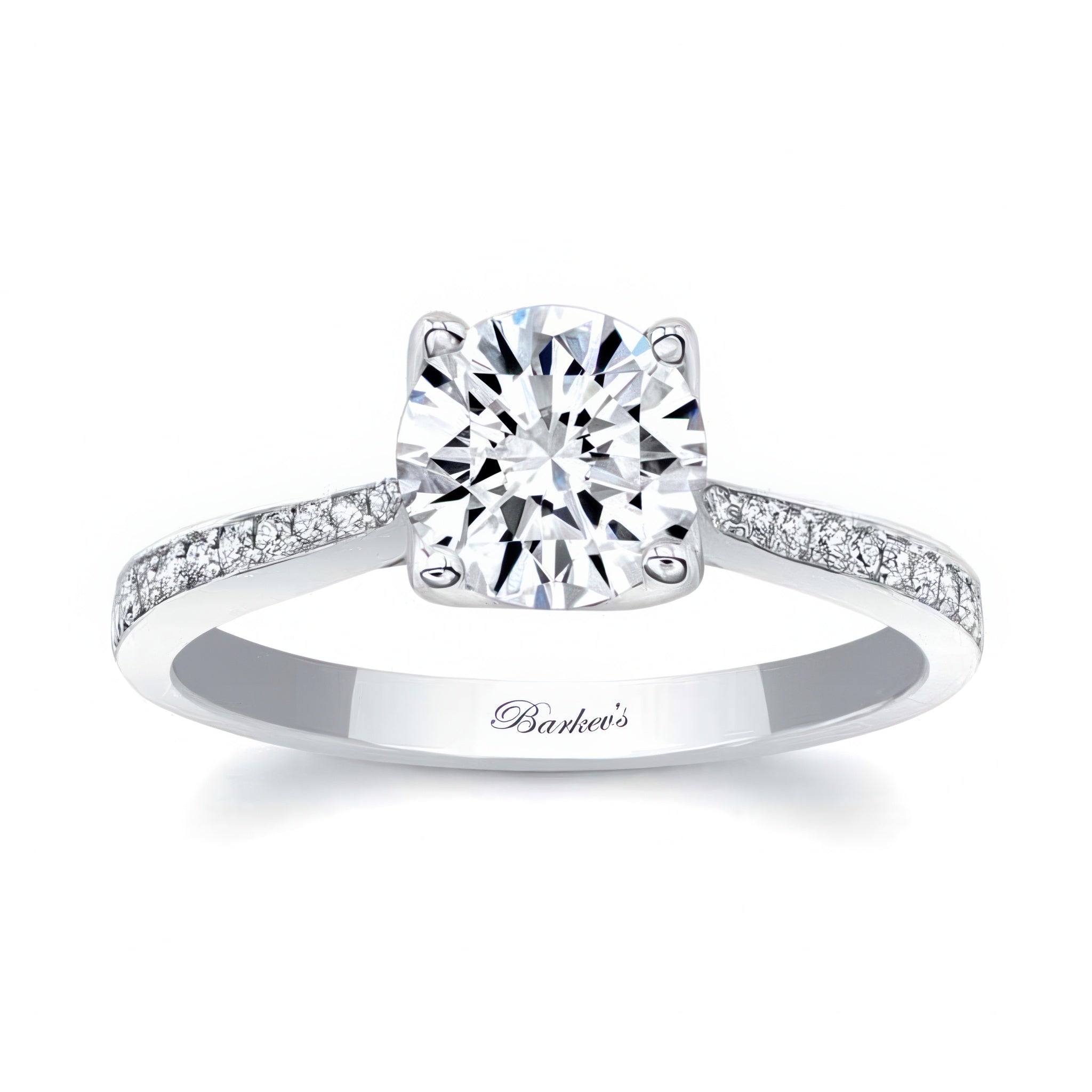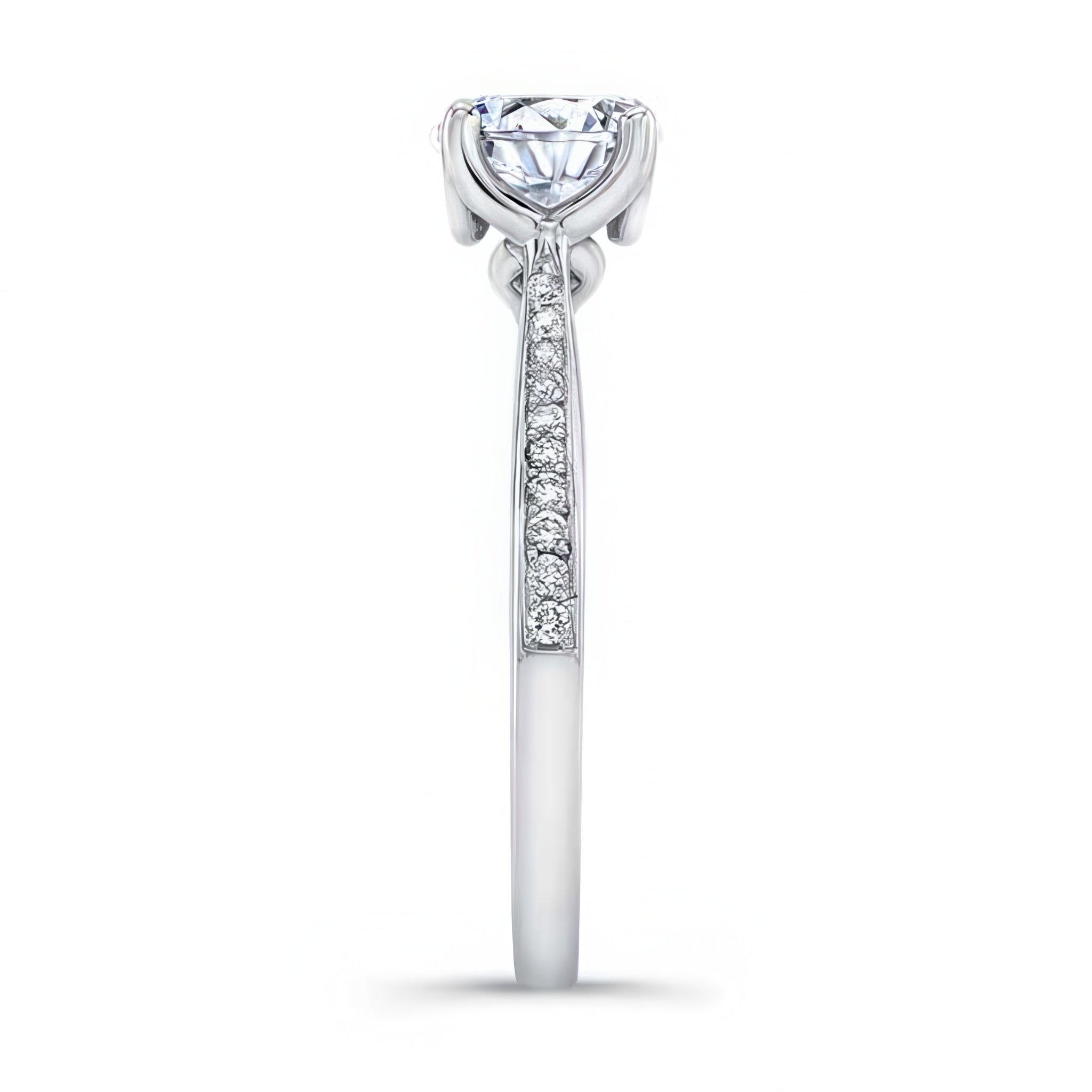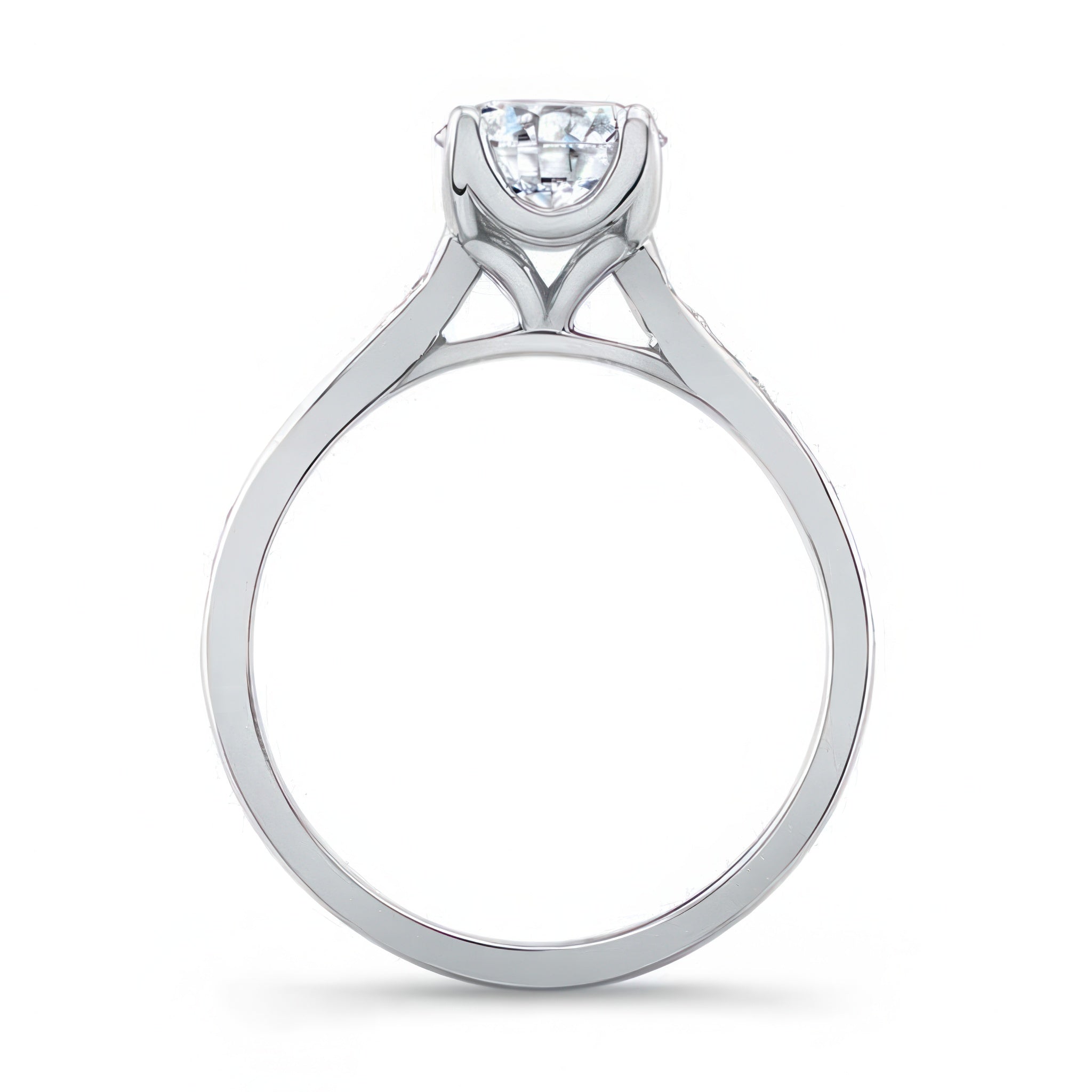 This classic moissanite engagement ring is graced with a delicate shank that meets the prong set round center with glamorous pave set diamonds on the sides adding a final touch of brilliance.