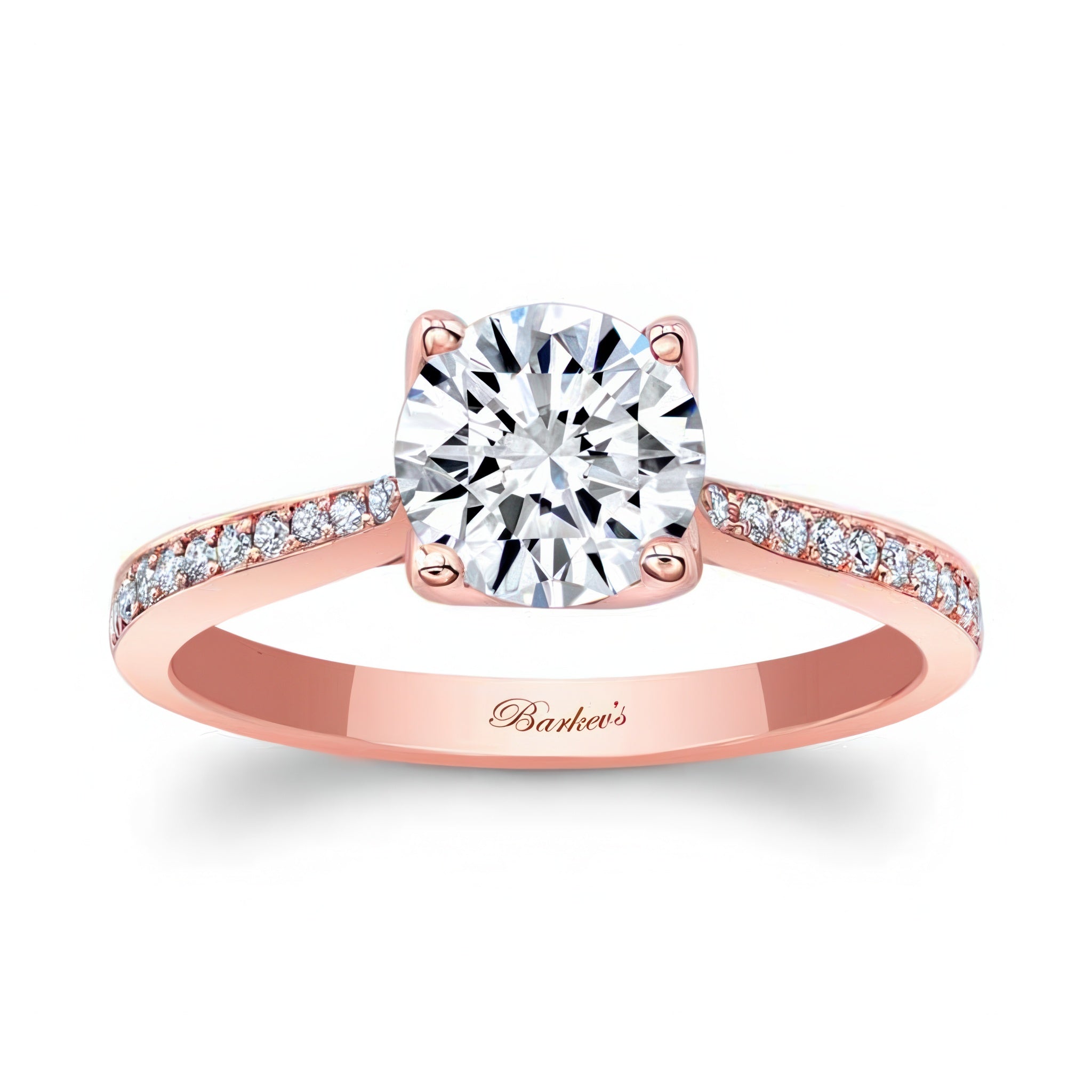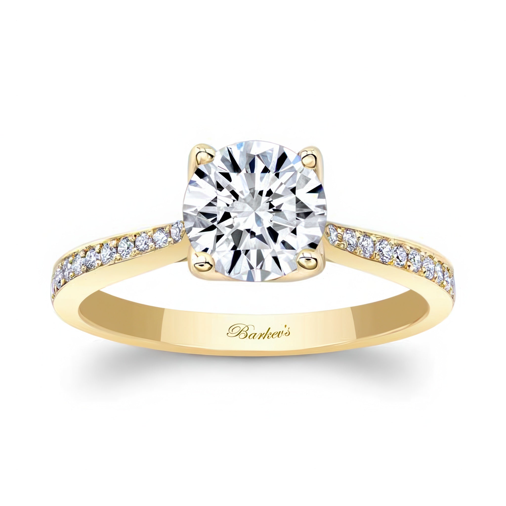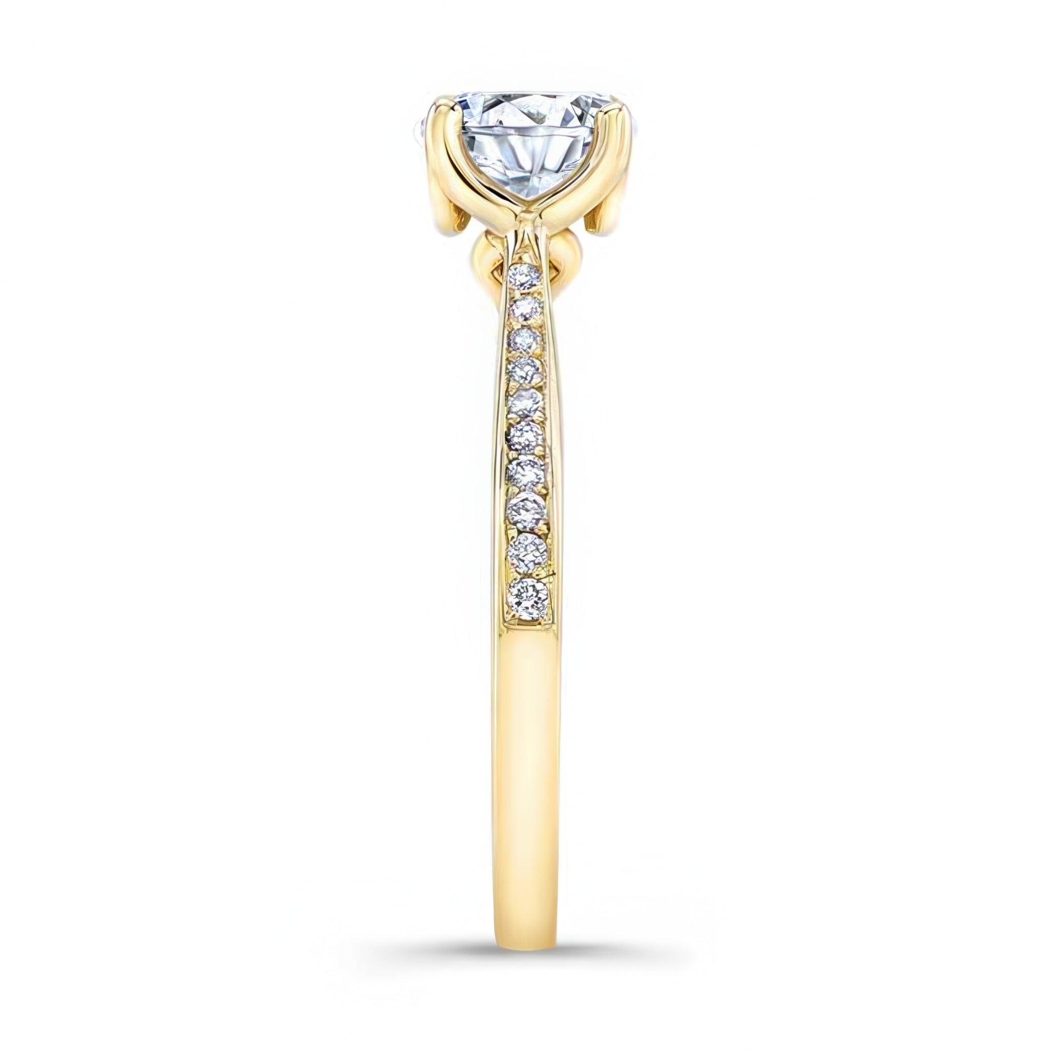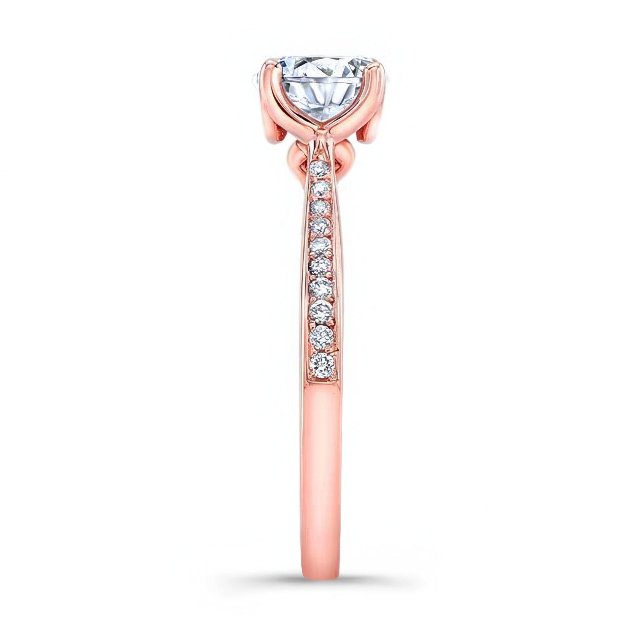 This classic moissanite engagement ring is graced with a delicate shank that meets the prong set round center with glamorous pave set diamonds on the sides adding a final touch of brilliance.