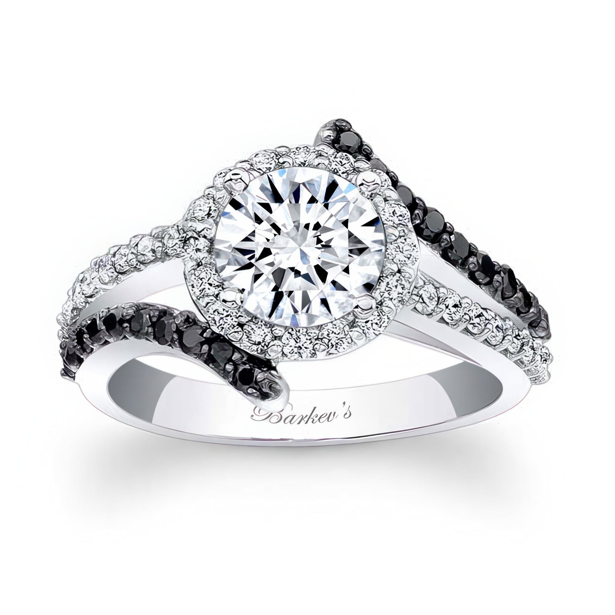 This contemporary black diamond accent moissanite engagement ring features a prong set round center encircled with a diamond halo and a split shank adorned with shared prong set black and white diamonds for an added touch of elegance.