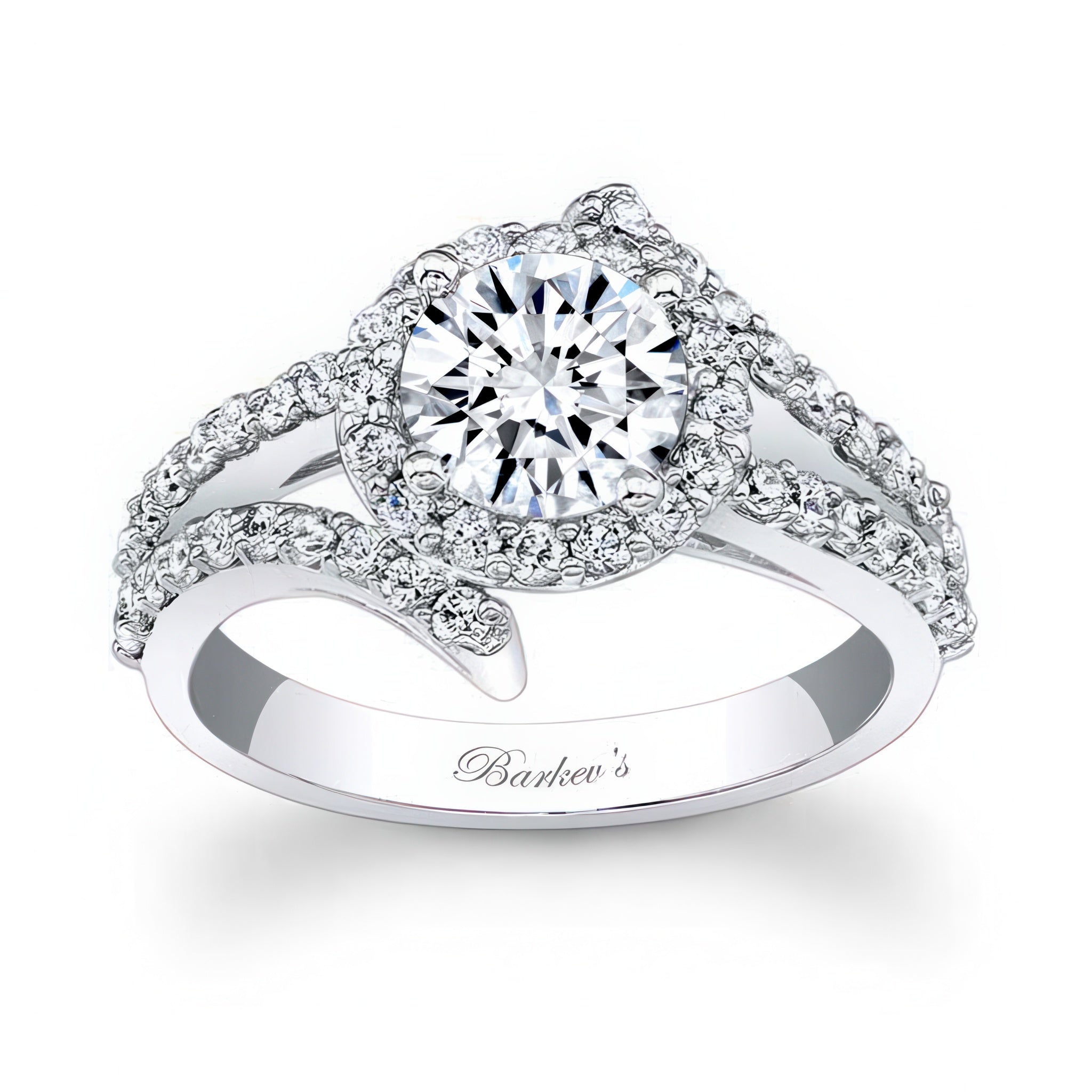 This contemporary moissanite engagement ring features a prong set round center encircled with a diamond halo and a split shank adorned with shared prong set diamonds for an added touch of elegance.