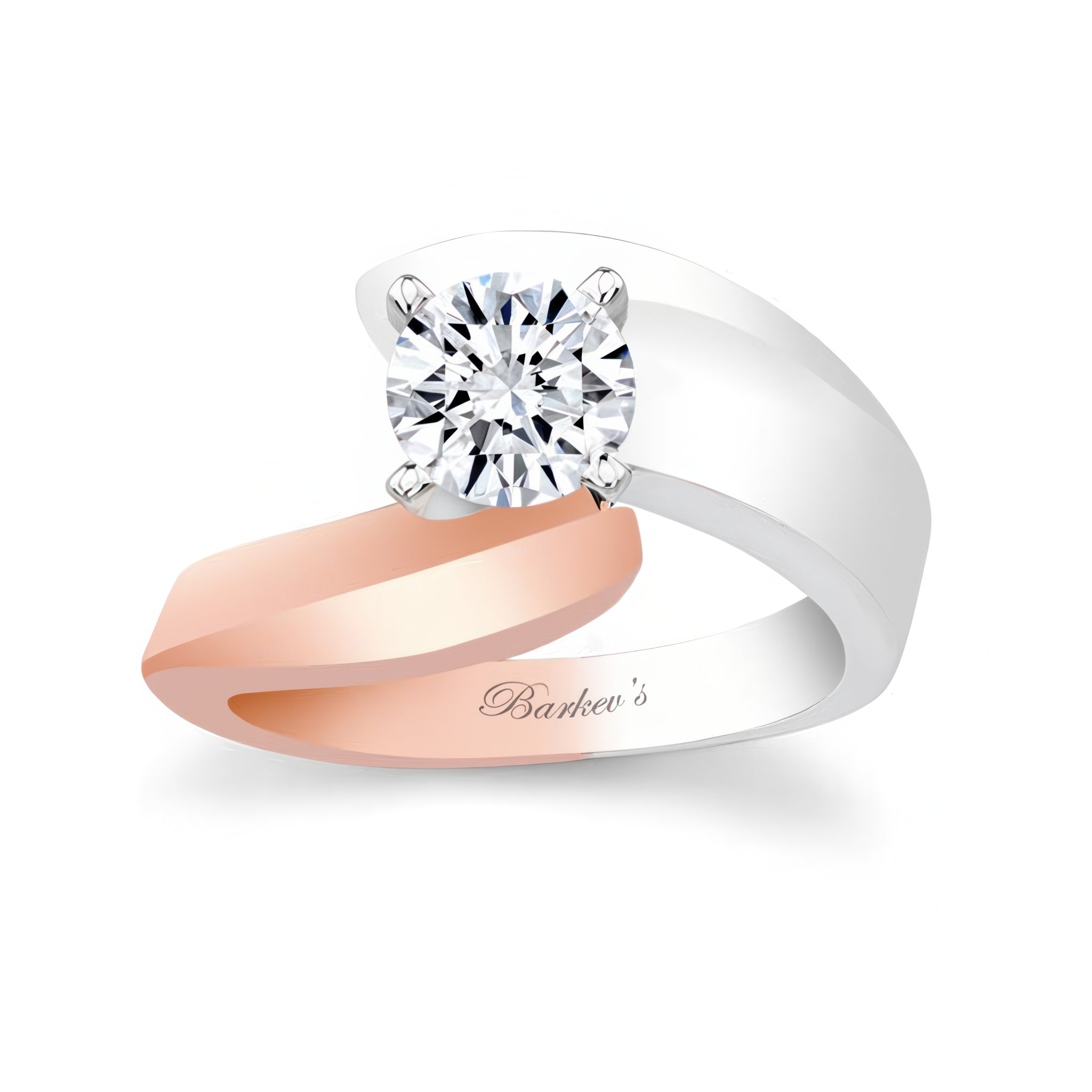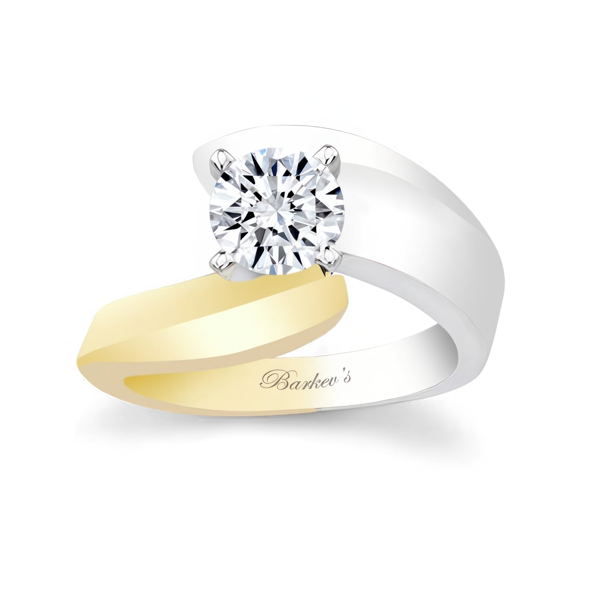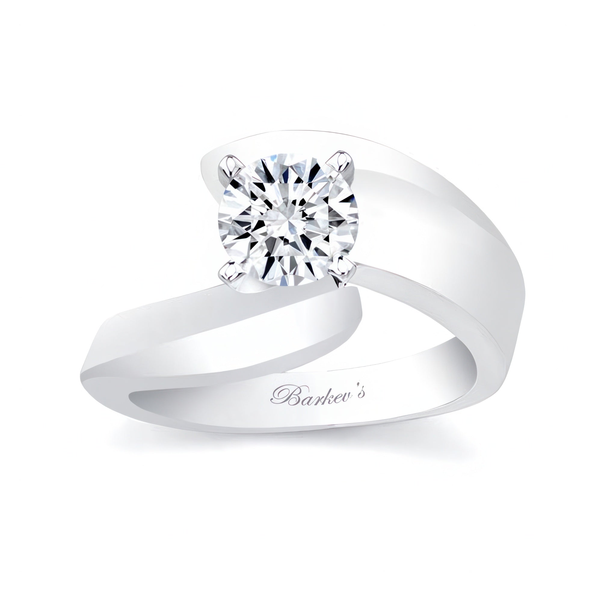 This curved solitaire moissanite ring sports a prong set round center with artfully curving shoulders and beveled edges for an added touch of elegance.
