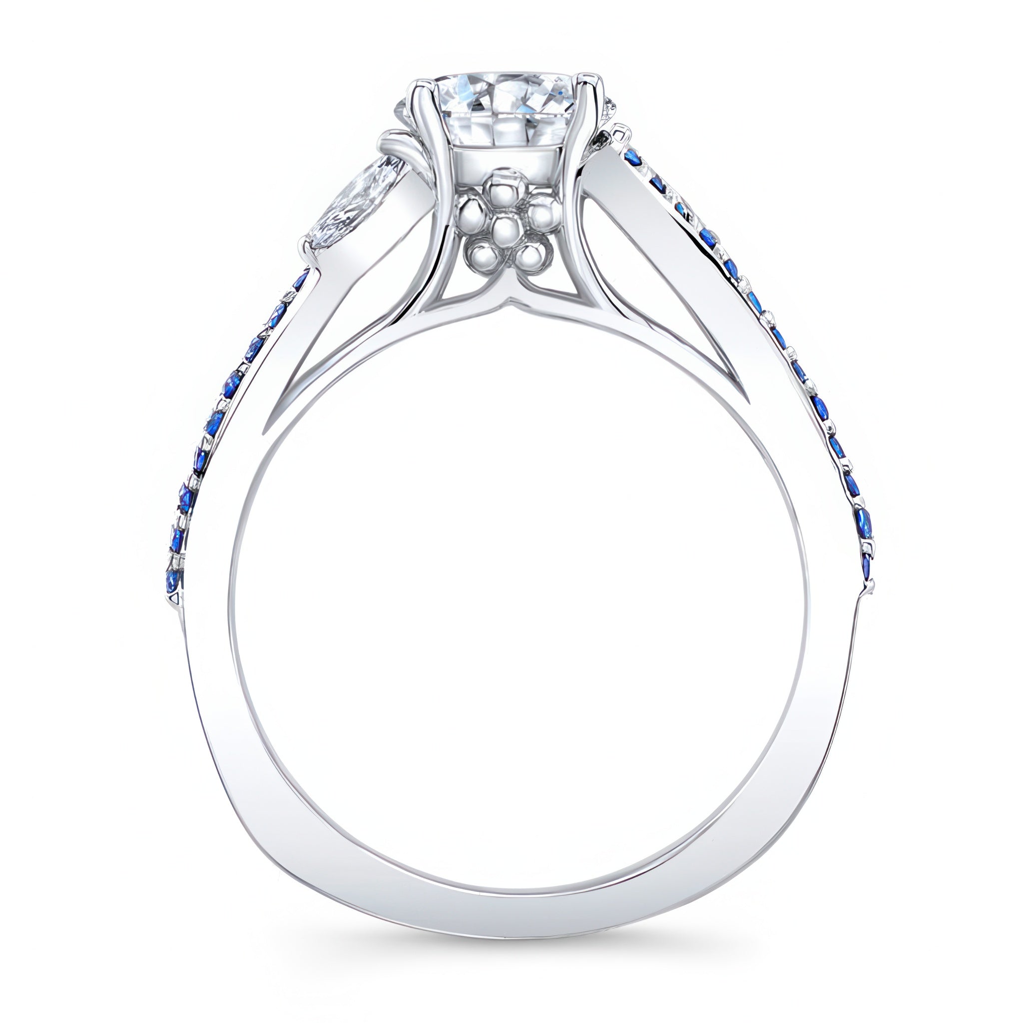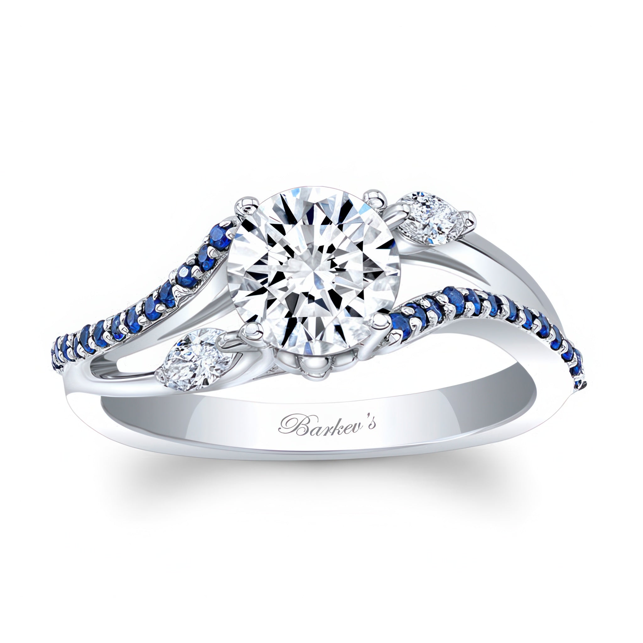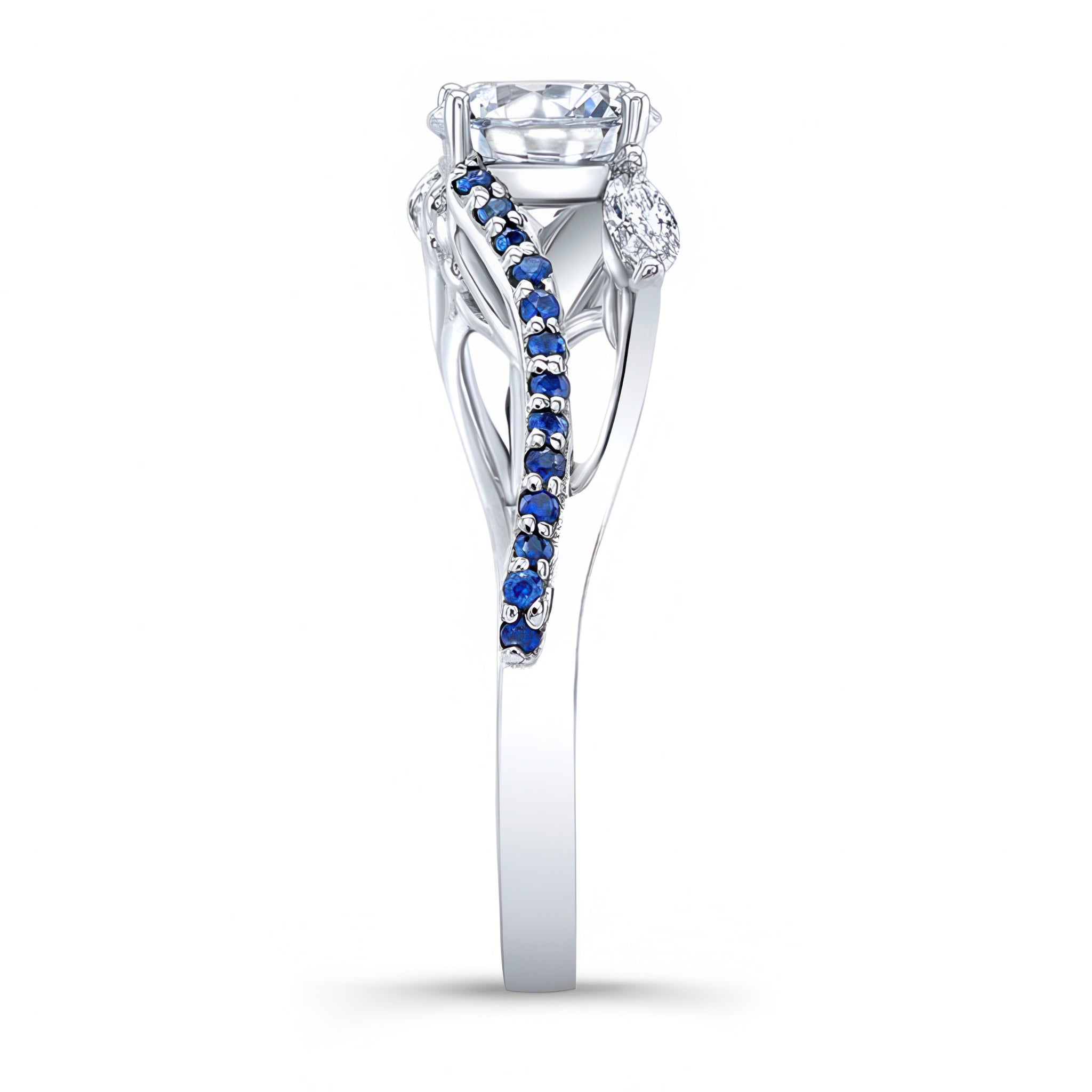Striking curved split shank moissanite sapphire accent ring featuring a prong set round center accented with white marquise cut diamonds and shared prong set blue sapphires flanking the split shoulders for a unique flare.