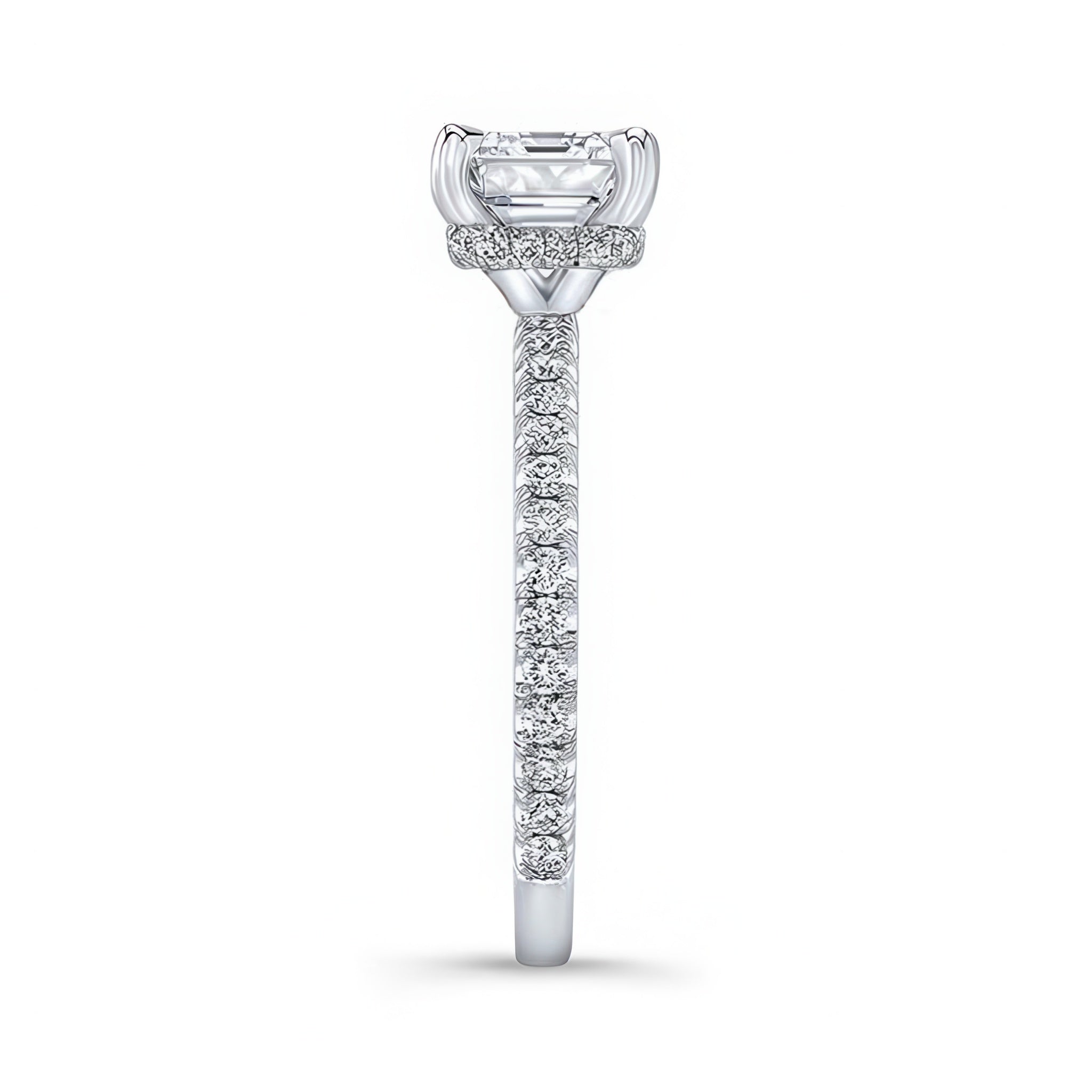 This extravagant asscher cut moissanite engagement ring will have people in awe. Underneath the center stone, lies a hidden halo, followed by beautiful, shared prong set diamonds flowing down the shank, exhibiting true elegance all around.