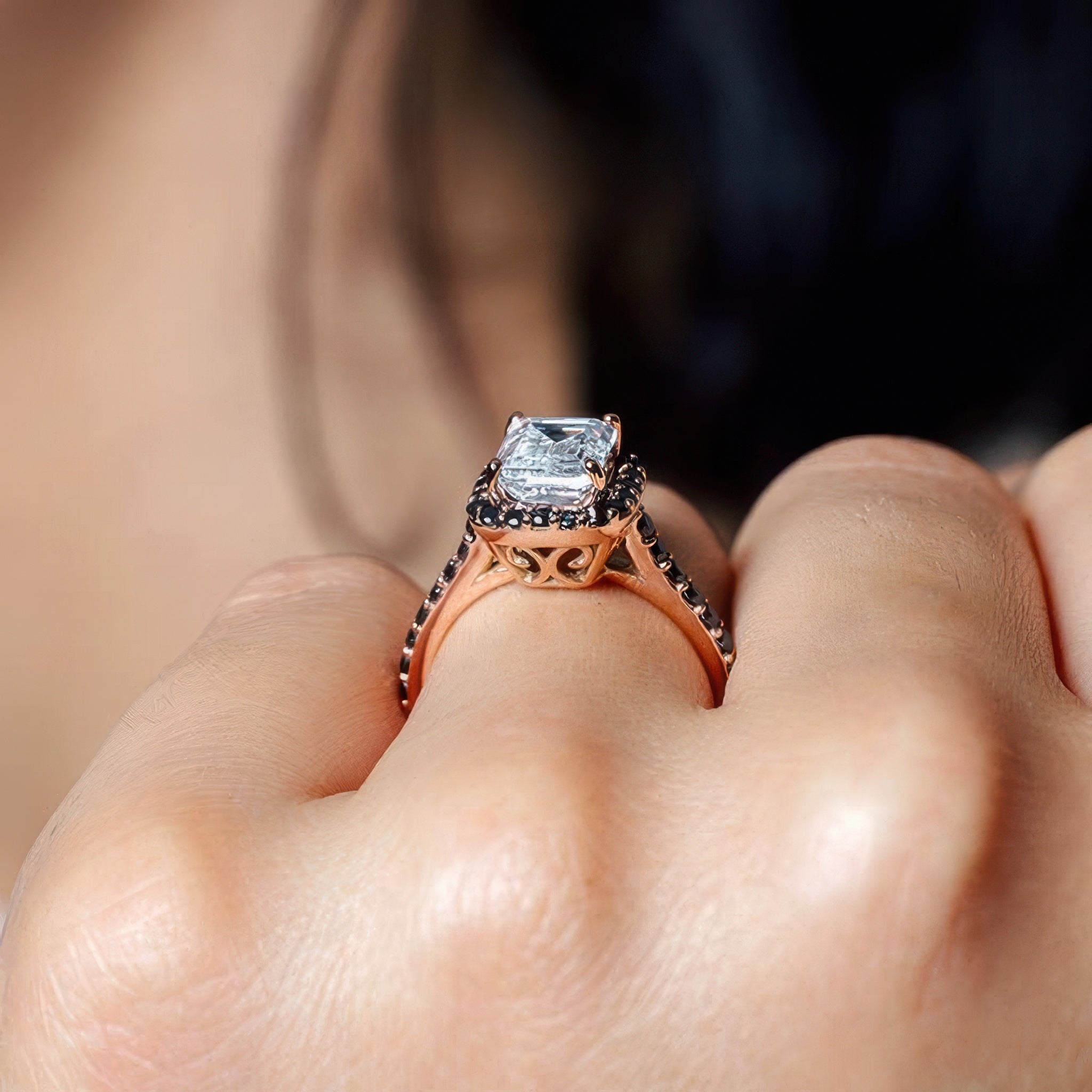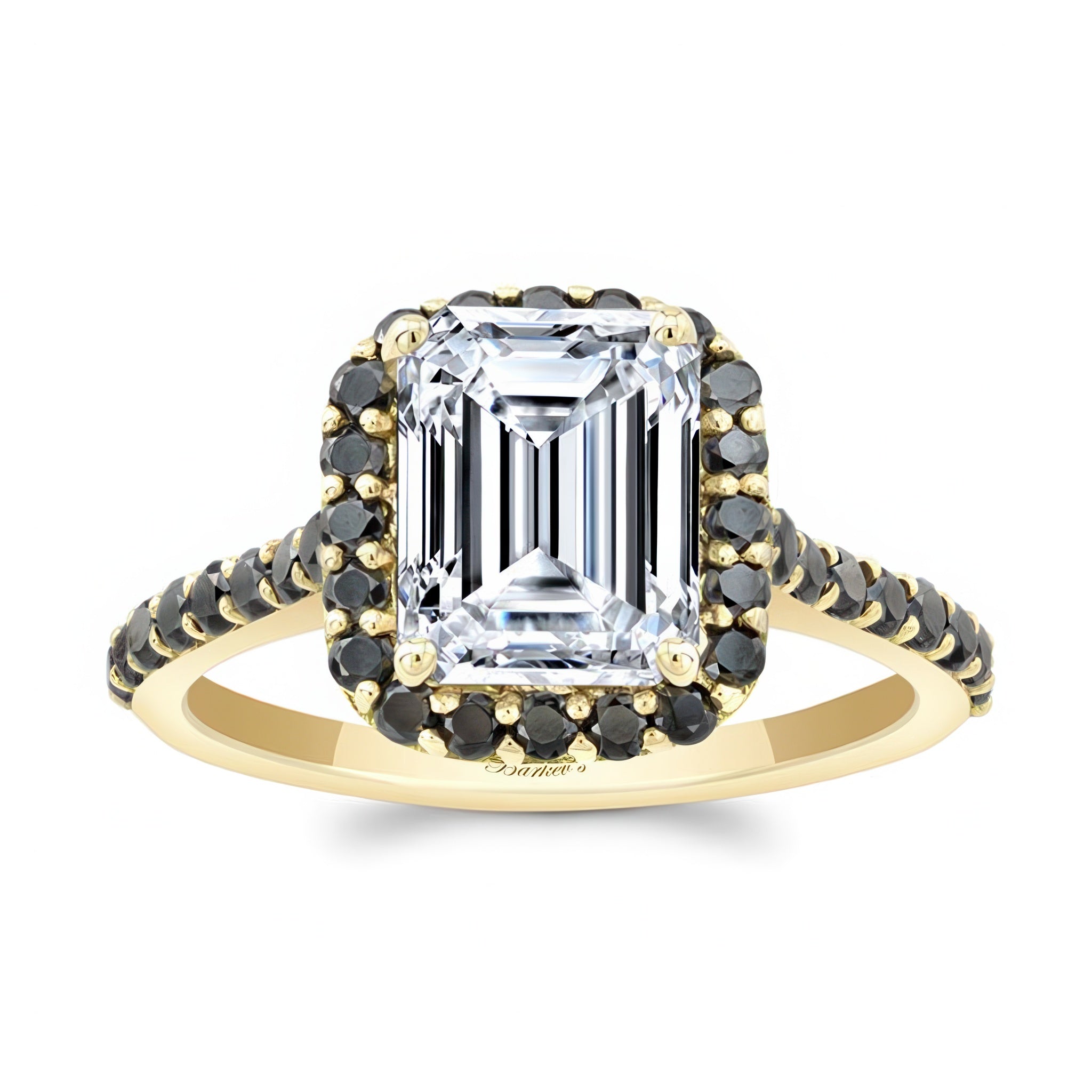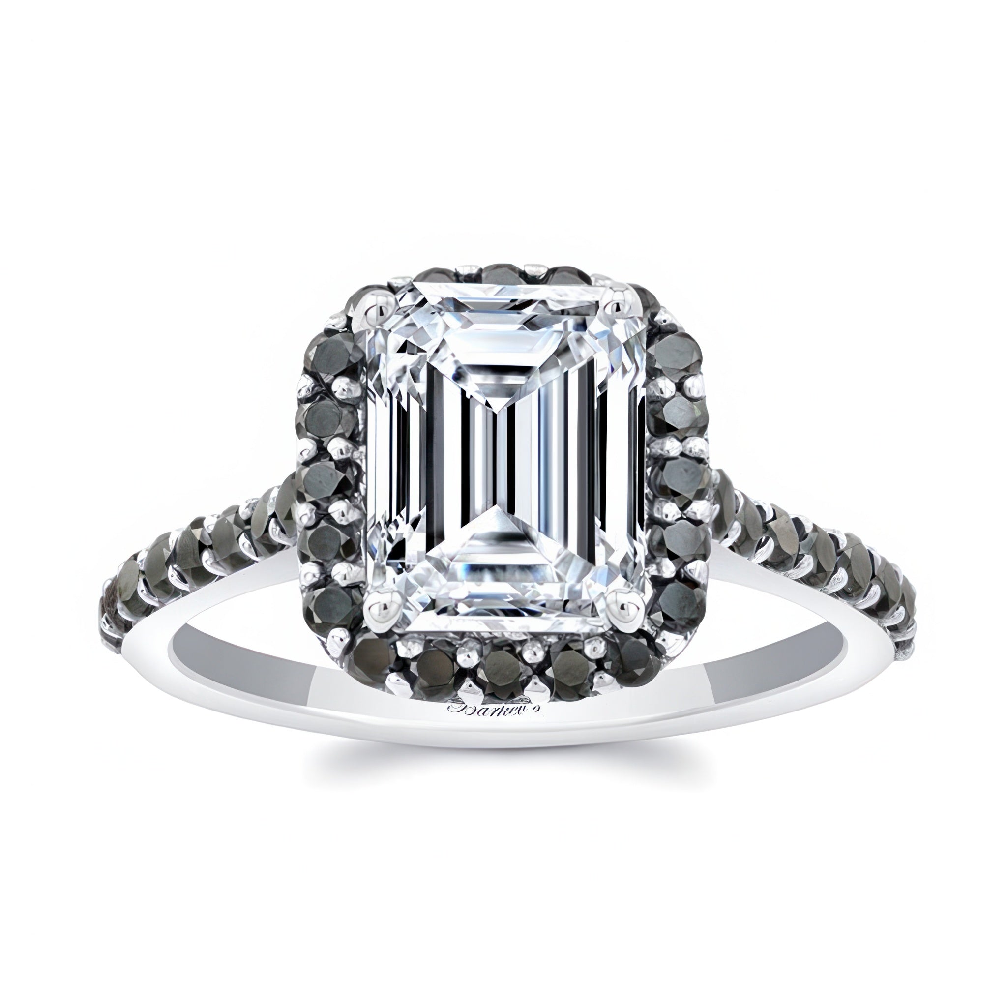 Emerald Cut Moissanite Halo Ring With Black Diamonds