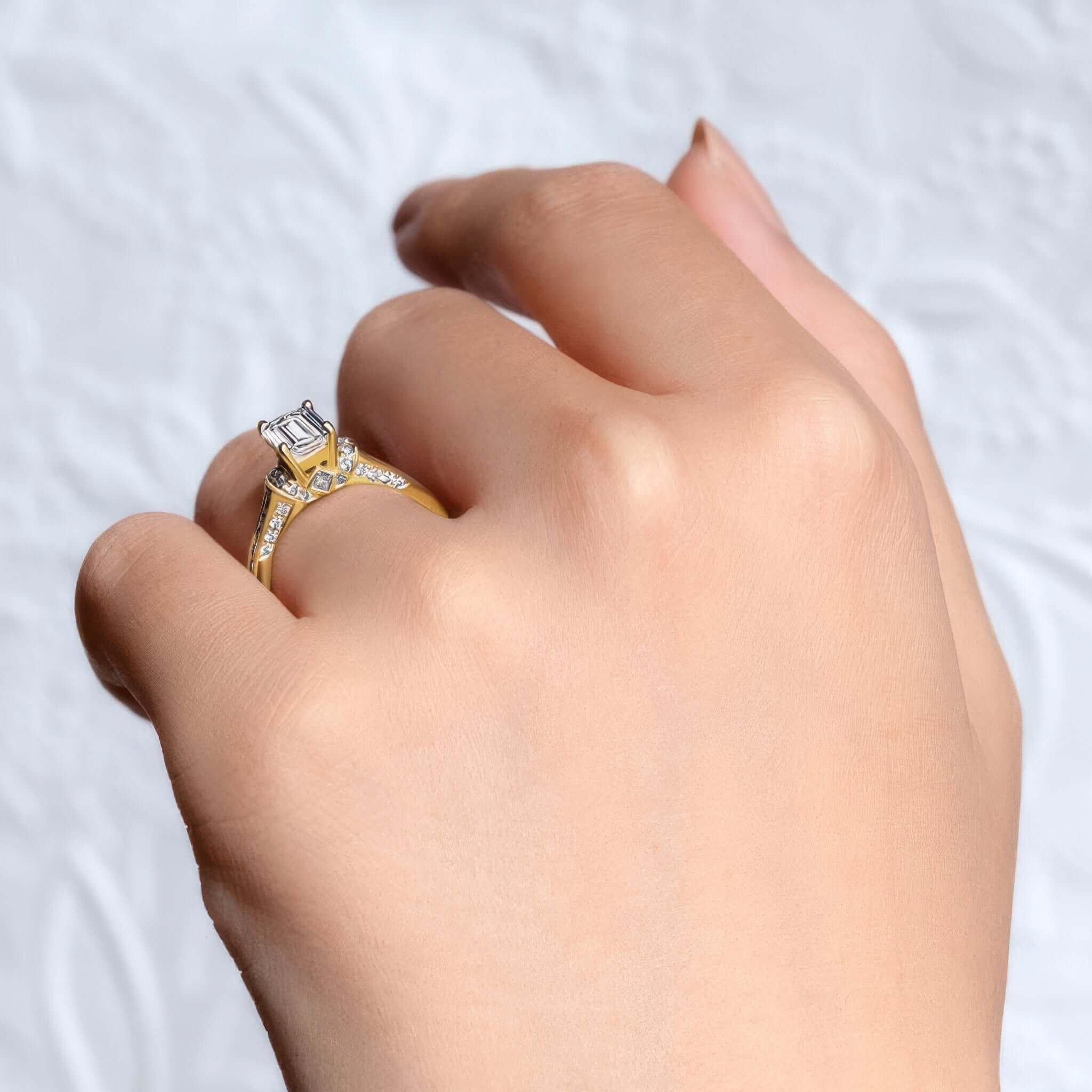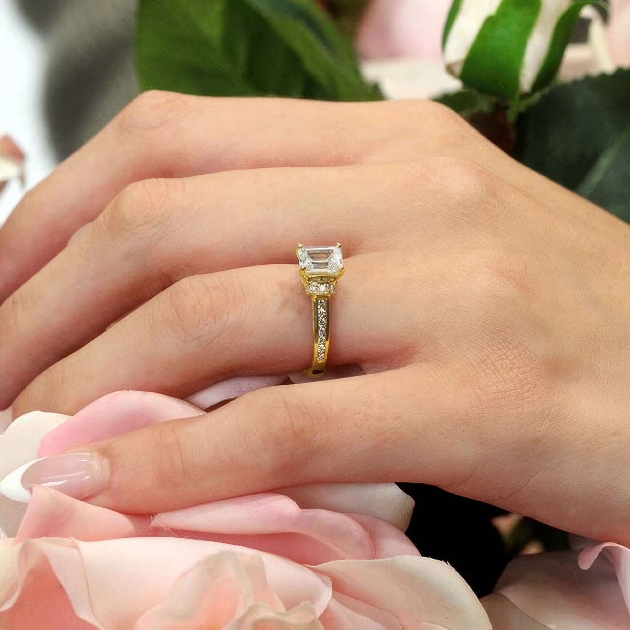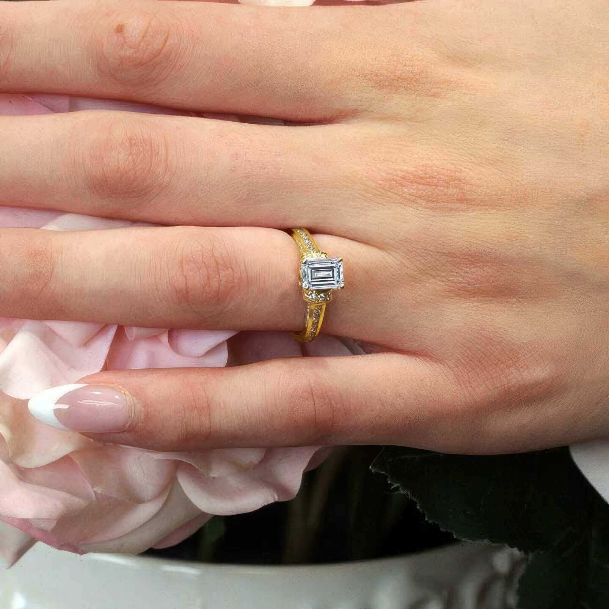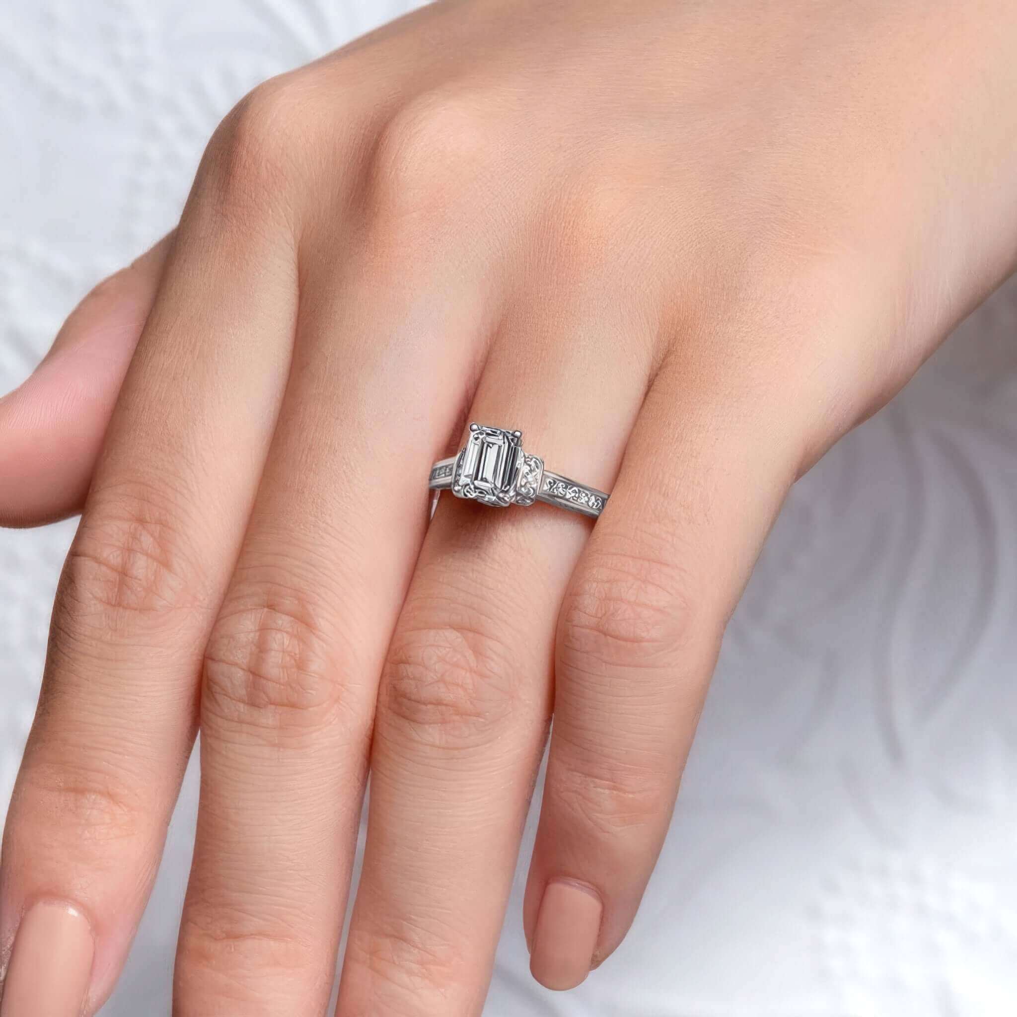 A stunning emerald cut moissanite ring featuring a unique design with channel and pave set round diamonds and 2 smaller bezel set princess cut diamonds all flanking the 1 carat center stone.