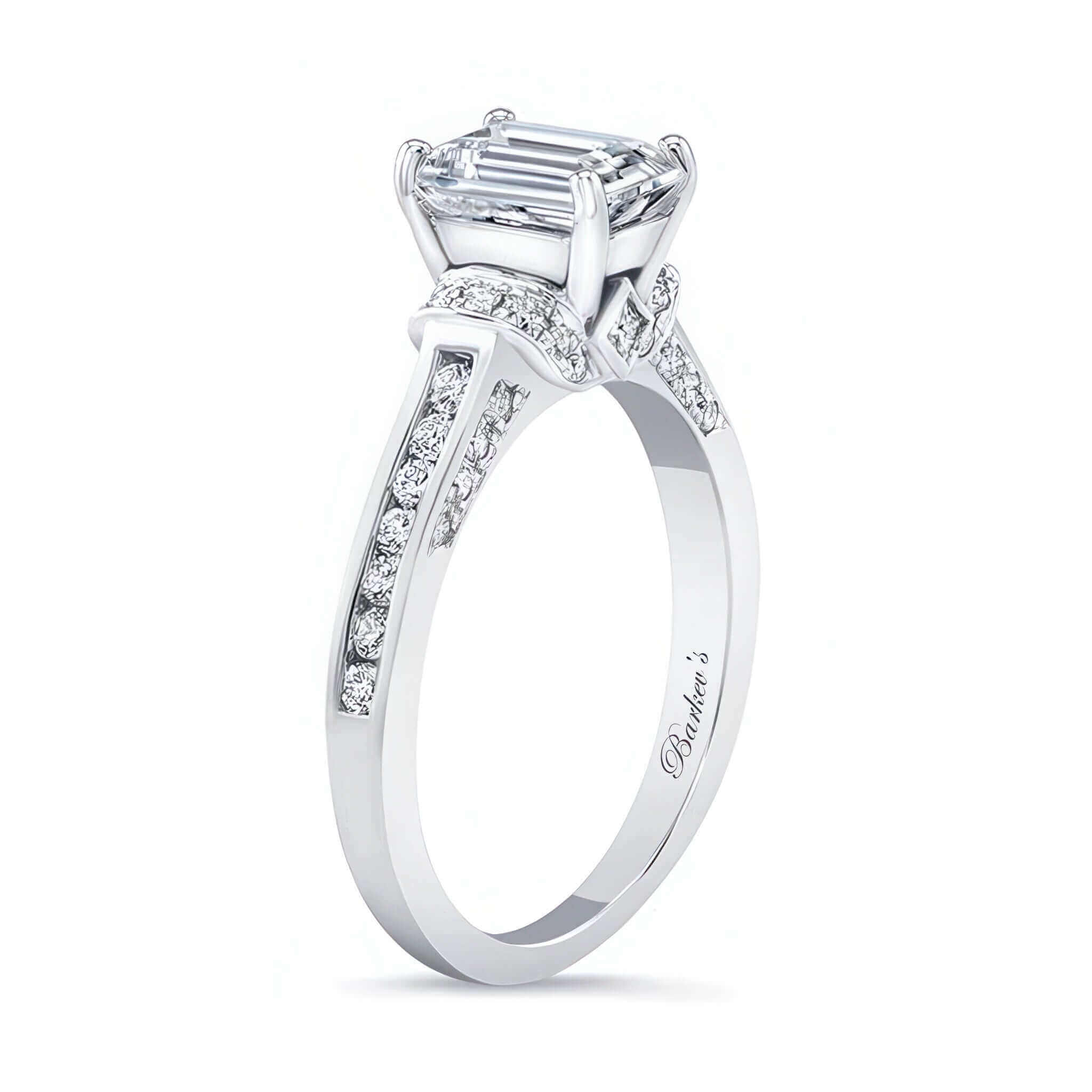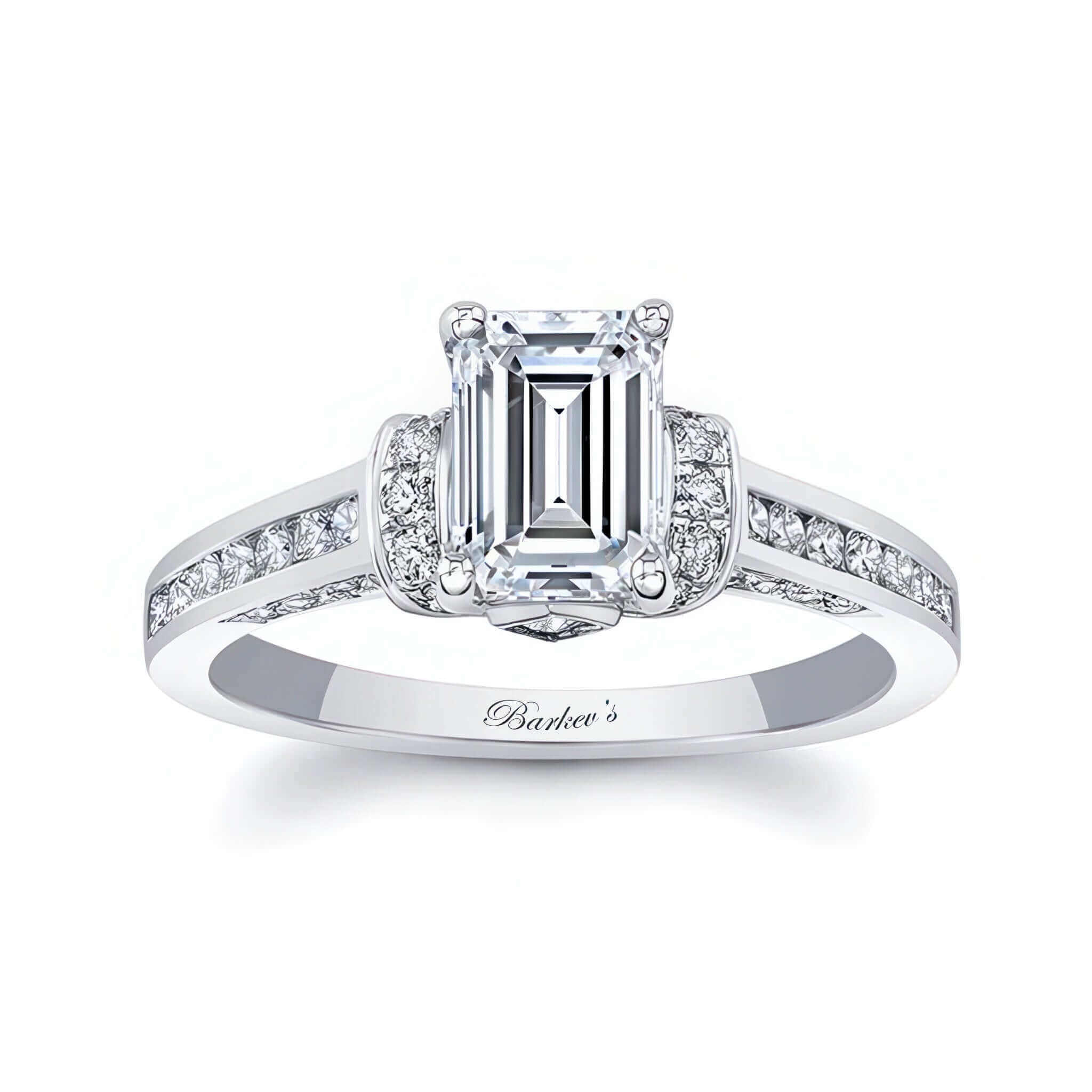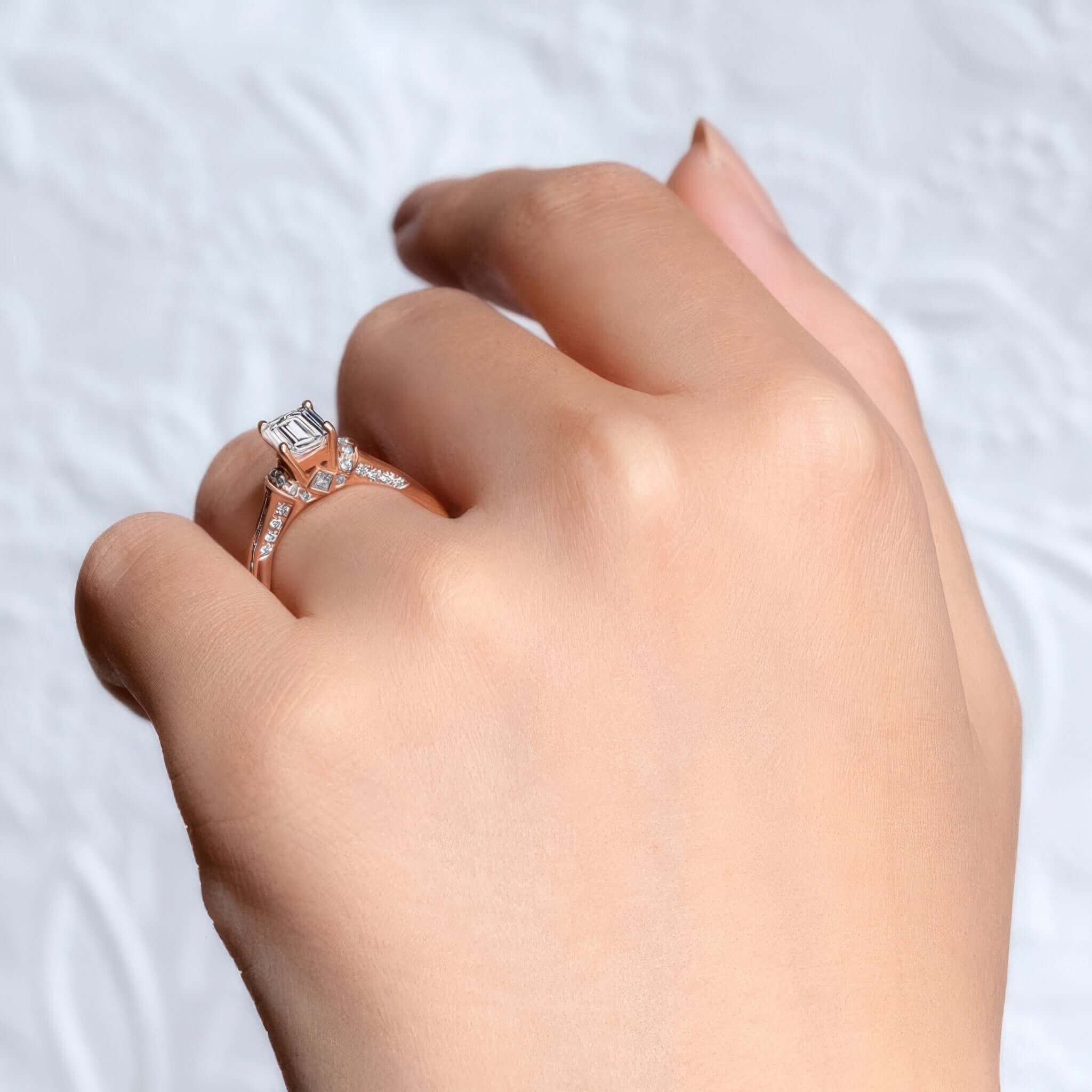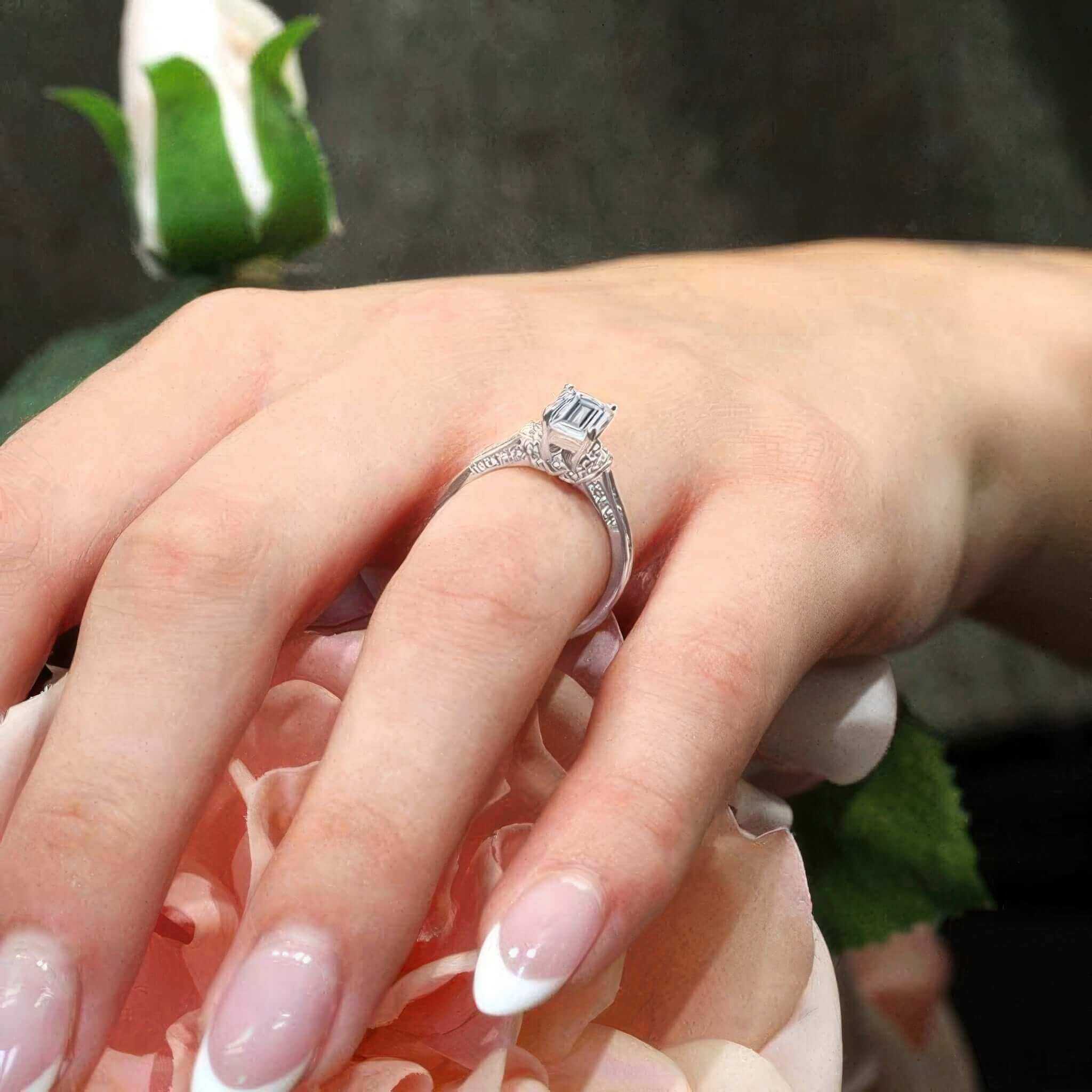 A stunning emerald cut moissanite ring featuring a unique design with channel and pave set round diamonds and 2 smaller bezel set princess cut diamonds all flanking the 1 carat center stone.