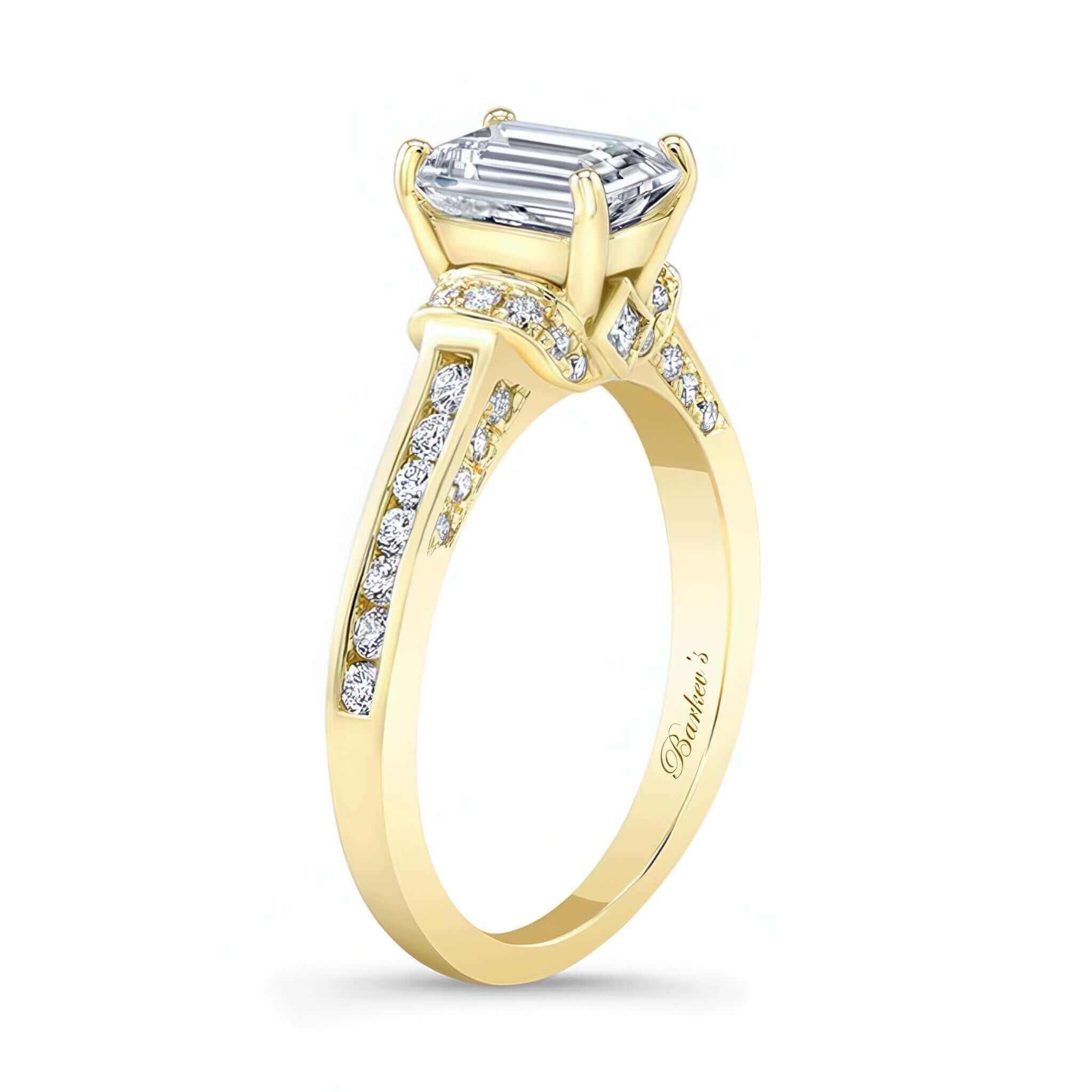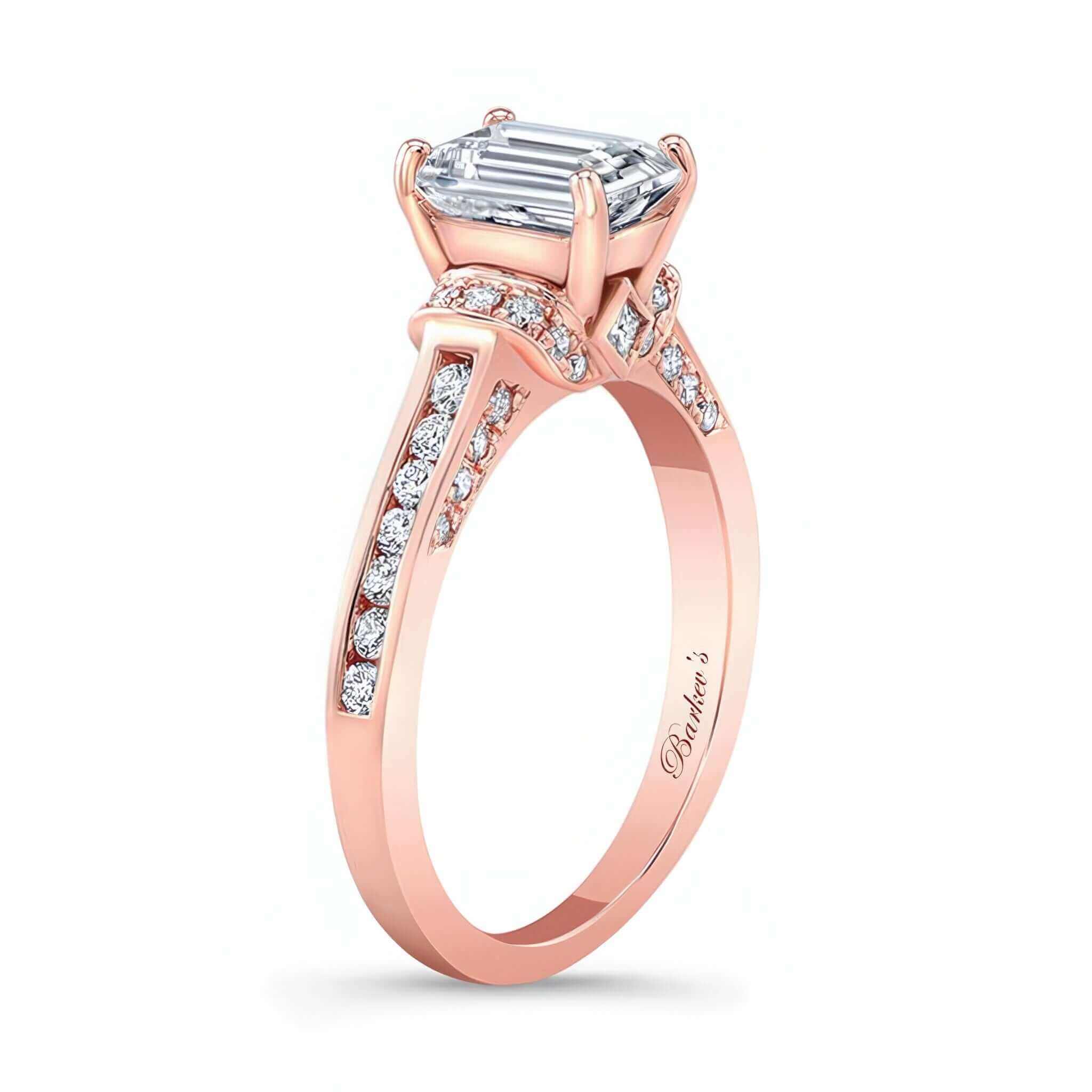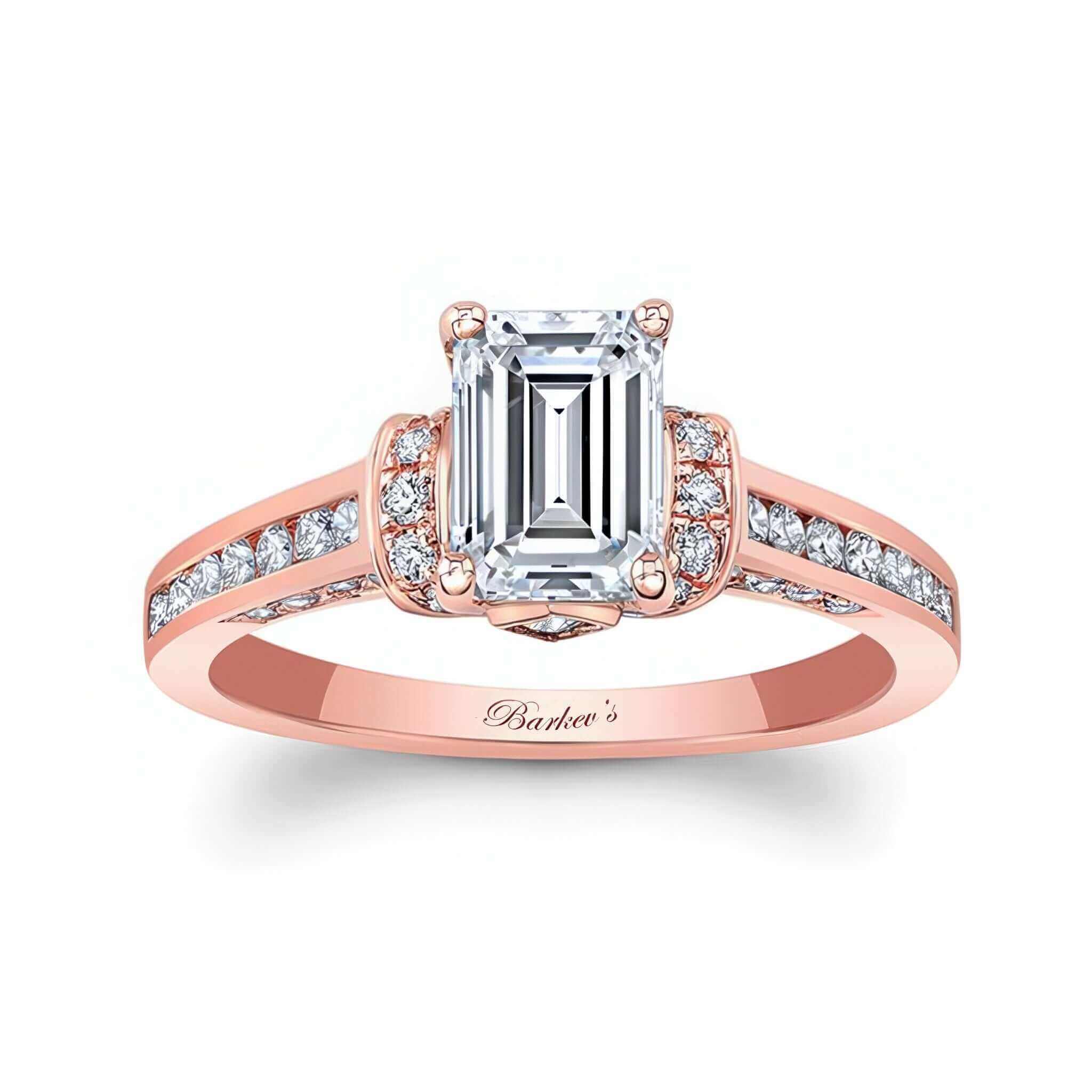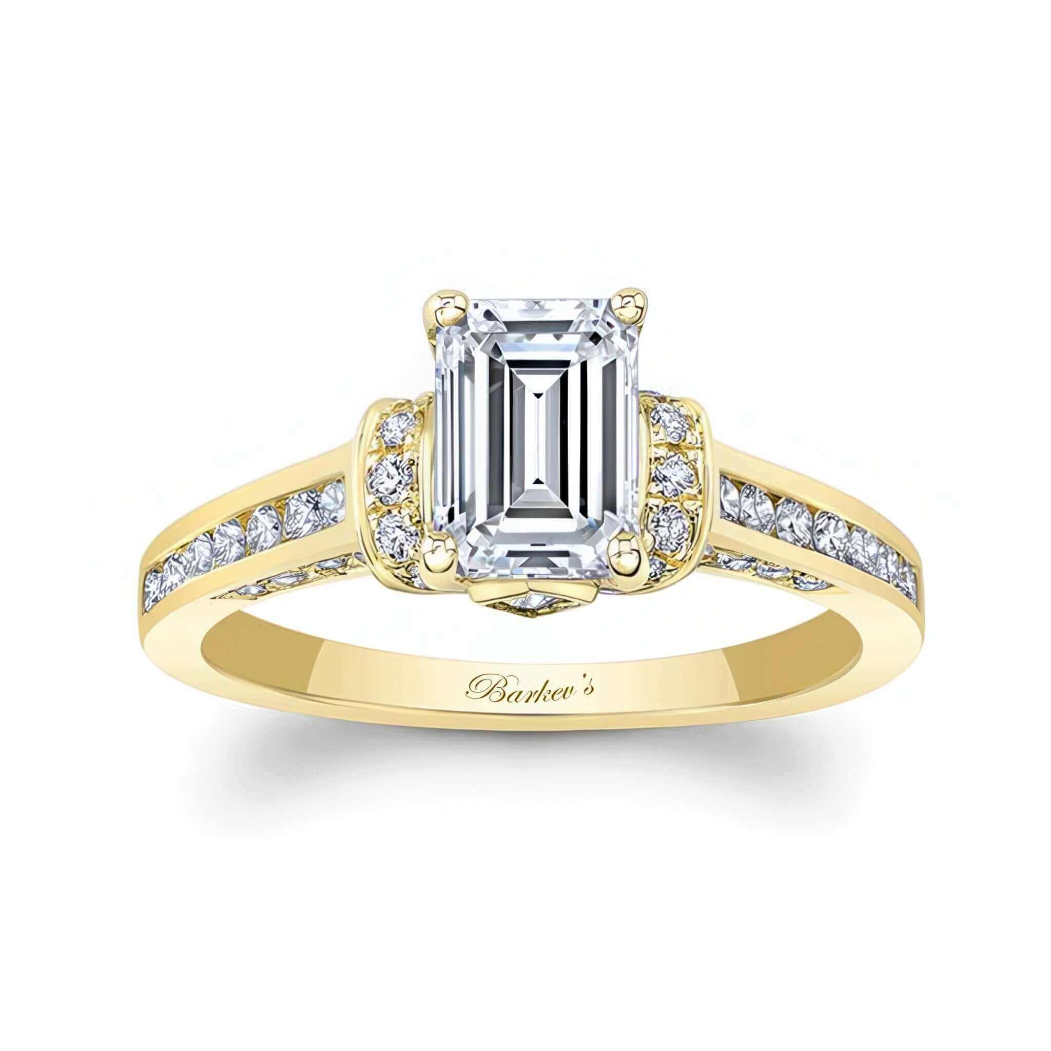 A stunning emerald cut moissanite ring featuring a unique design with channel and pave set round diamonds and 2 smaller bezel set princess cut diamonds all flanking the 1 carat center stone.