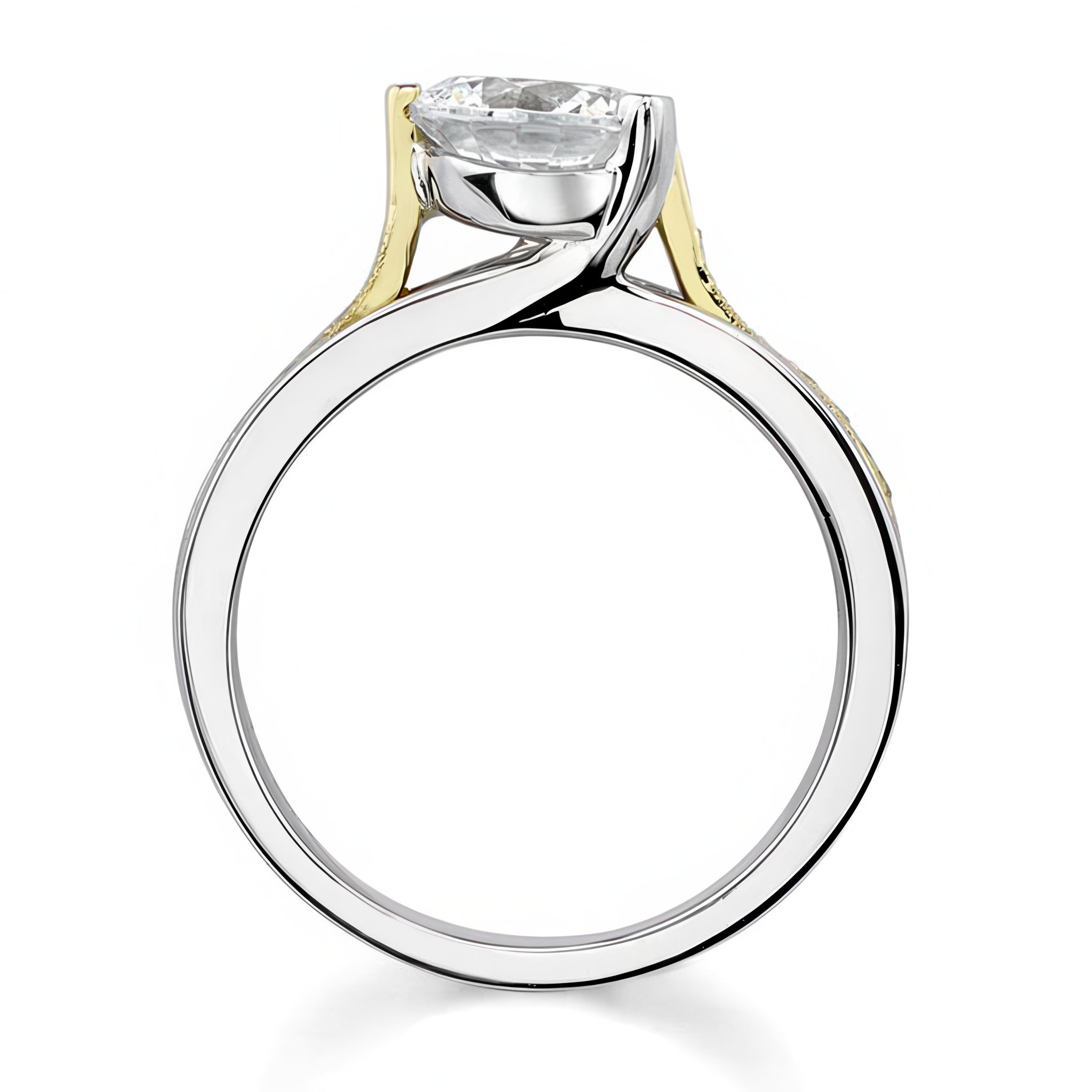 This fancy yellow diamond moissanite ring features a three prong center with a white gold shank and a yellow gold center trim adorned with pave set fancy yellow diamonds and a milgrain finish for an elegant touch.