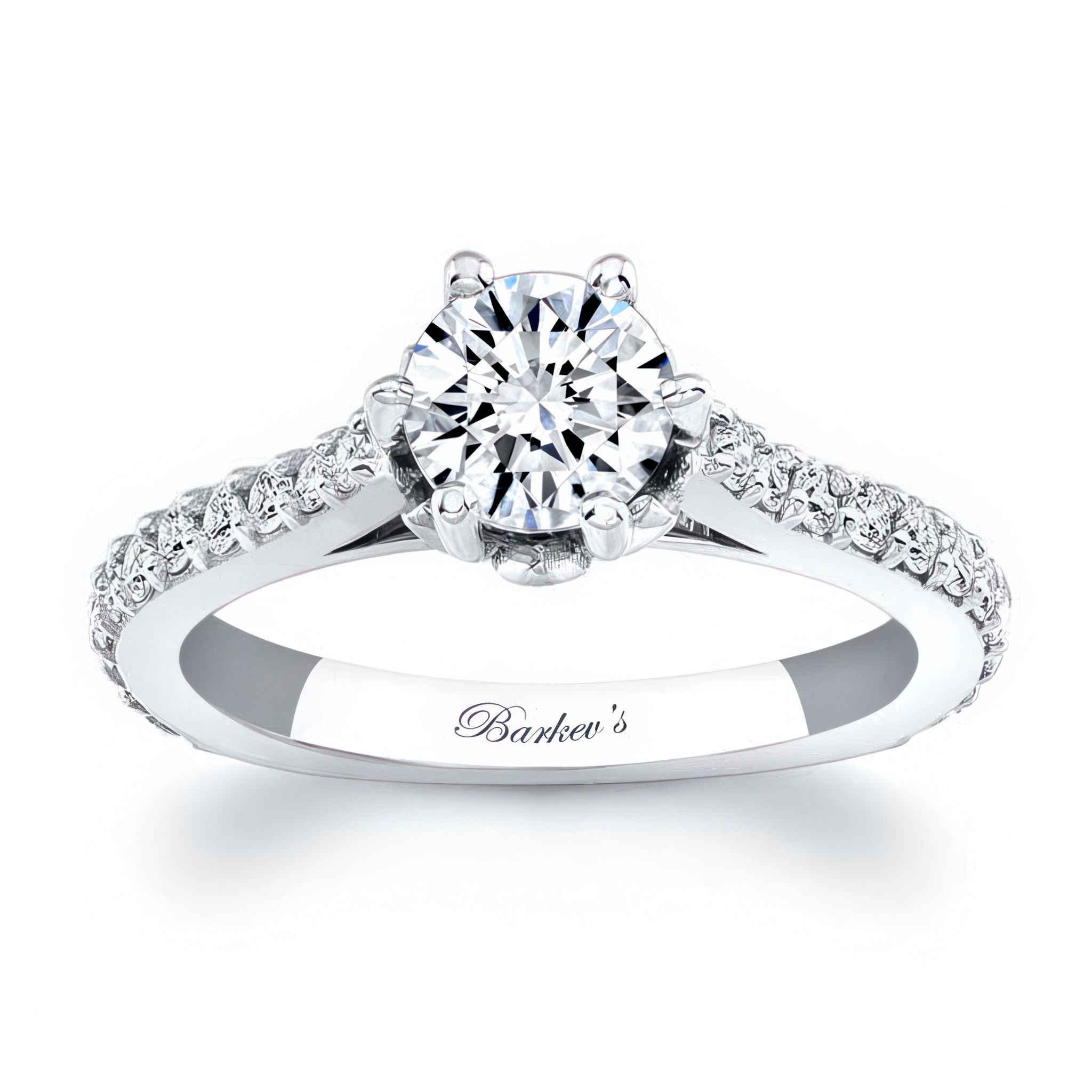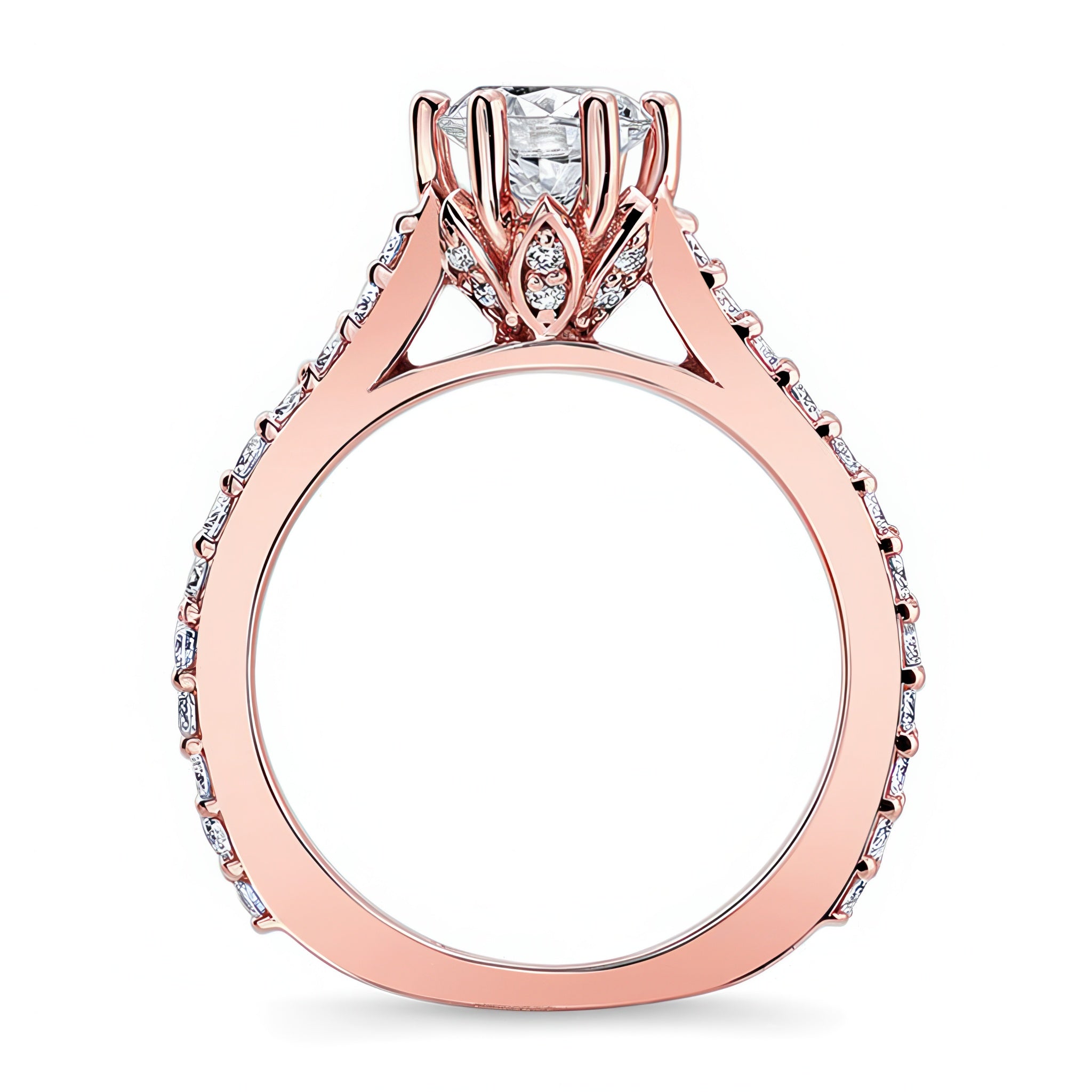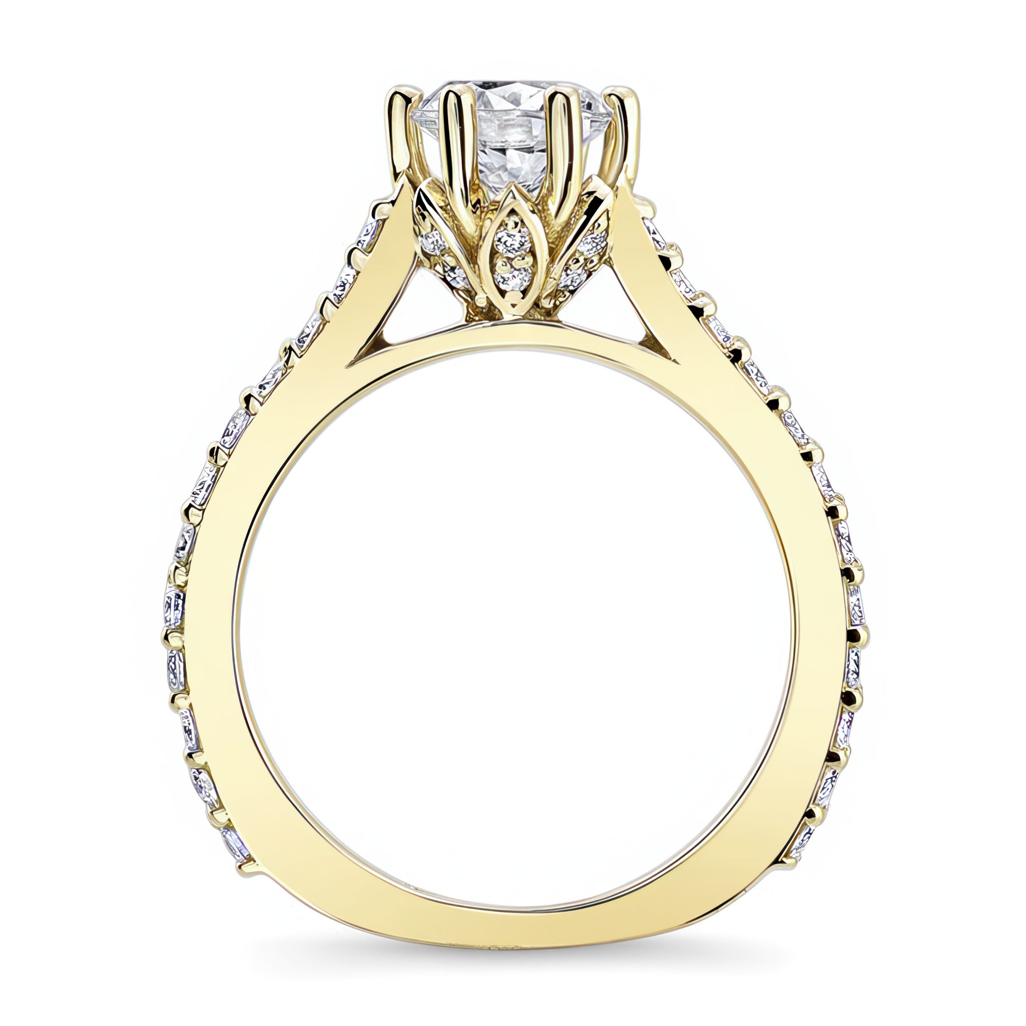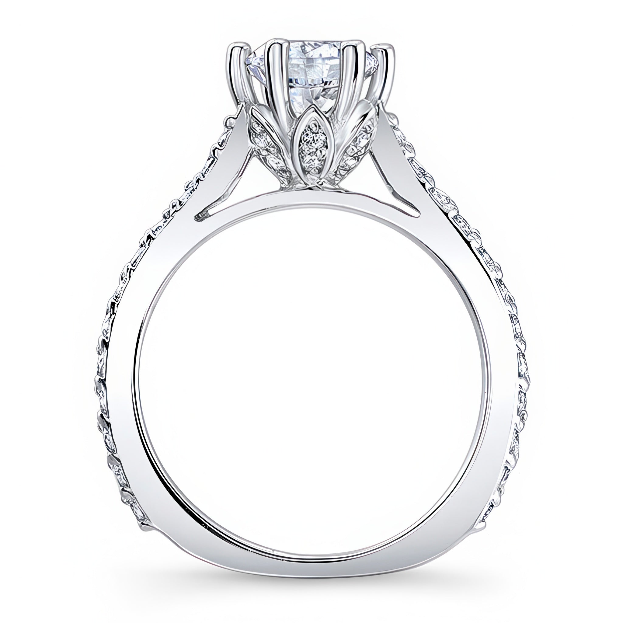 This flower moissanite ring exudes elegance with a six prong flower head cradling the center like a flower in bloom and cathedral shoulders adorned with shared prong set diamonds for an elegant finish.