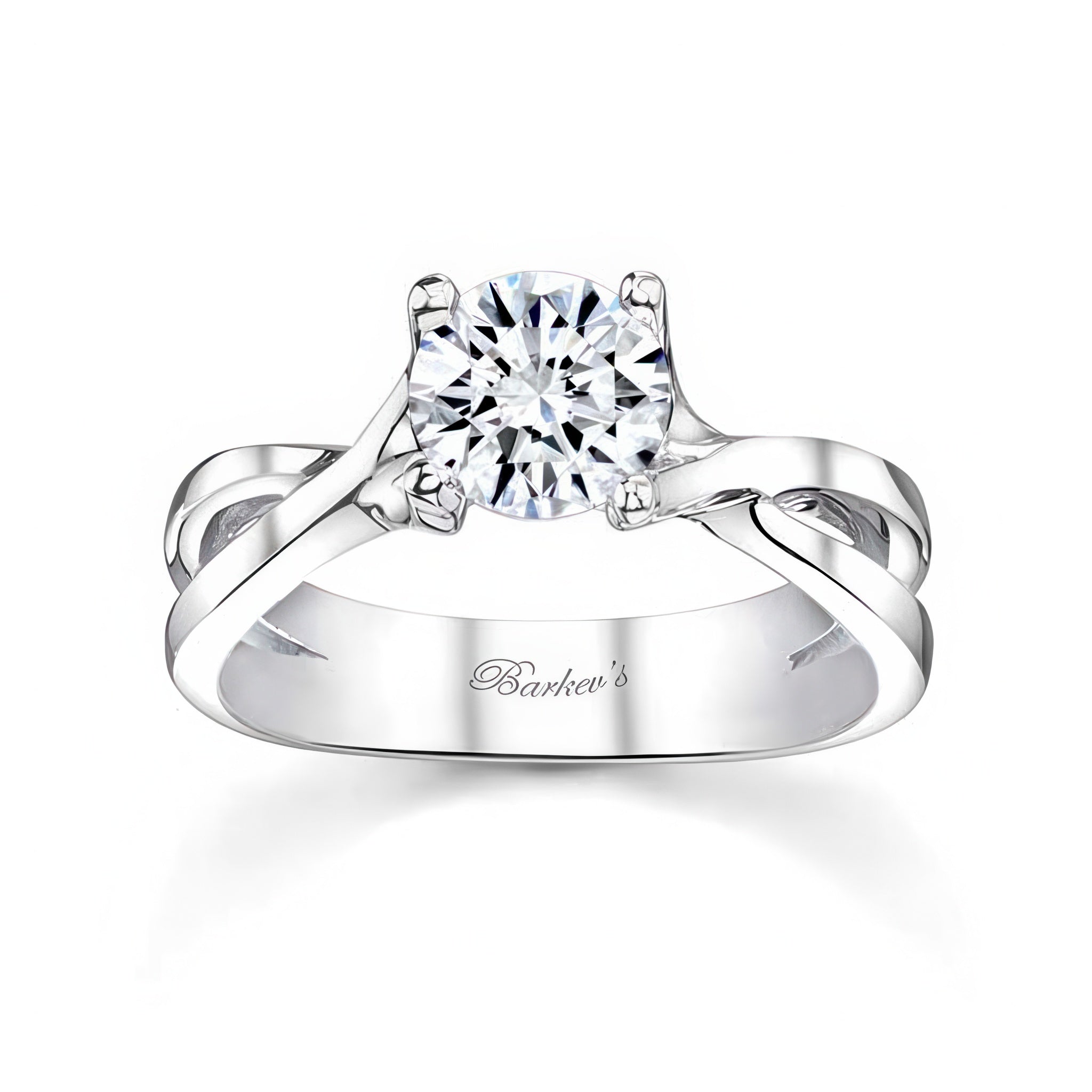 This four prong split shank moissanite solitaire ring features a round center with a split shank that swoops up to the four prong setting for a sophisticated aura.