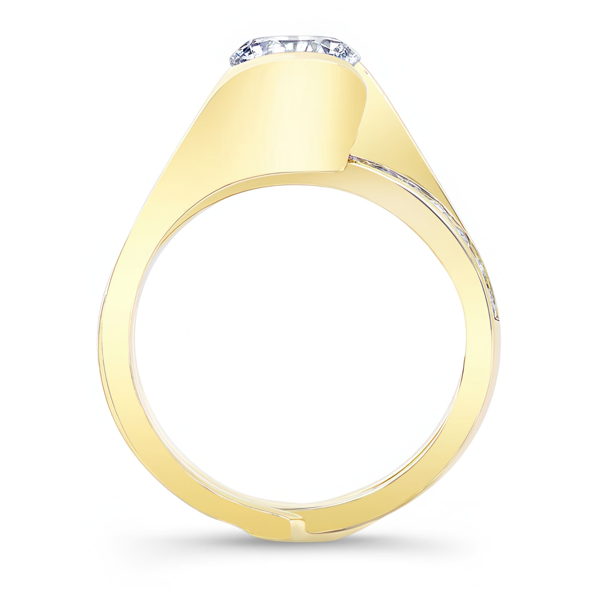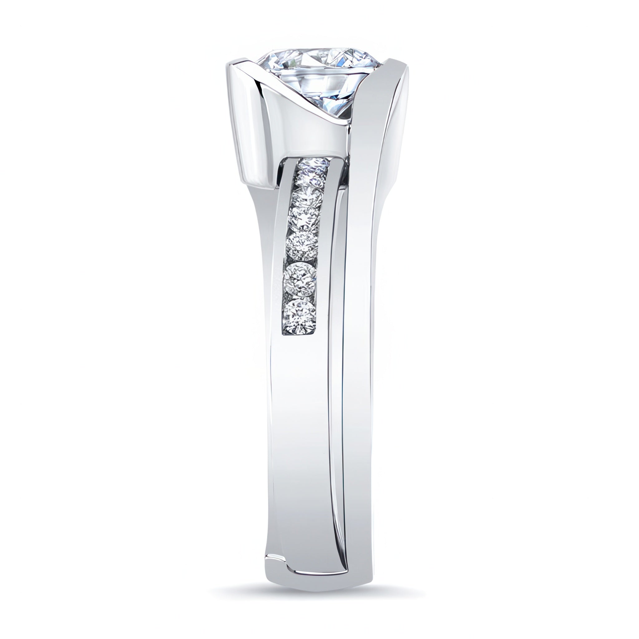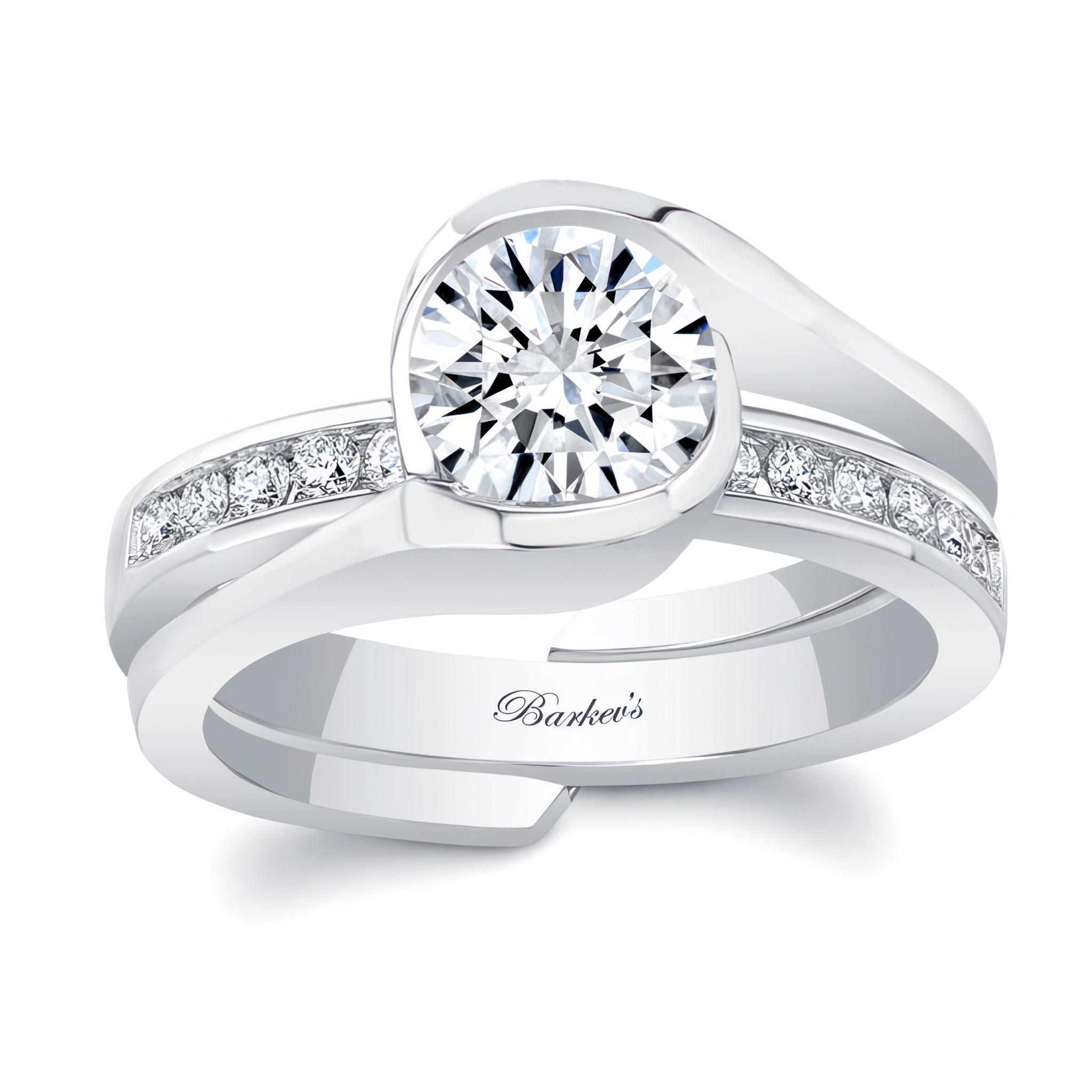 This half bezel moissanite interlocking bridal set features a classic round center and a channel set diamond wedding band that slips into the ring for a display of true elegance.
