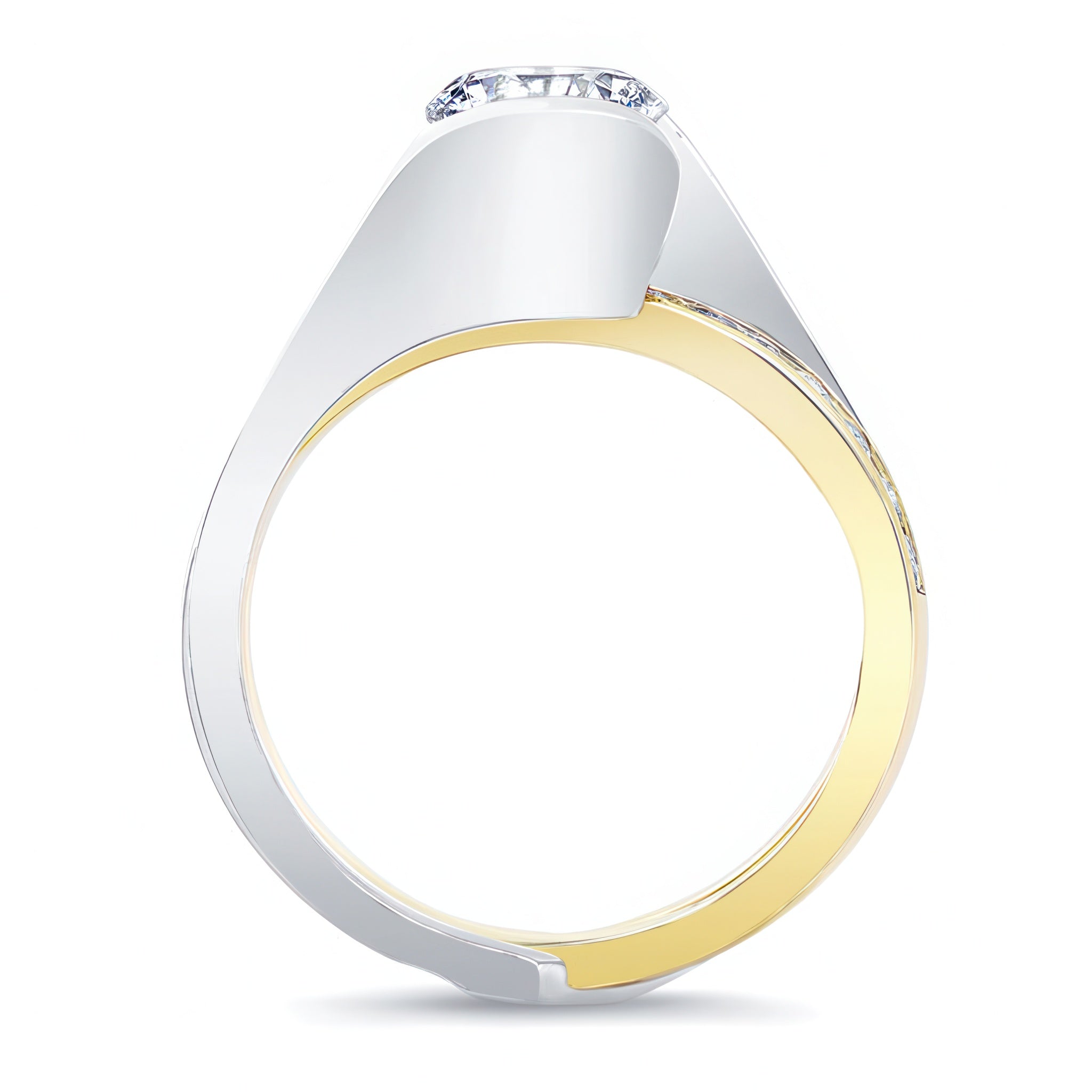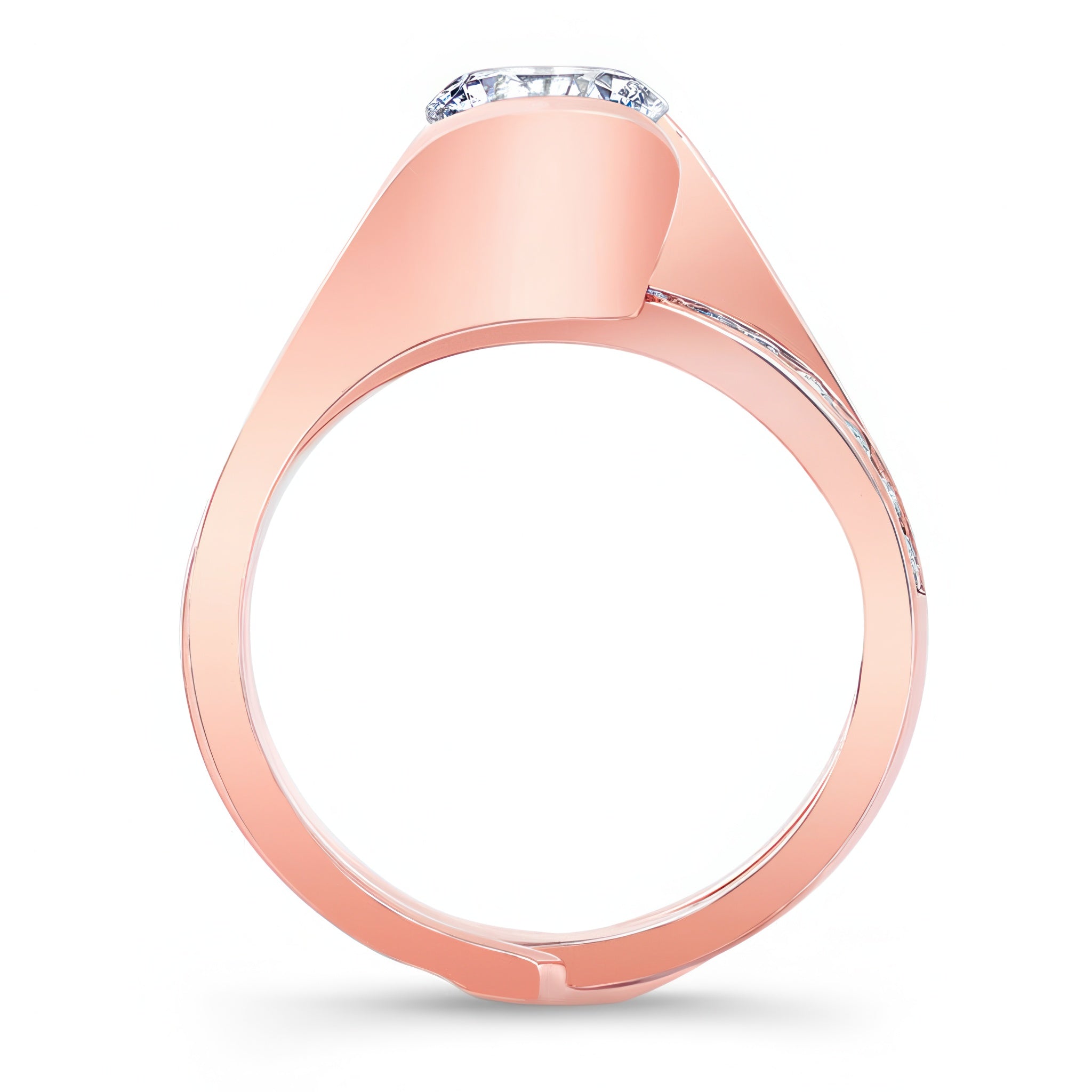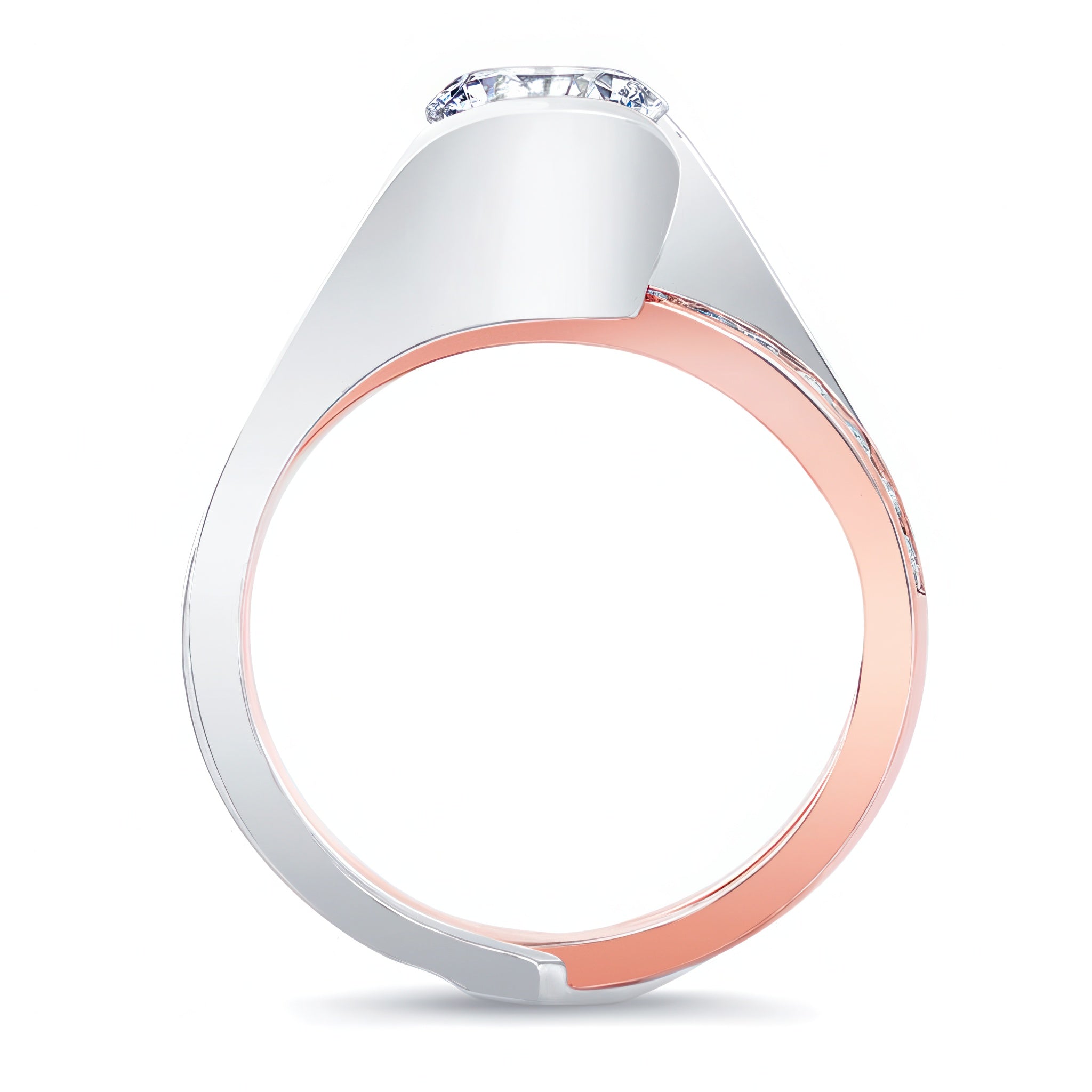 This half bezel moissanite interlocking bridal set features a classic round center and a channel set diamond wedding band that slips into the ring for a display of true elegance.