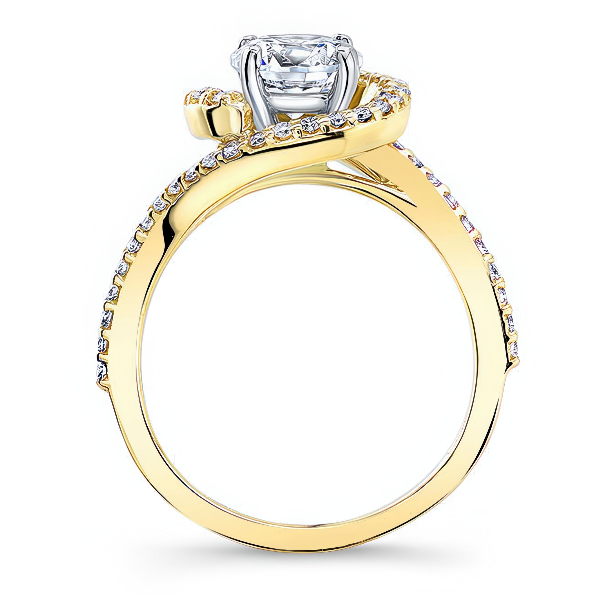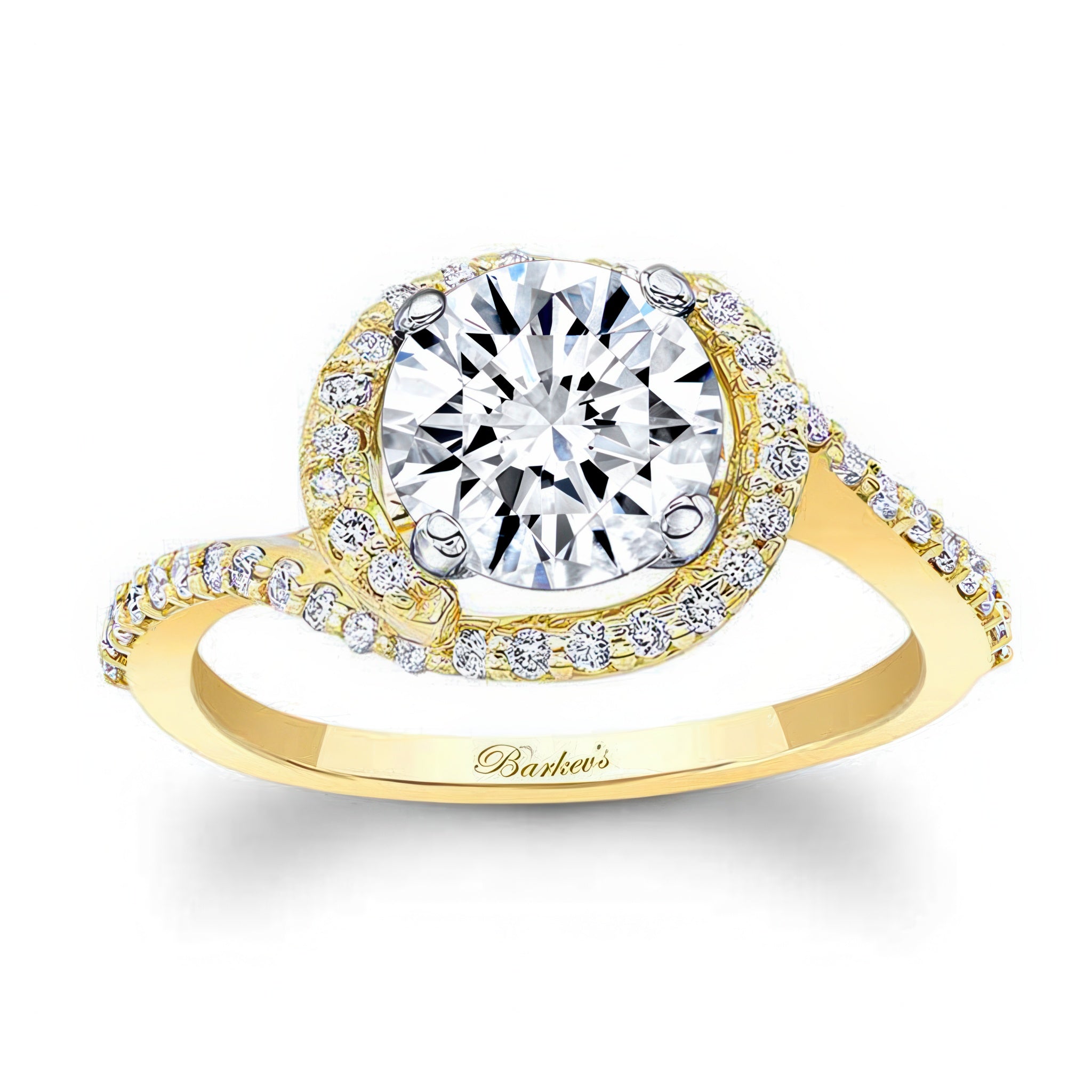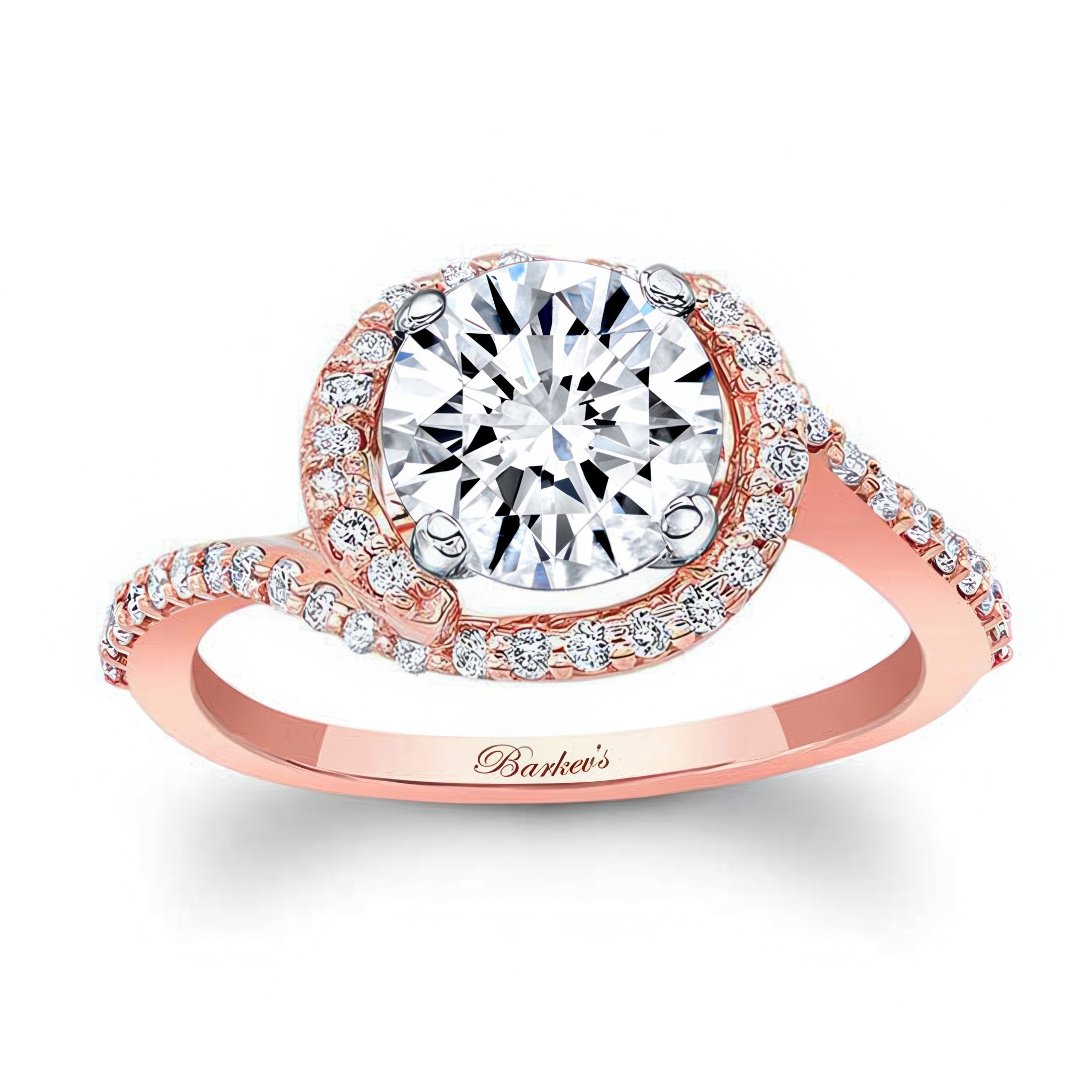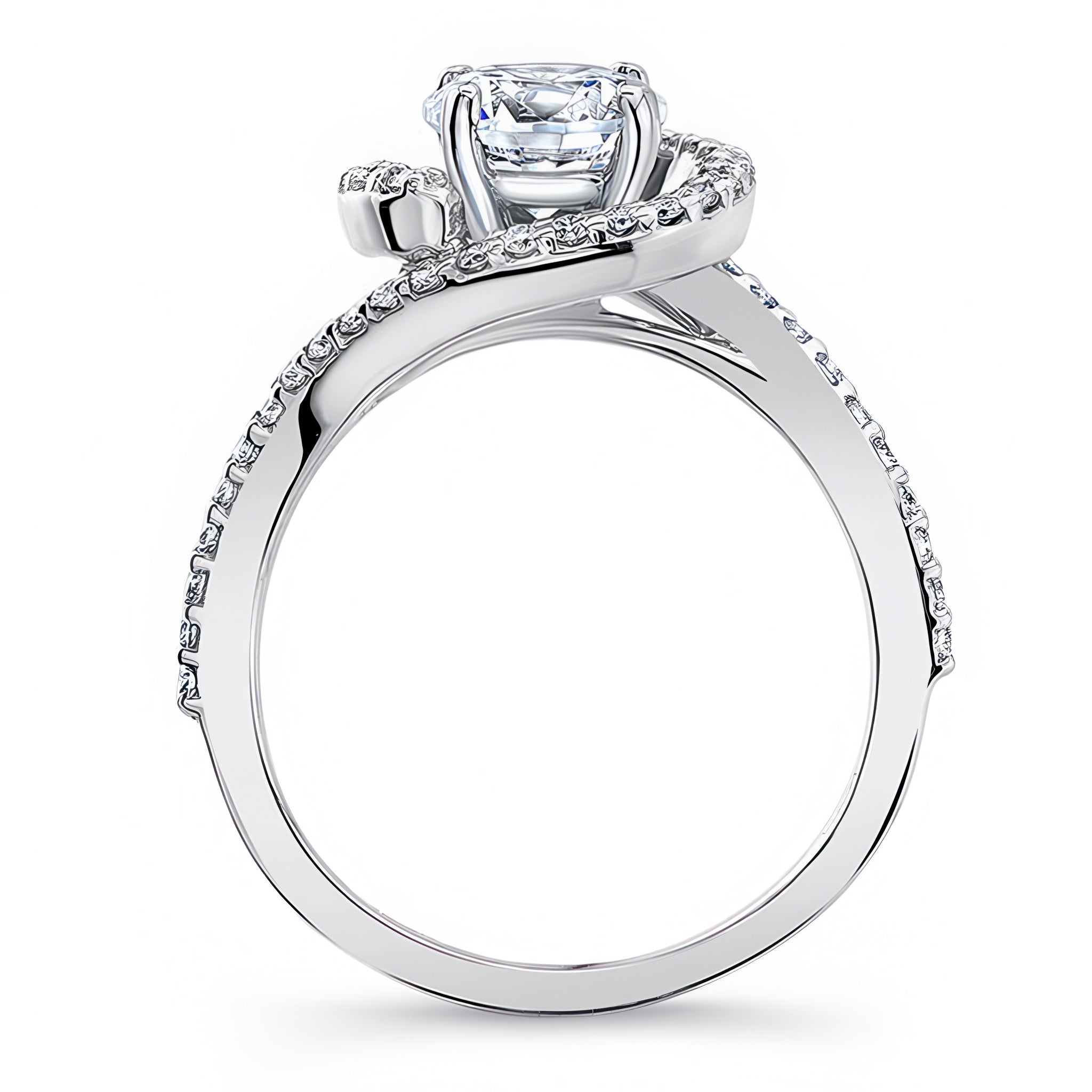 This half halo moissanite engagement ring features a prong set round center adorned with shared prong set diamonds swirling around and down the dainty shoulders.