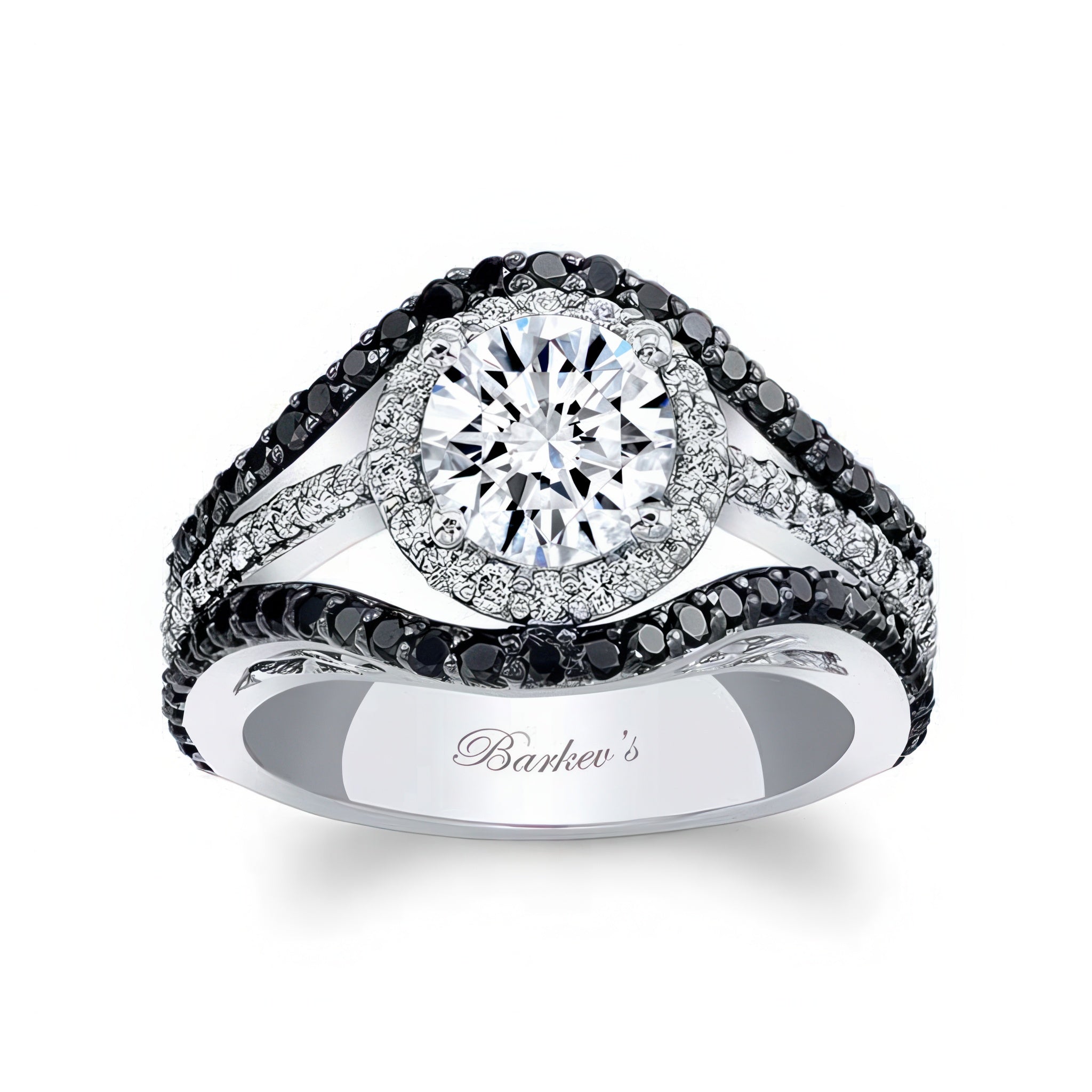 This halo black diamond accent moissanite ring features a prong set round center encircled with diamonds and a split shank adorned with shared prong set black diamonds for a stunning contemporary flair.