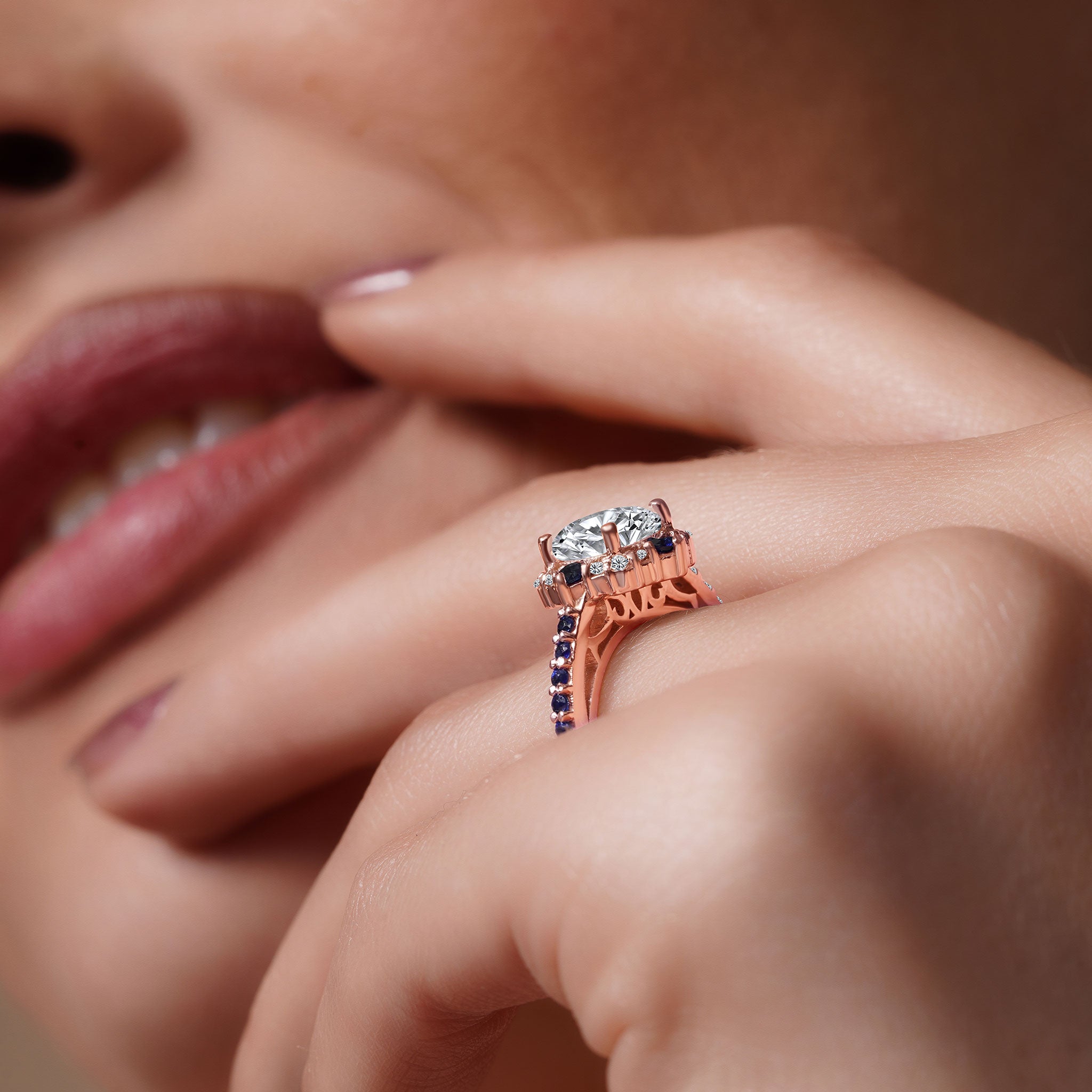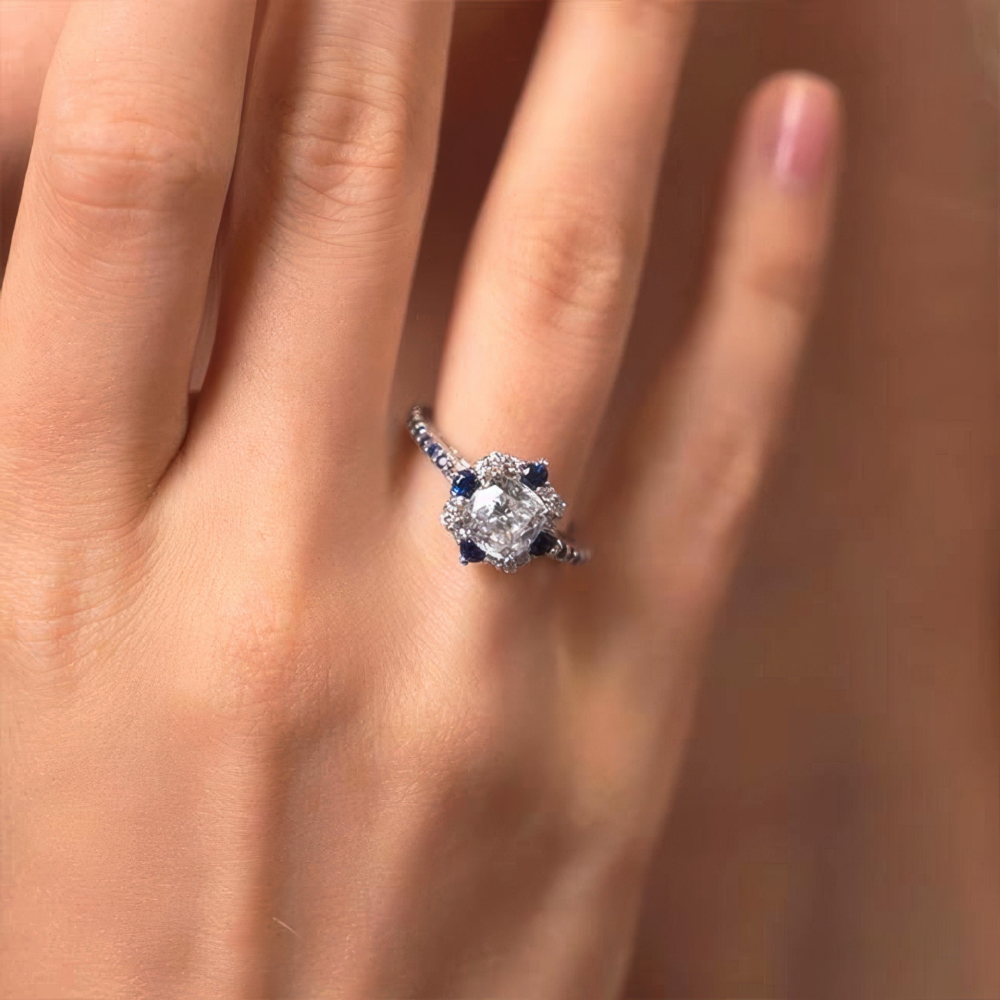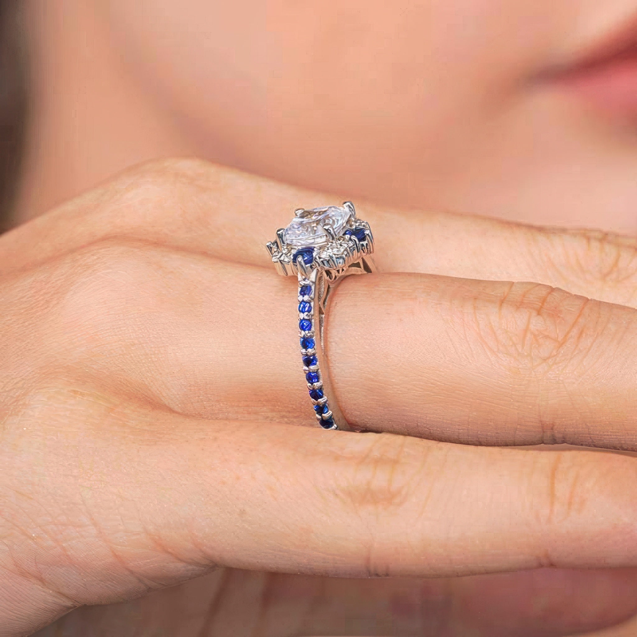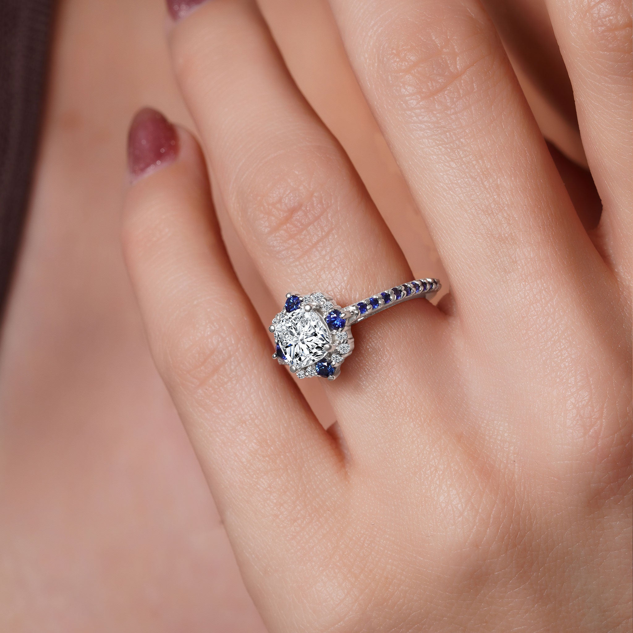 Halo Cushion Cut Moissanite Ring With Blue Sapphires