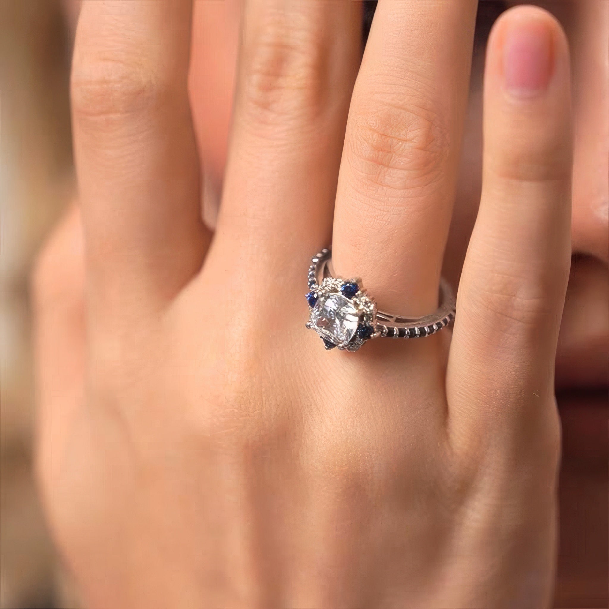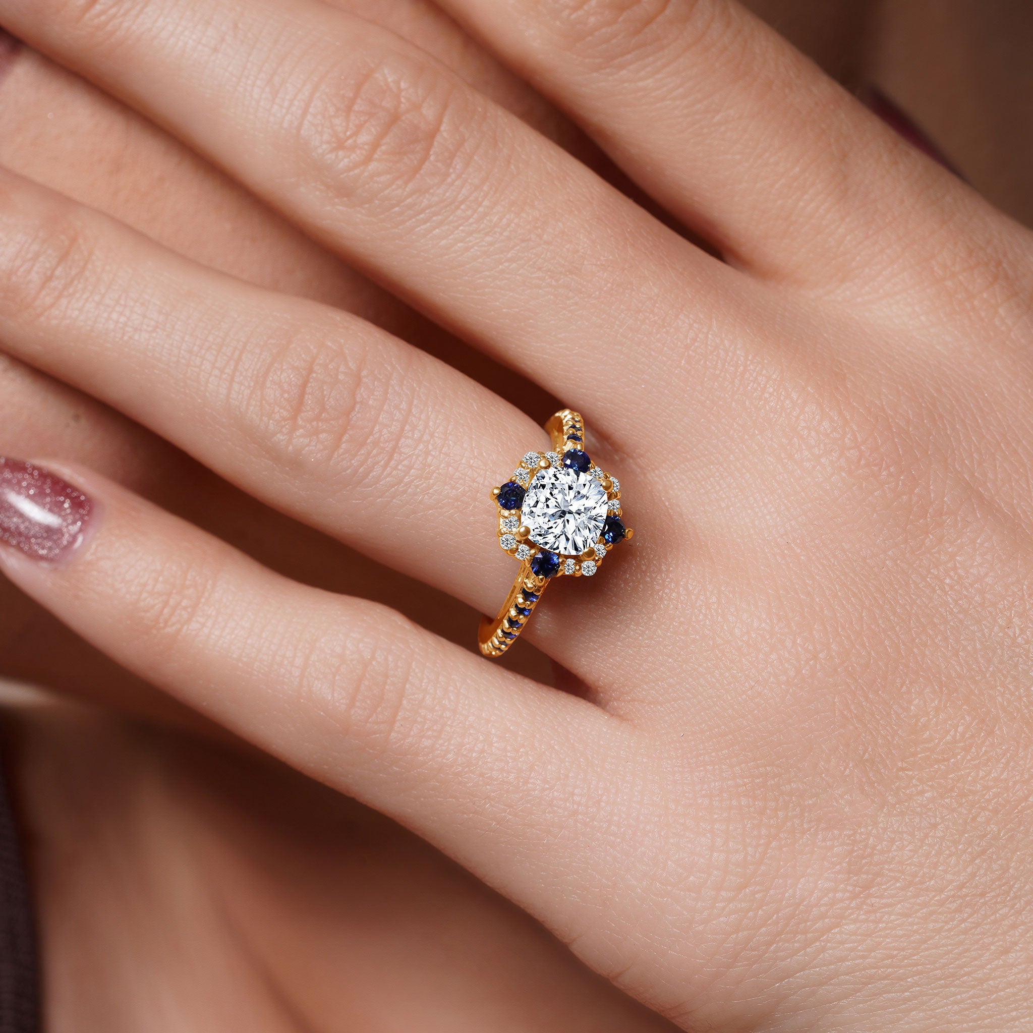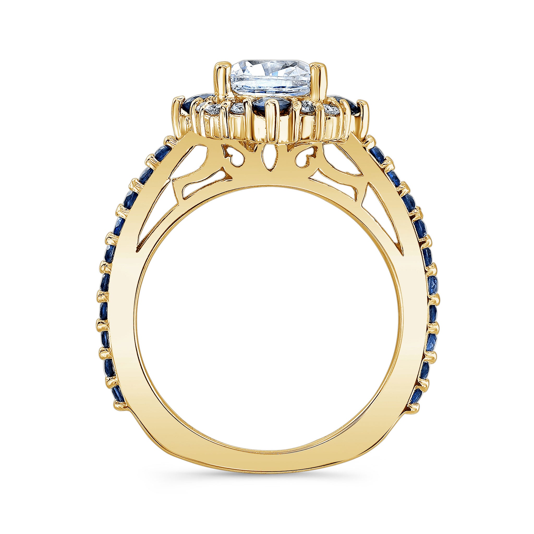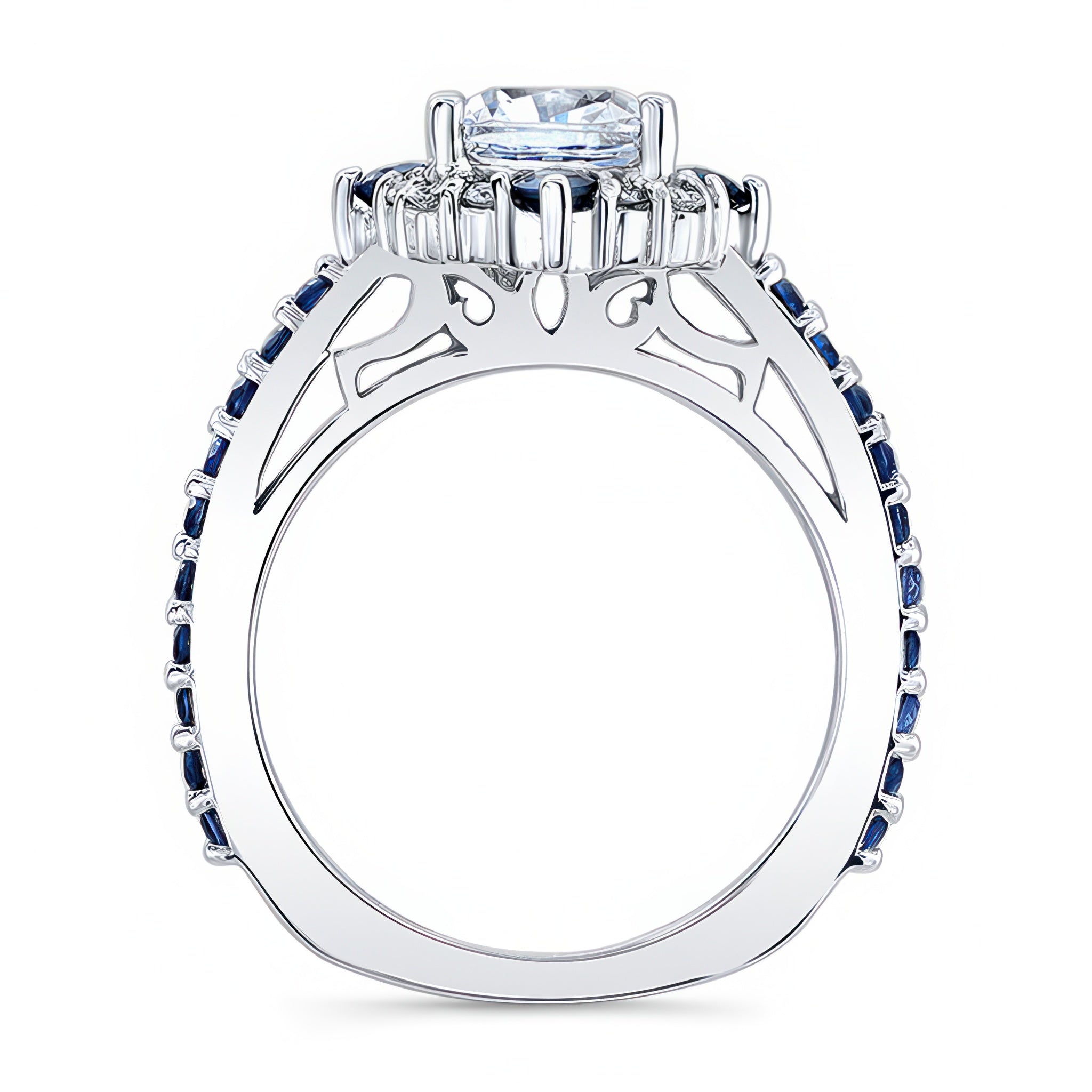 Halo Cushion Cut Moissanite Ring With Blue Sapphires