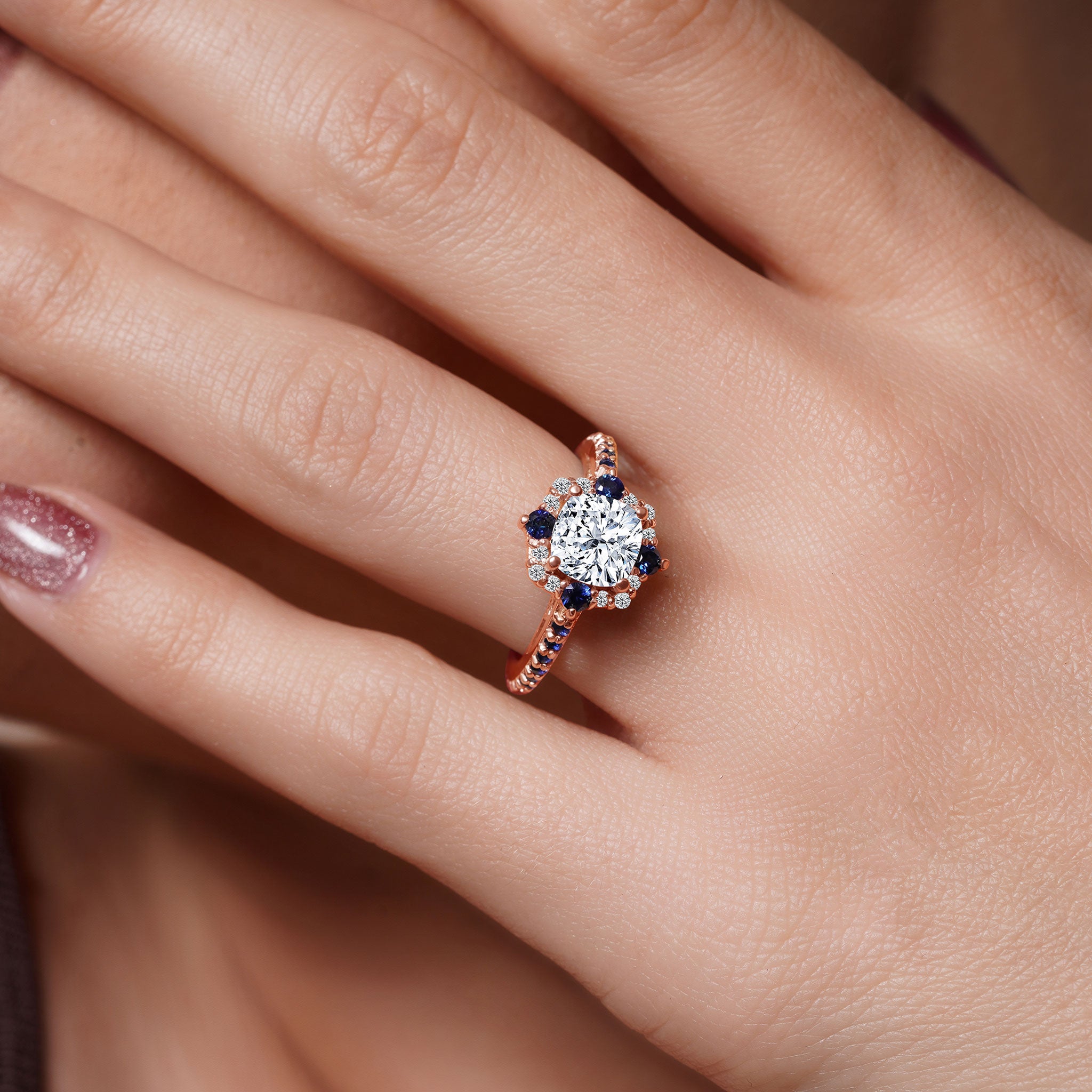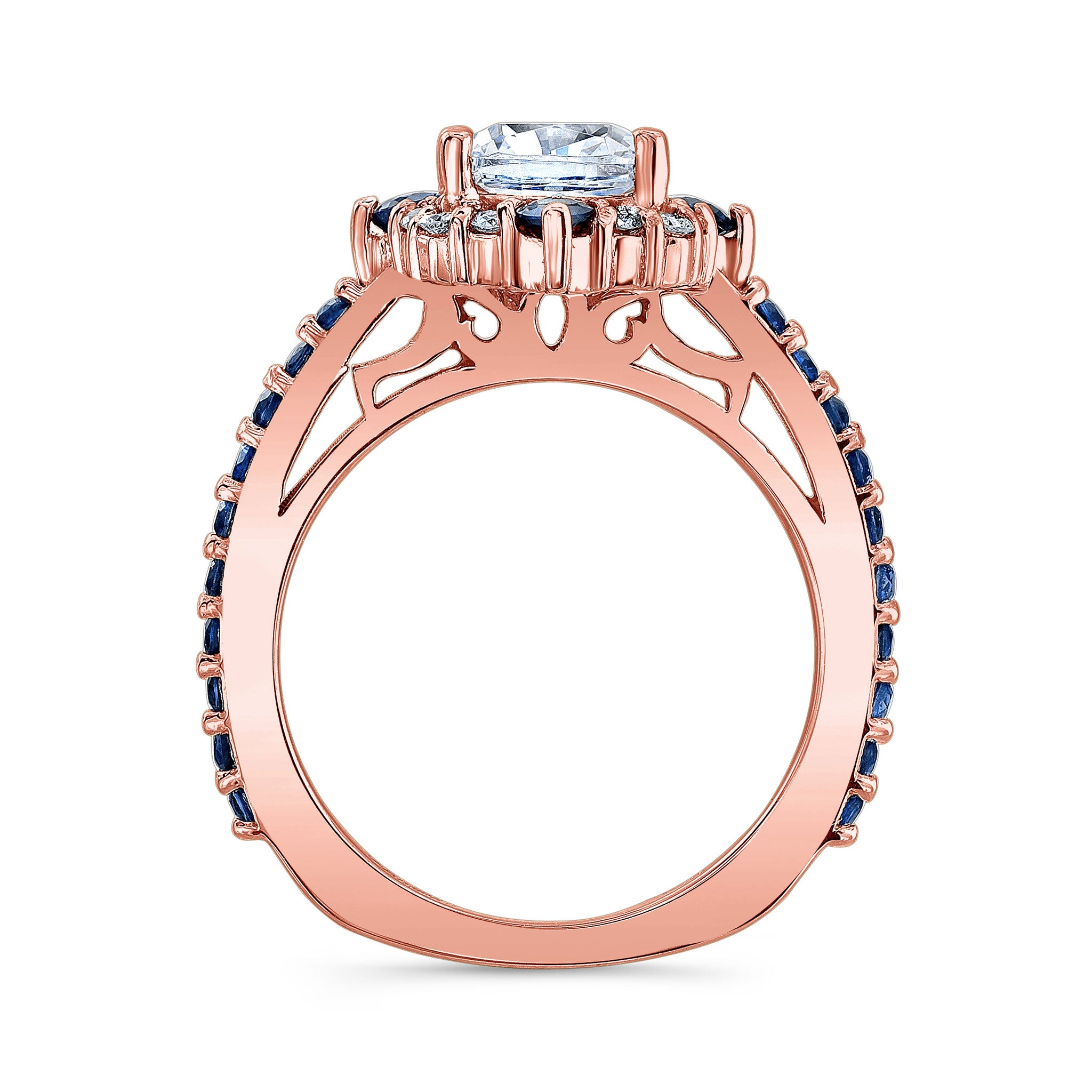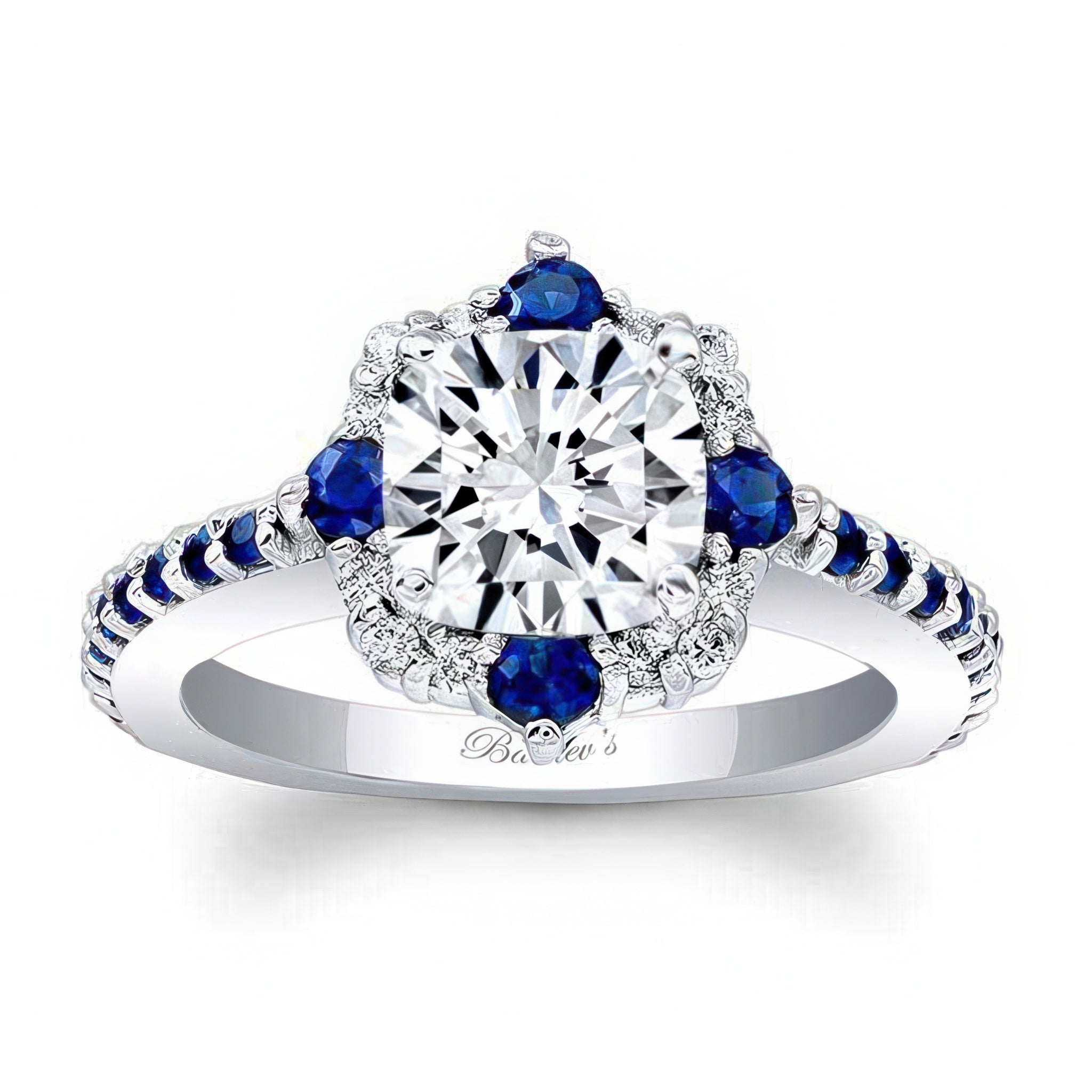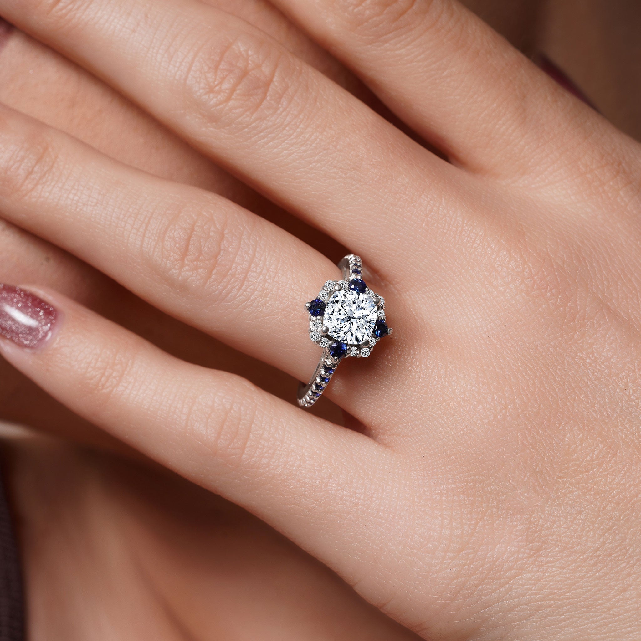 This halo cushion cut moissanite ring with blue sapphires features a prong set cushion center embellished with shared prong set diamonds and blue sapphires for a striking look.