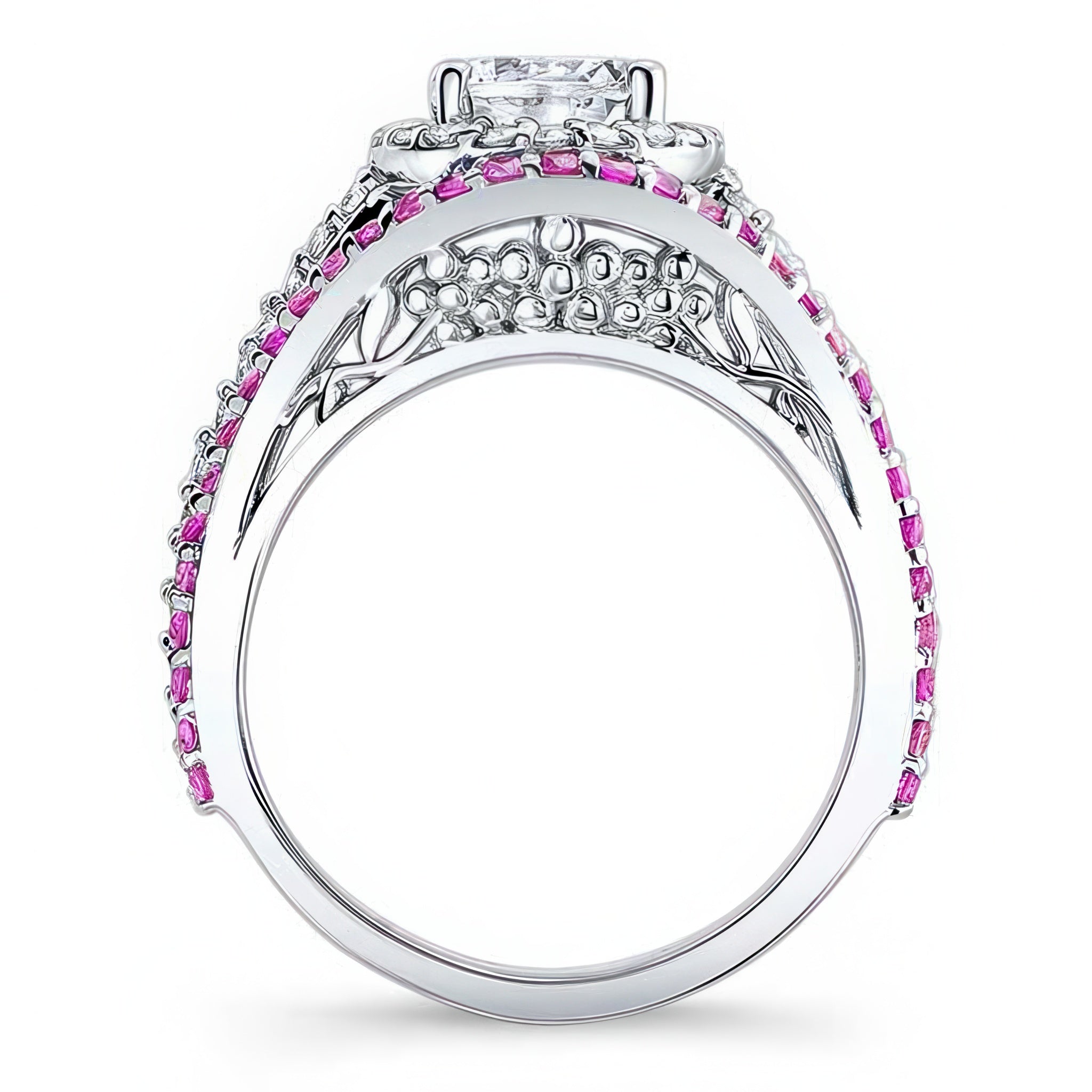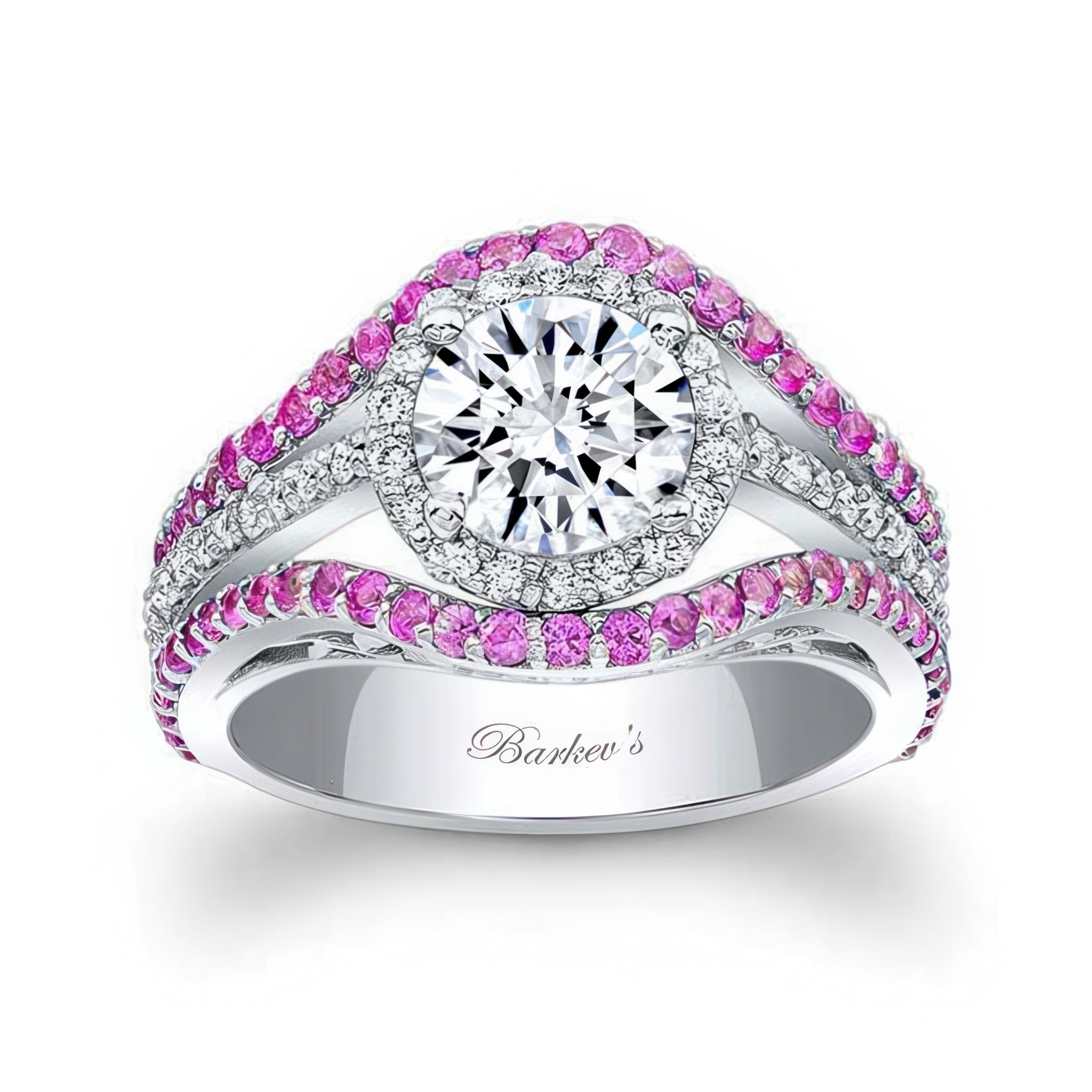 This halo pink sapphire accent moissanite ring features a prong set round center encircled with diamonds and a split shank adorned with shared prong set pink sapphires for a stunning contemporary flair.