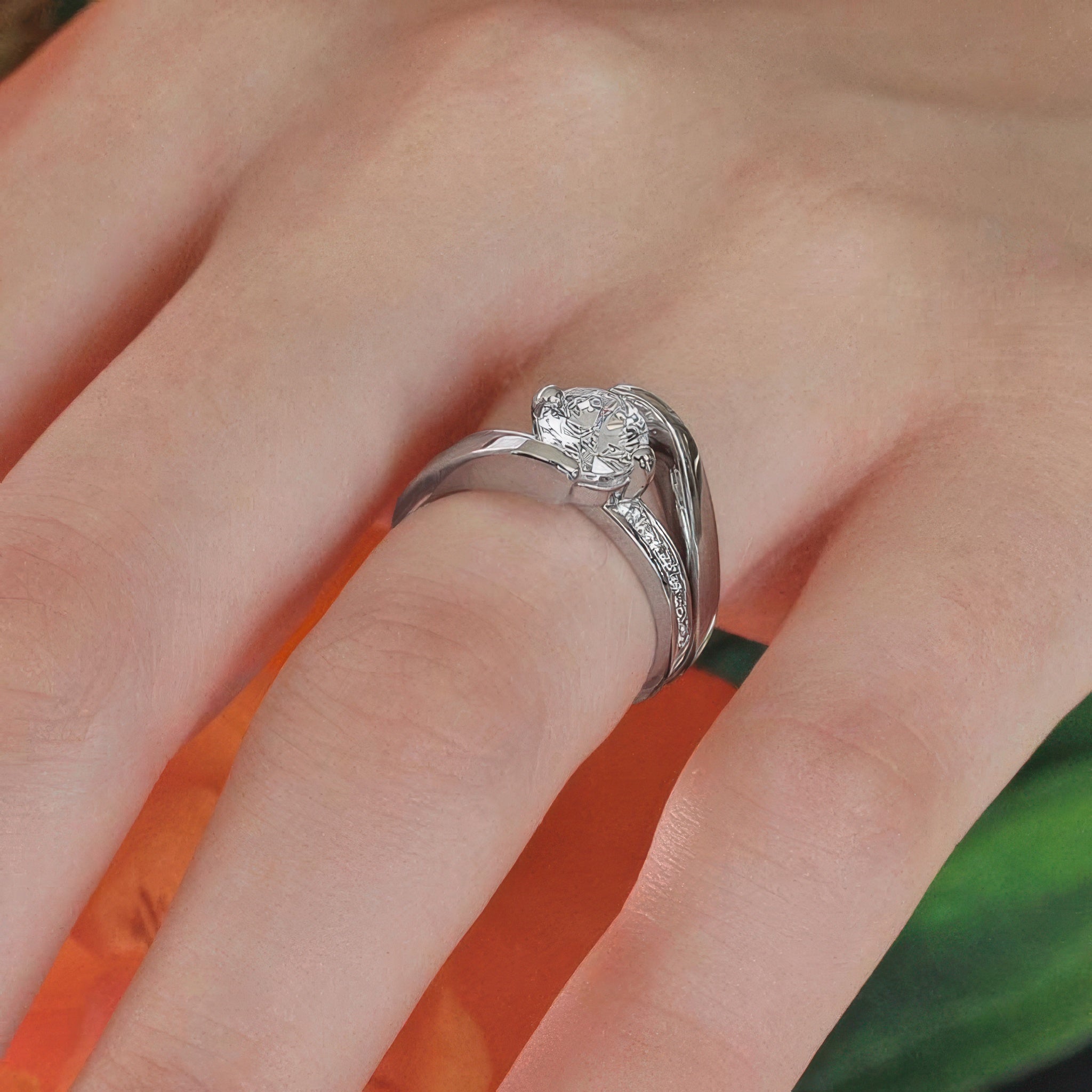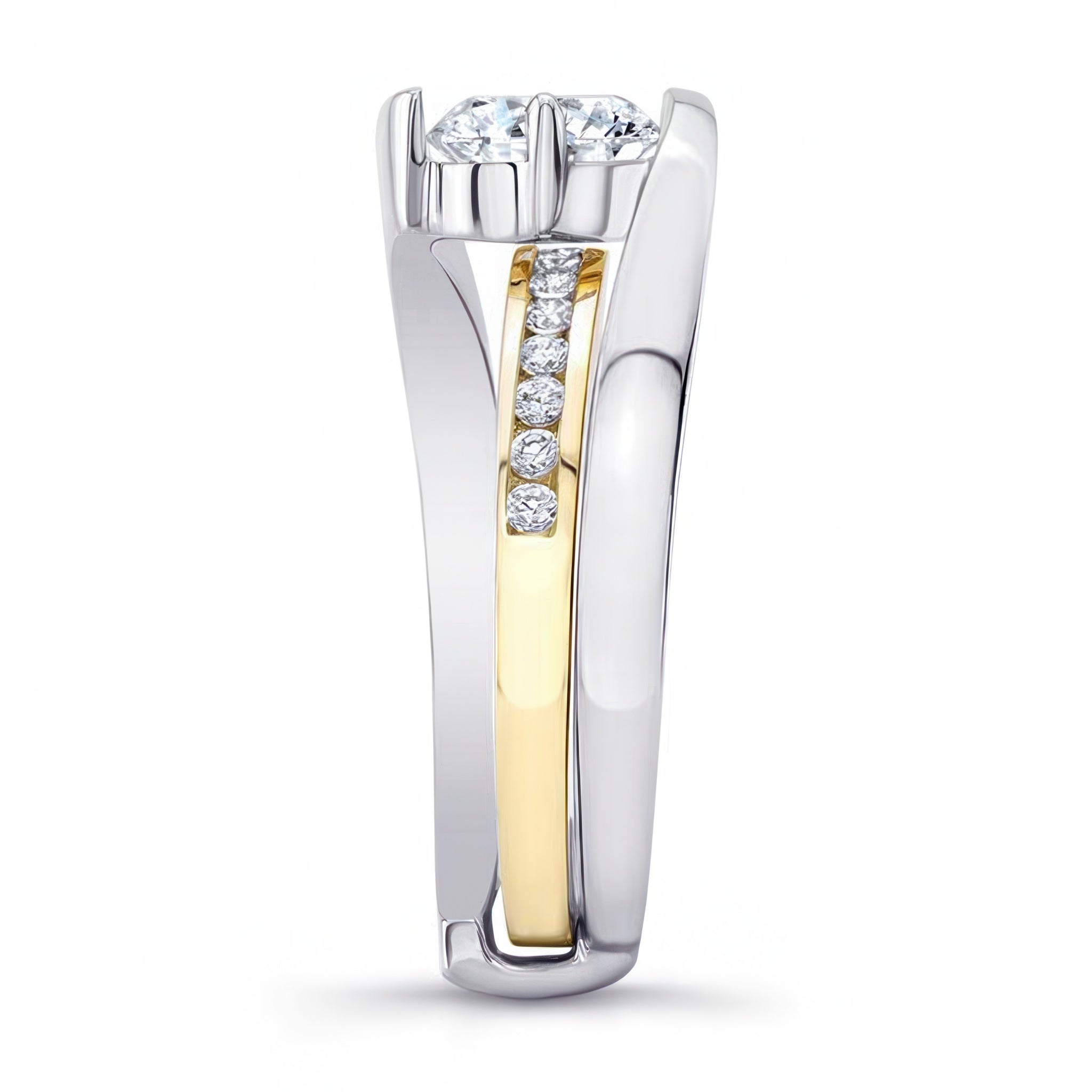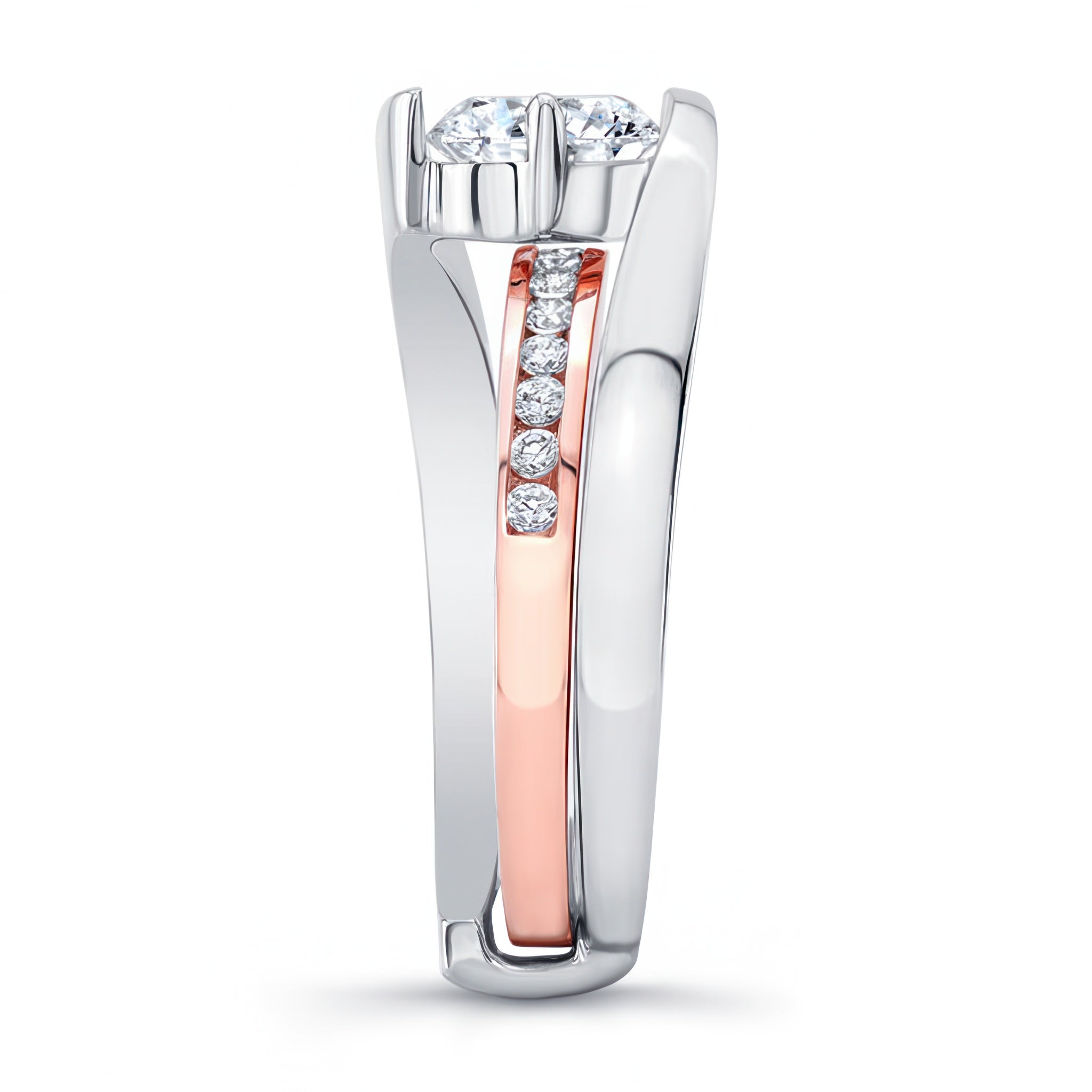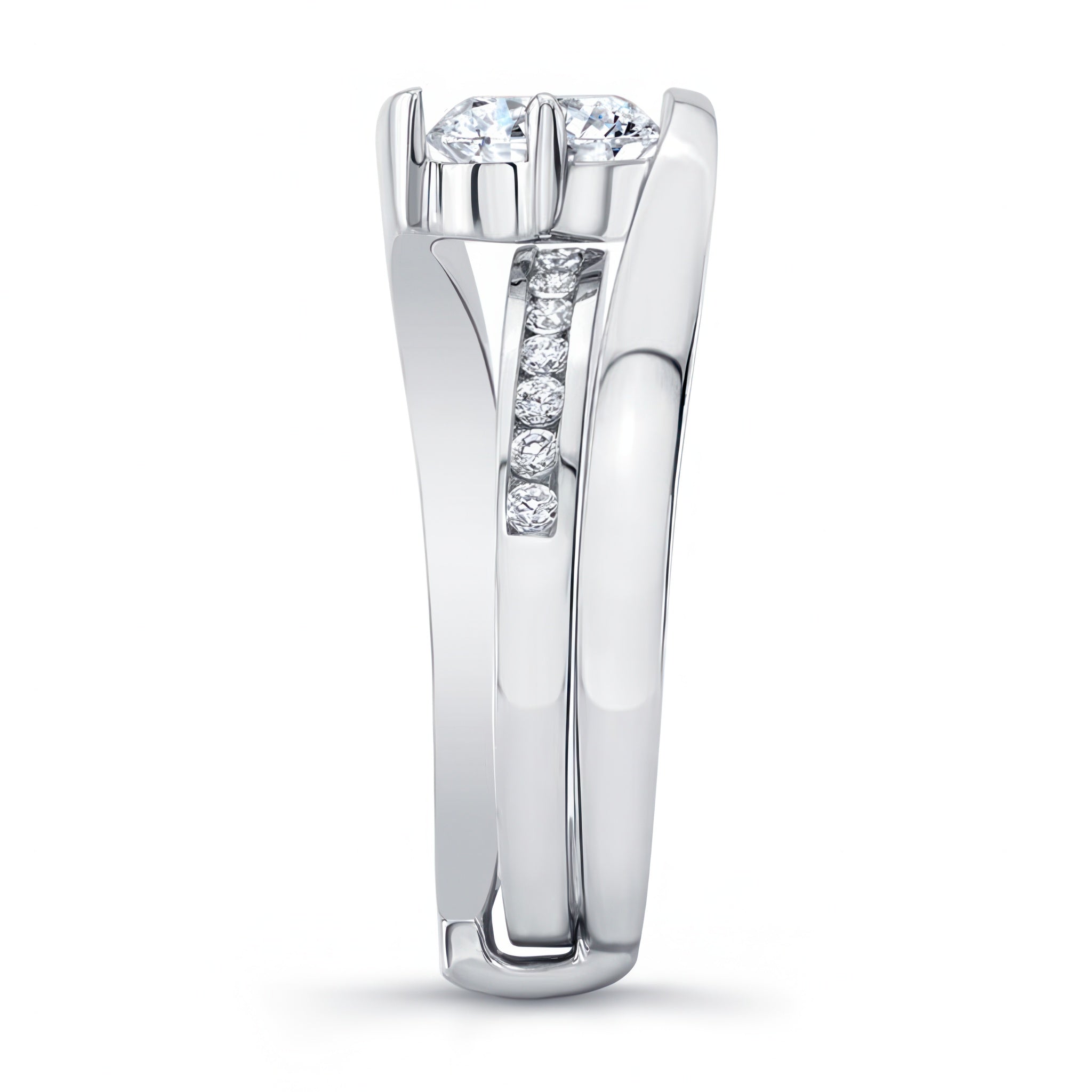 This interlocking moissanite wedding ring set features a round center cradled in a bypass setting and a channel set diamond wedding band that can be slipped into the interlocking shank for an added touch of luxury.