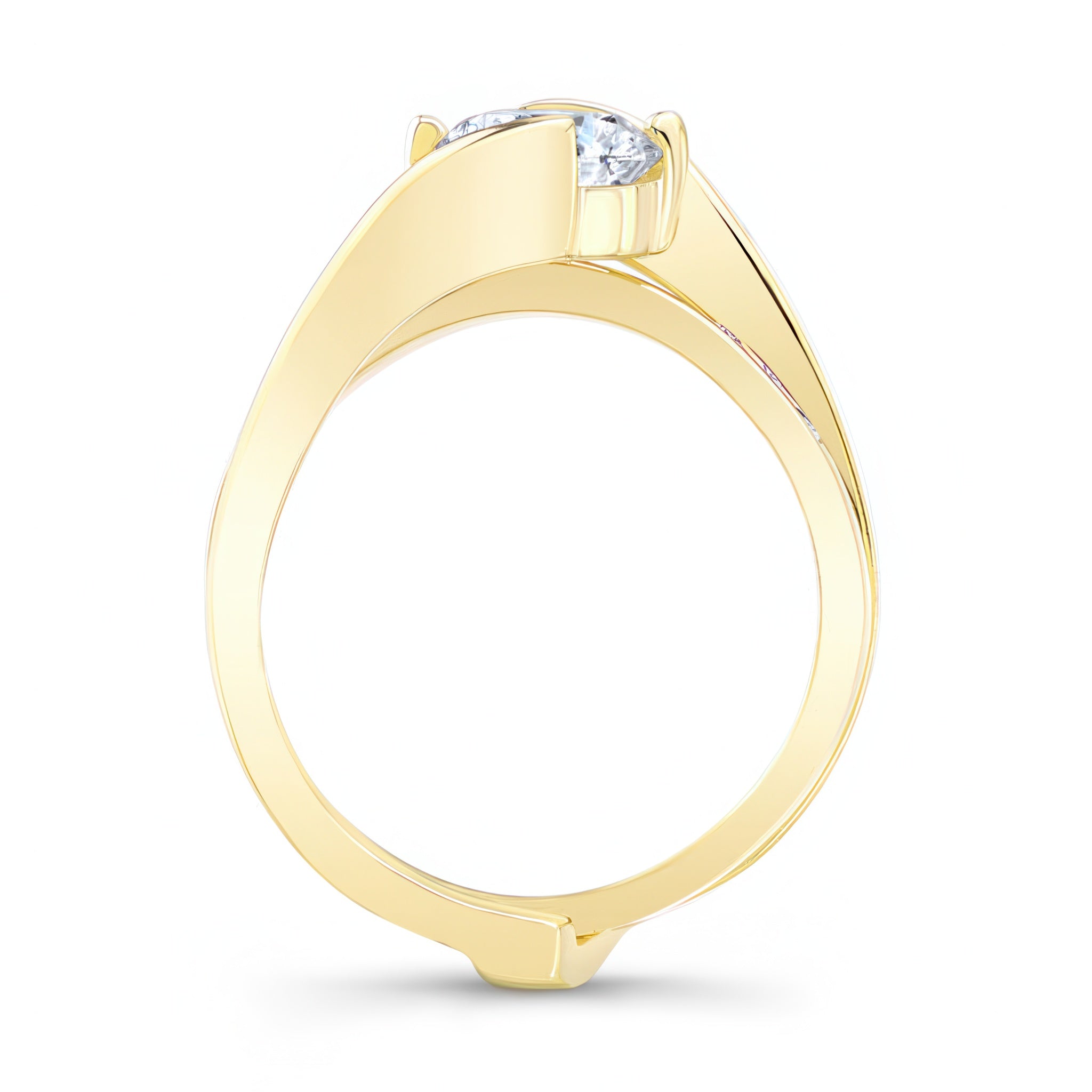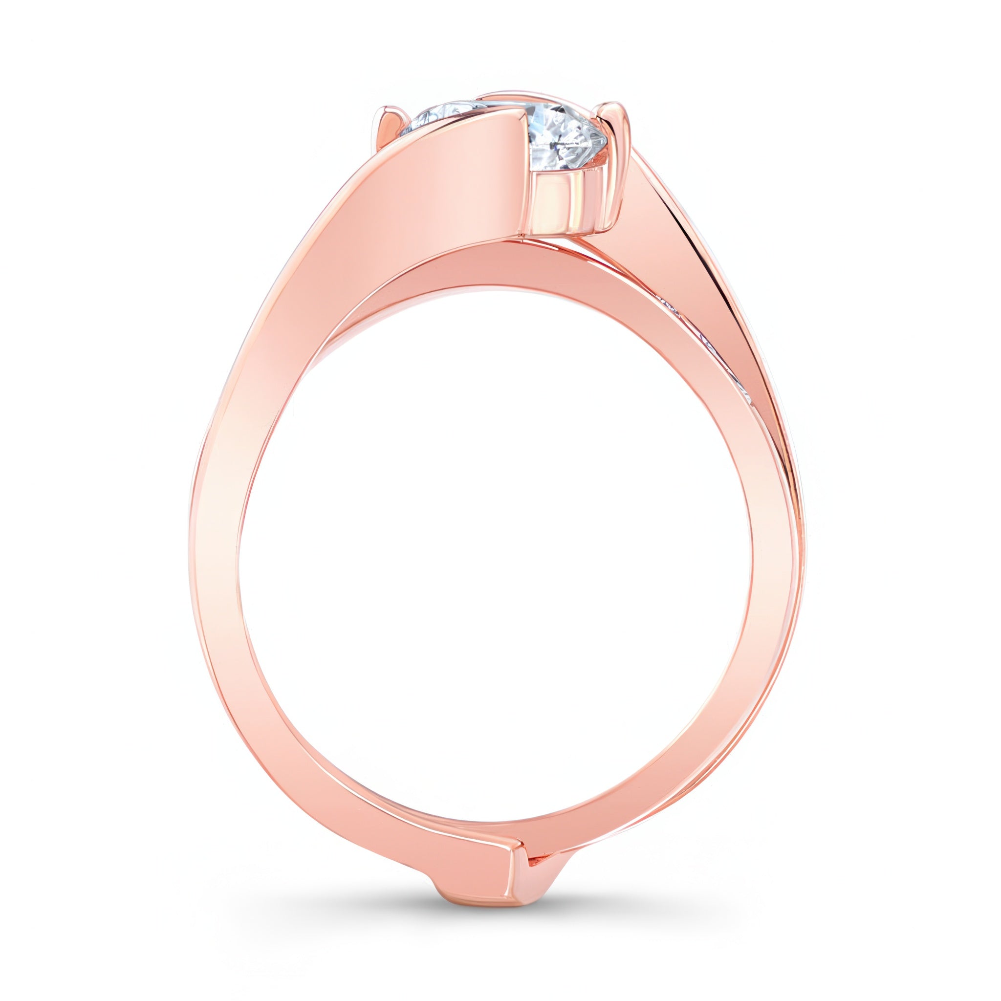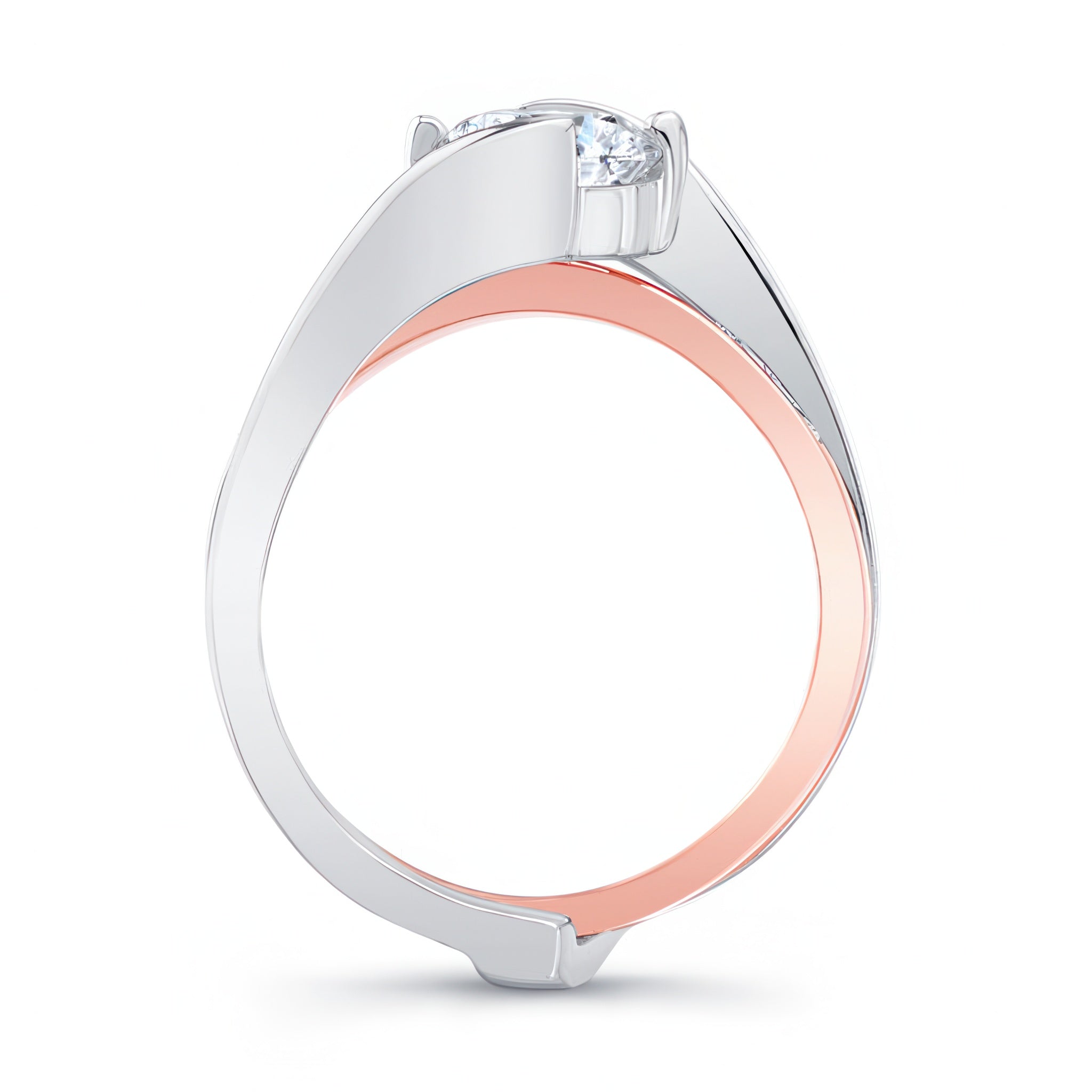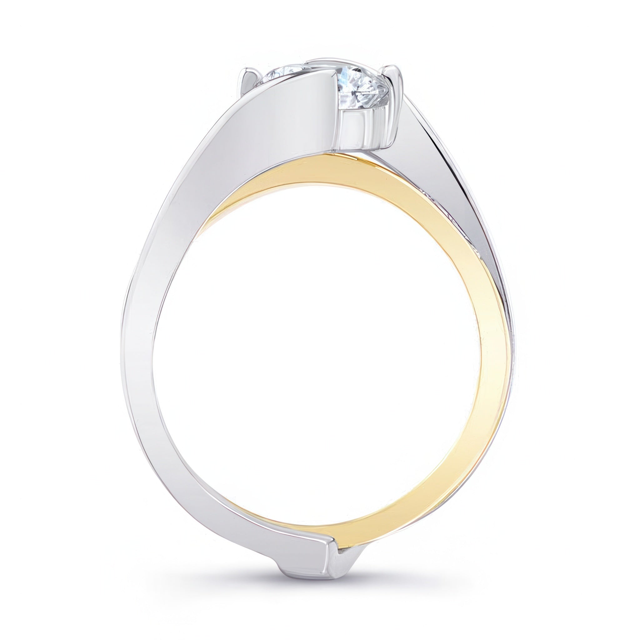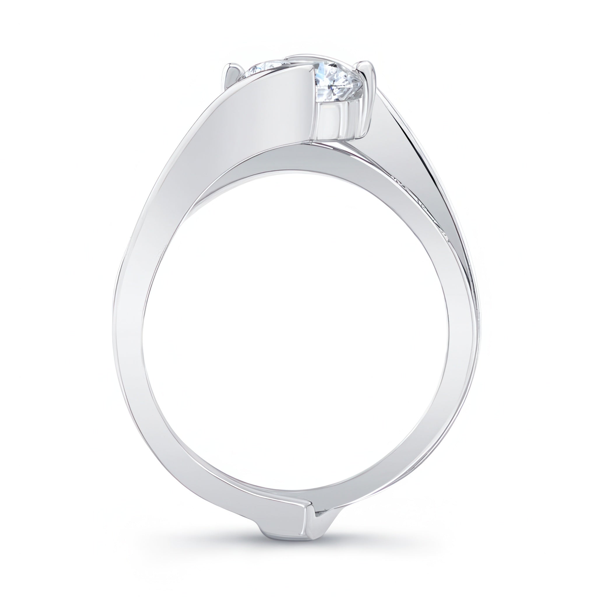 This interlocking moissanite wedding ring set features a round center cradled in a bypass setting and a channel set diamond wedding band that can be slipped into the interlocking shank for an added touch of luxury.