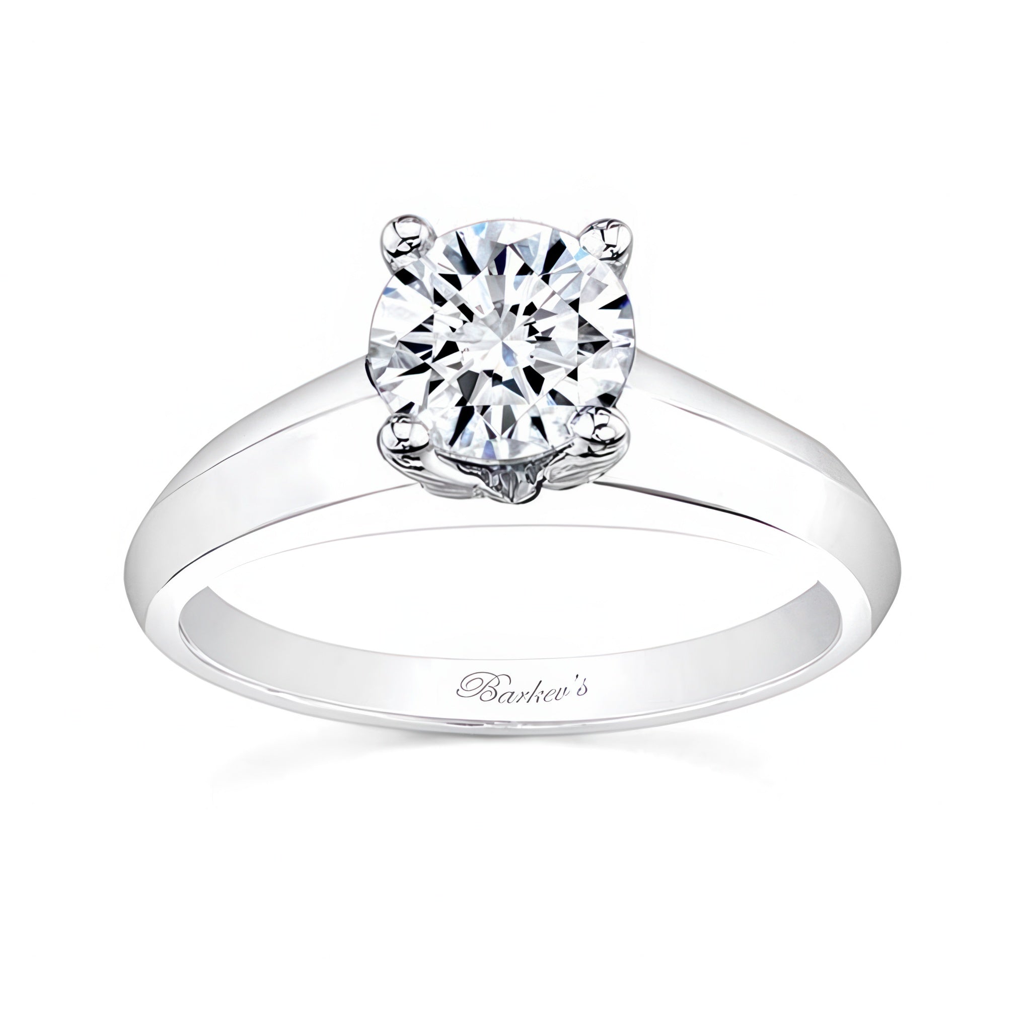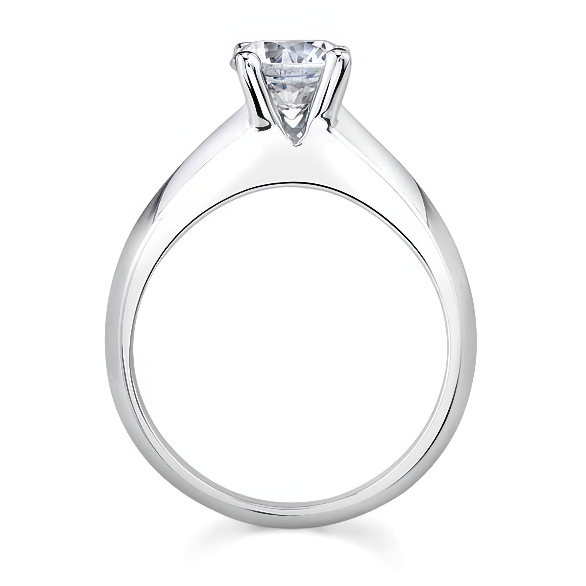 This knife edged moissanite solitaire ring features a prong set round center with a beautiful domed shank with a knife edge ridge running down the center.