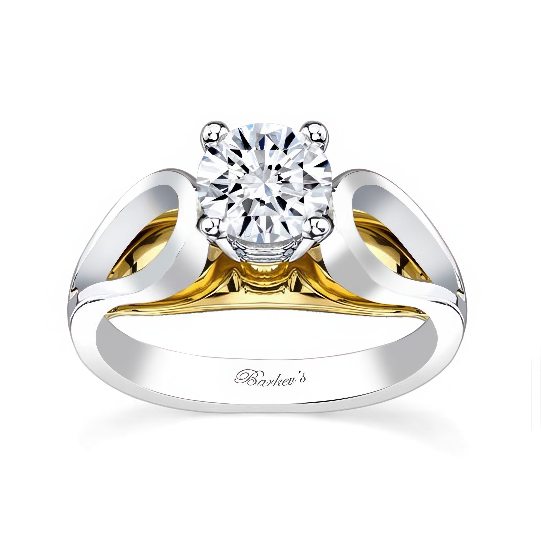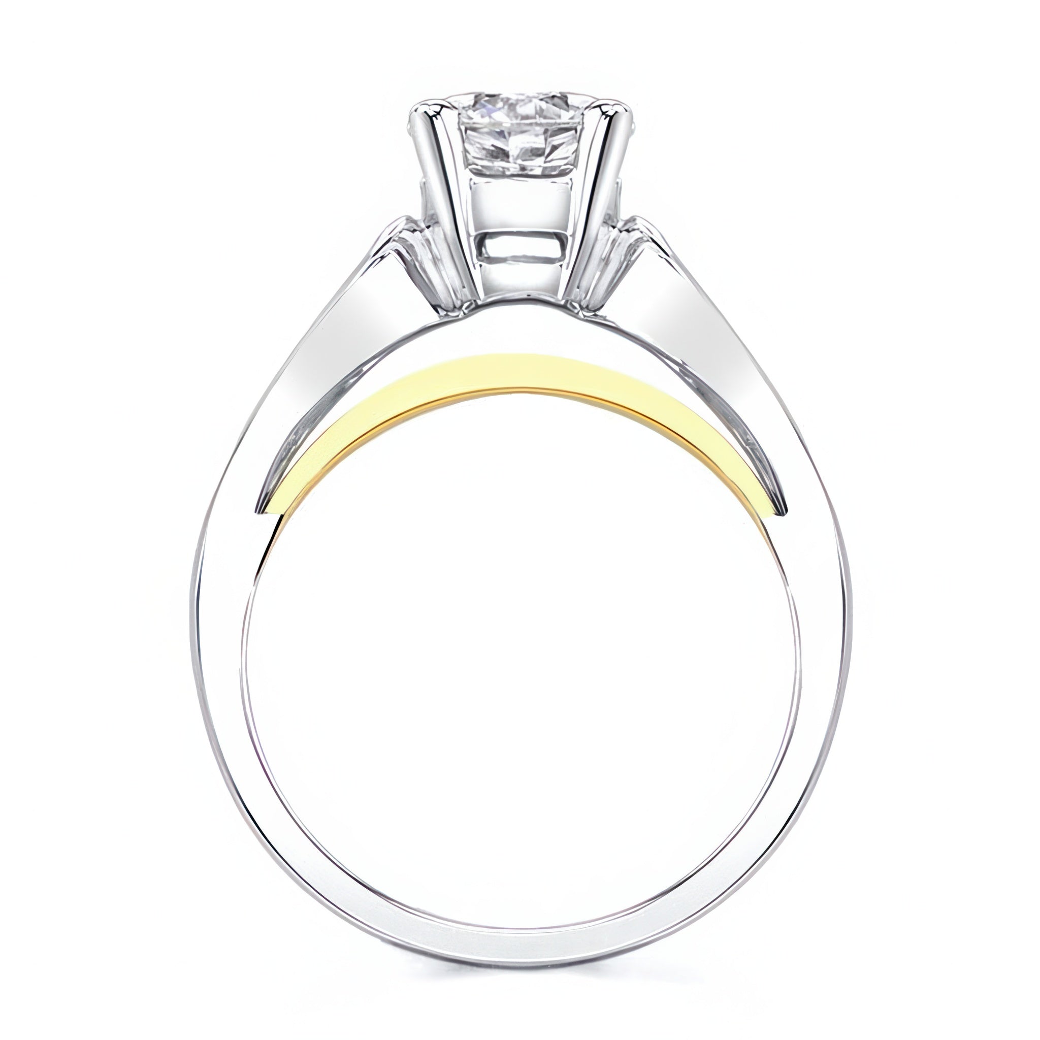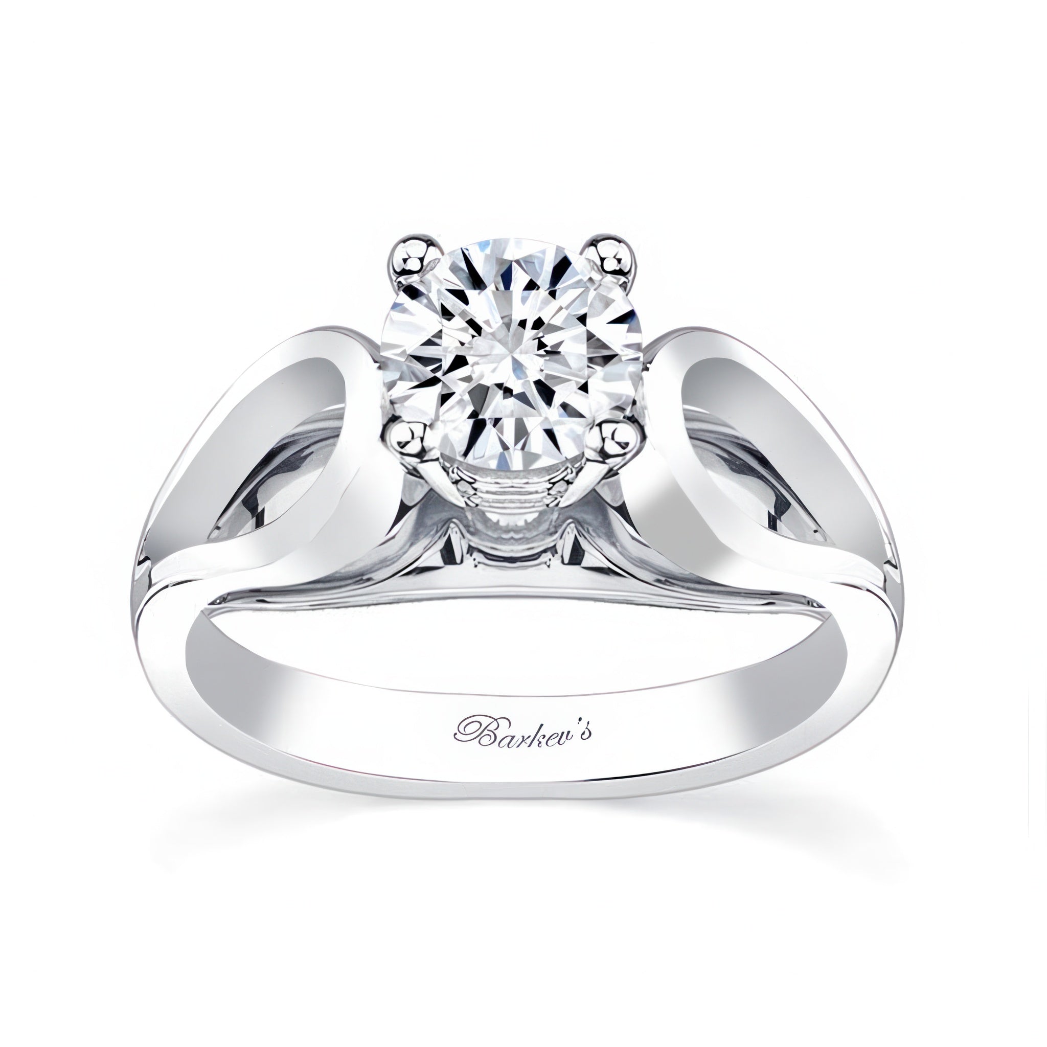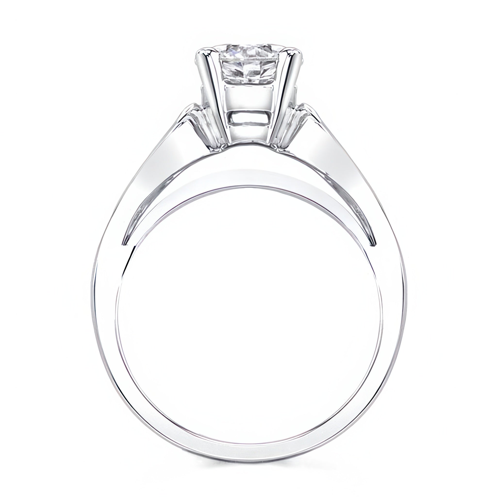 A stunning looping solitaire moissanite ring featuring a prong set round center with cathedral looping shoulders and a bridge for a dramatic look.