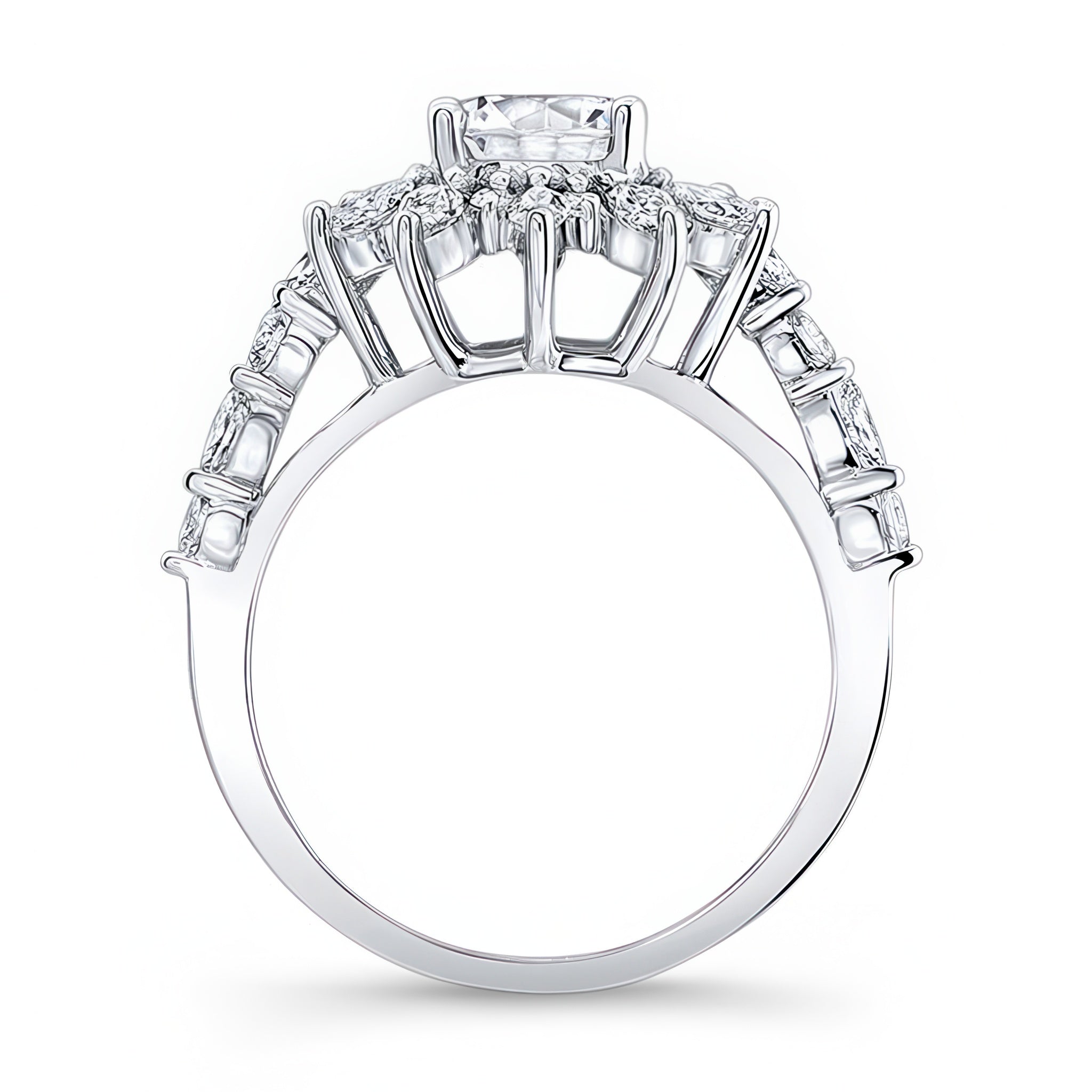 This lotus flower moissanite engagement ring radiates sophistication with a burst of alternating round and marquise diamonds encircling the round center. Shared prong set diamonds adorn the dainty shoulders for an added touch of elegance.