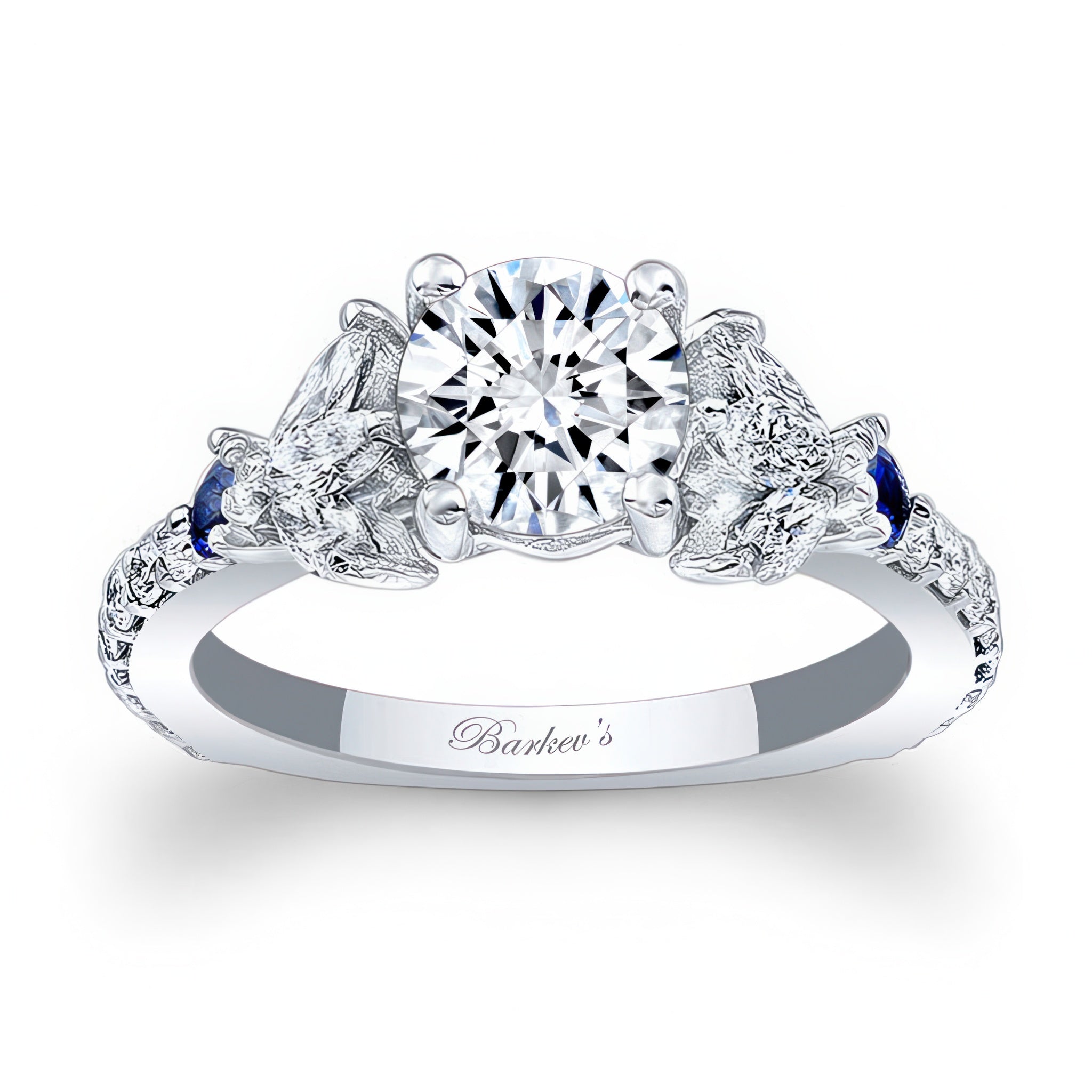 This marquise and round blue sapphire accent moissanite engagement ring features a prong set center with blue sapphires and fancy cut marquise and round diamonds embellishing the shoulders for an elegant flare.