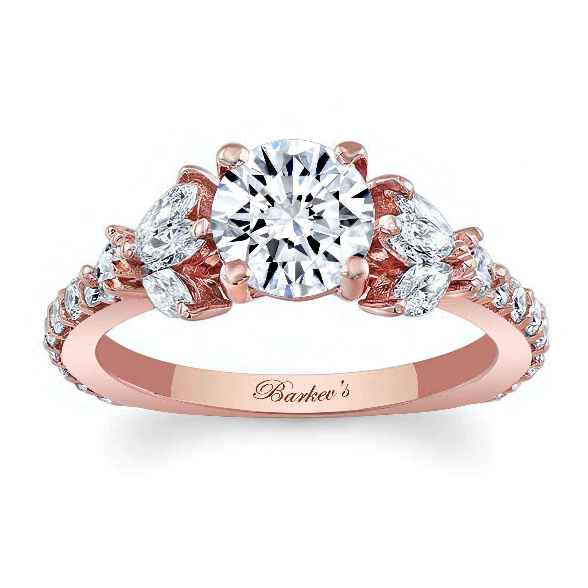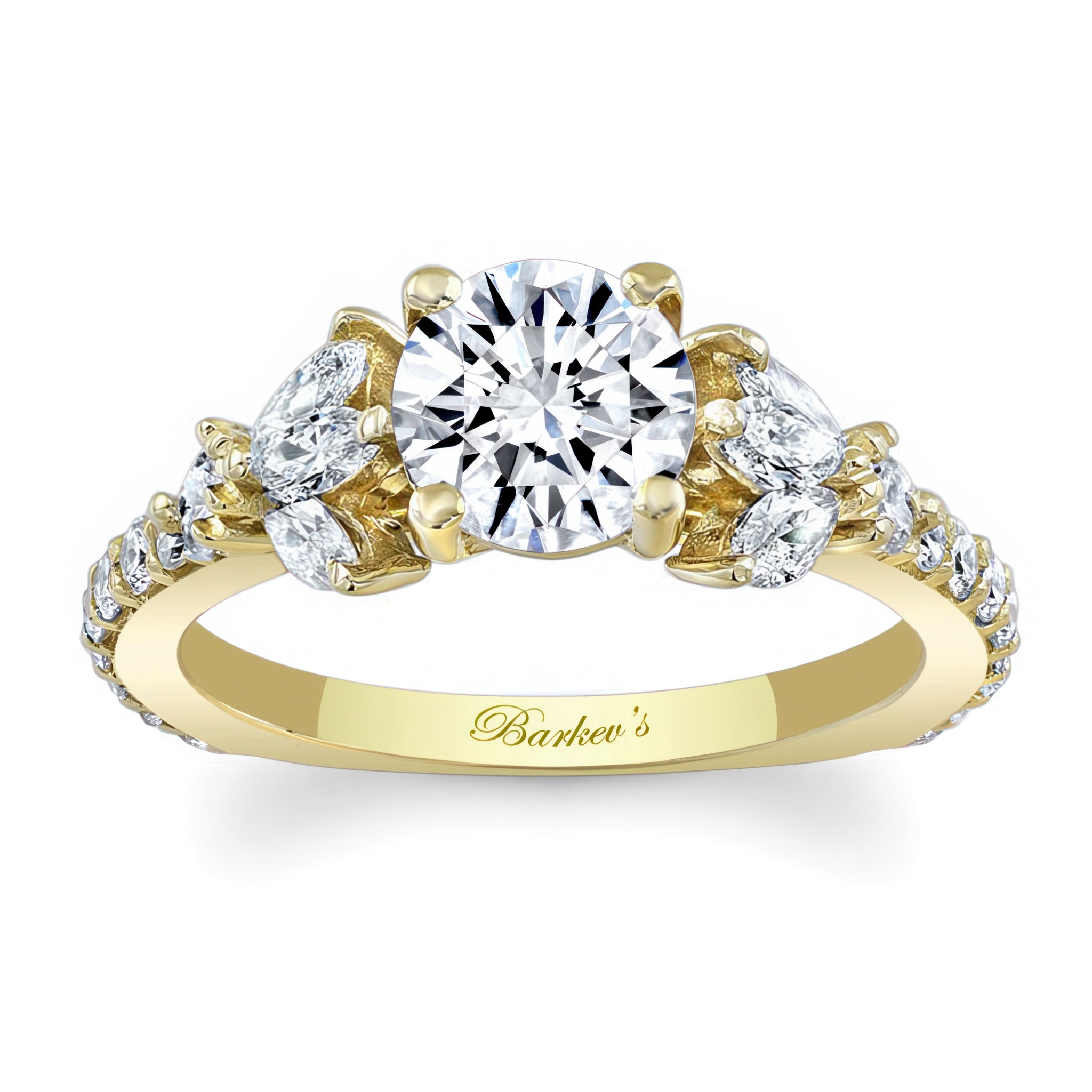 This marquise and round moissanite engagement ring features a prong set center with fancy cut marquise and round diamonds embellishing the shoulders for an elegant flare.