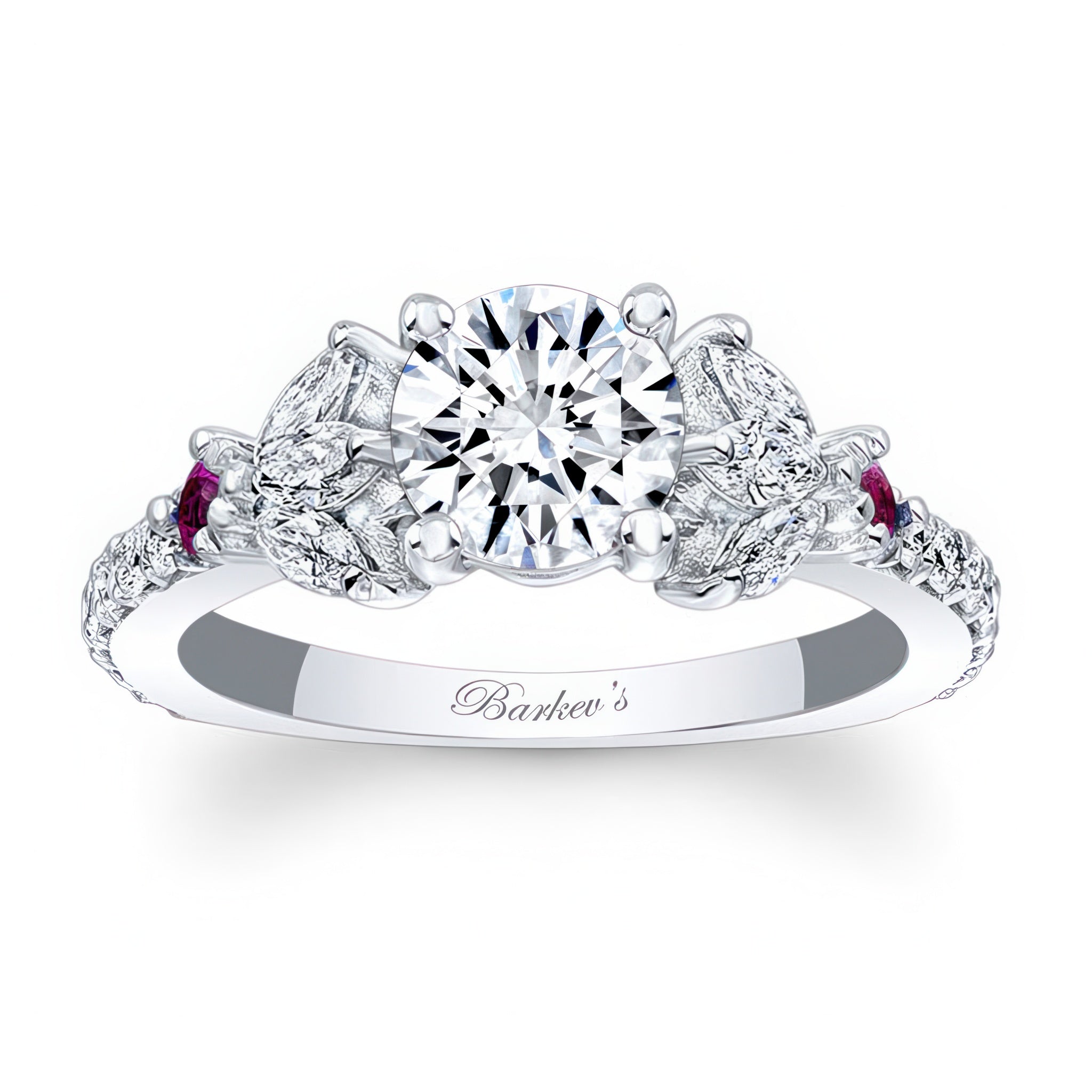This marquise and round pink sapphire accent moissanite engagement ring features a prong set center with pink sapphires and fancy cut marquise and round diamonds embellishing the shoulders for an elegant flare.
