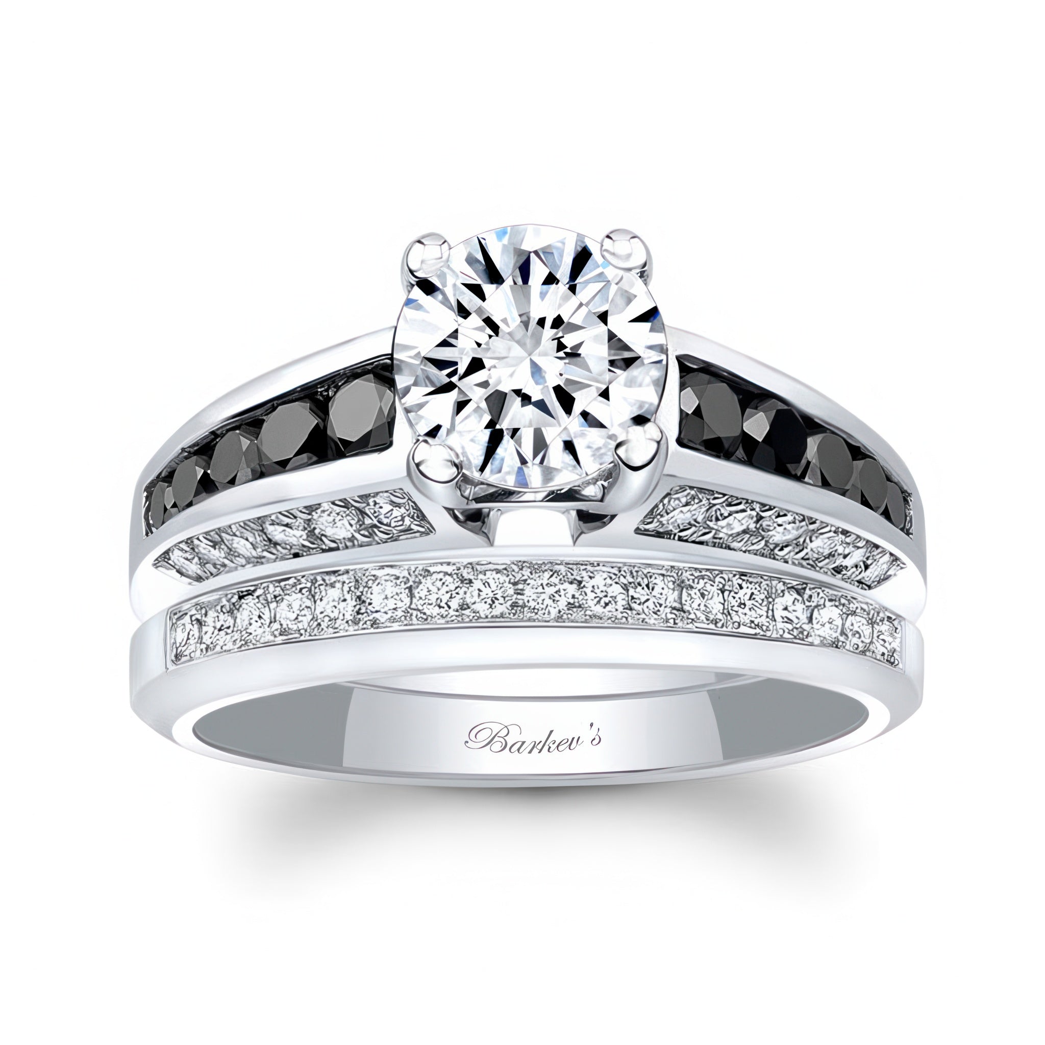 This magnificent moissanite channel set wedding ring set with black diamonds boasts with sparkle from every angle featuring beveled edges and a round center that is met by a row of channel set black diamonds and pave white diamonds adorning not only the top, but also each side of the shank. Adding to this brilliance, the diamond wedding band fits snuggly close to the engagement ring for an unparalleled look.