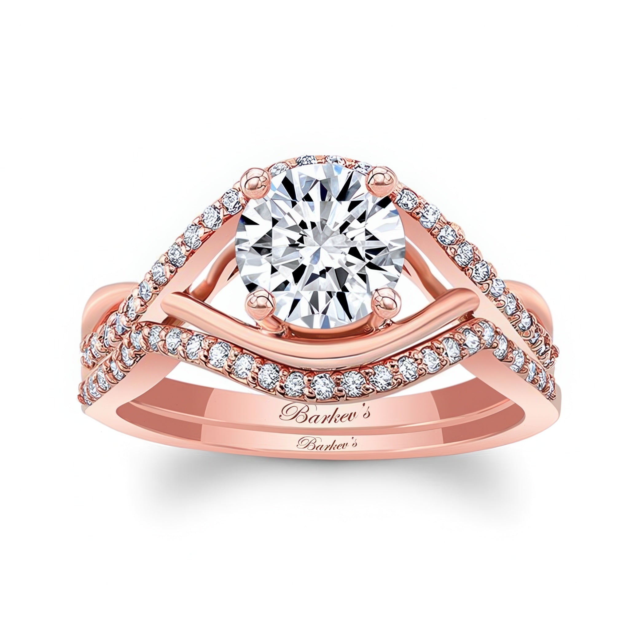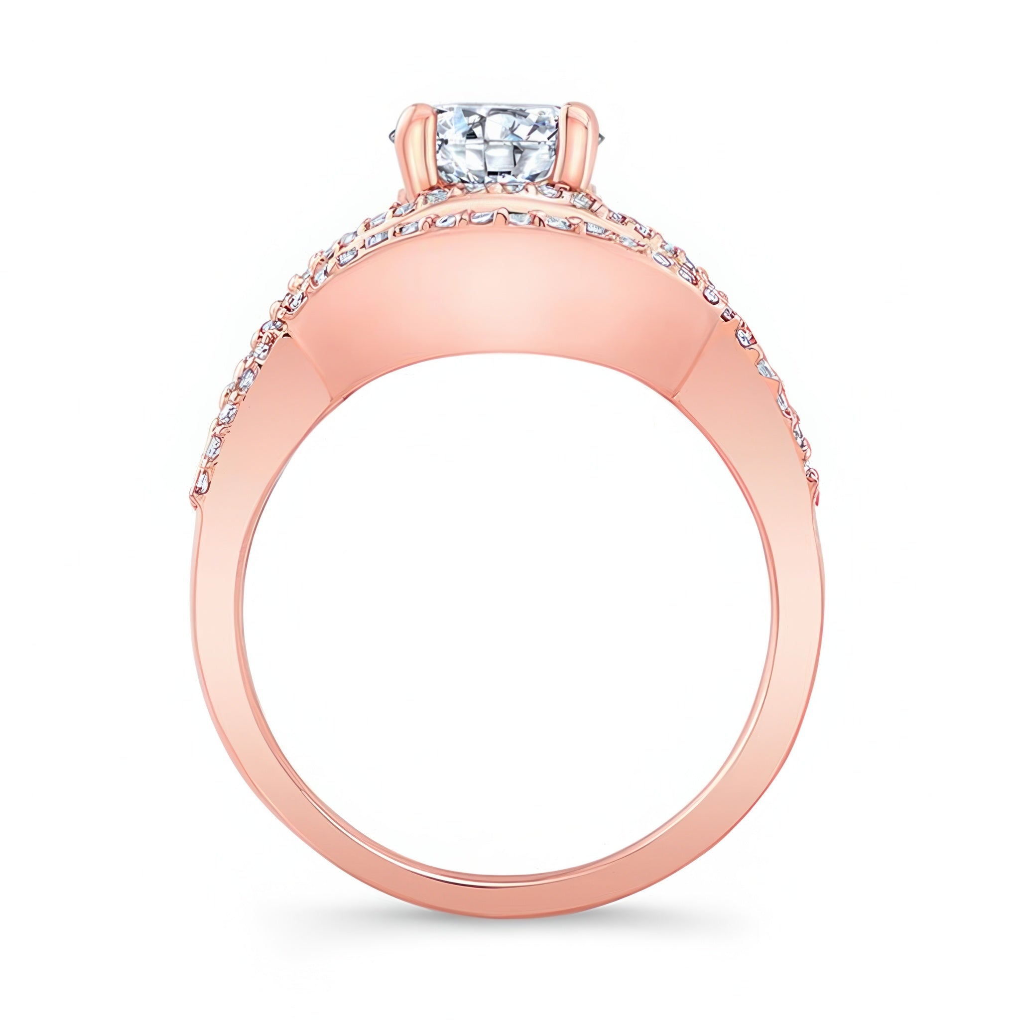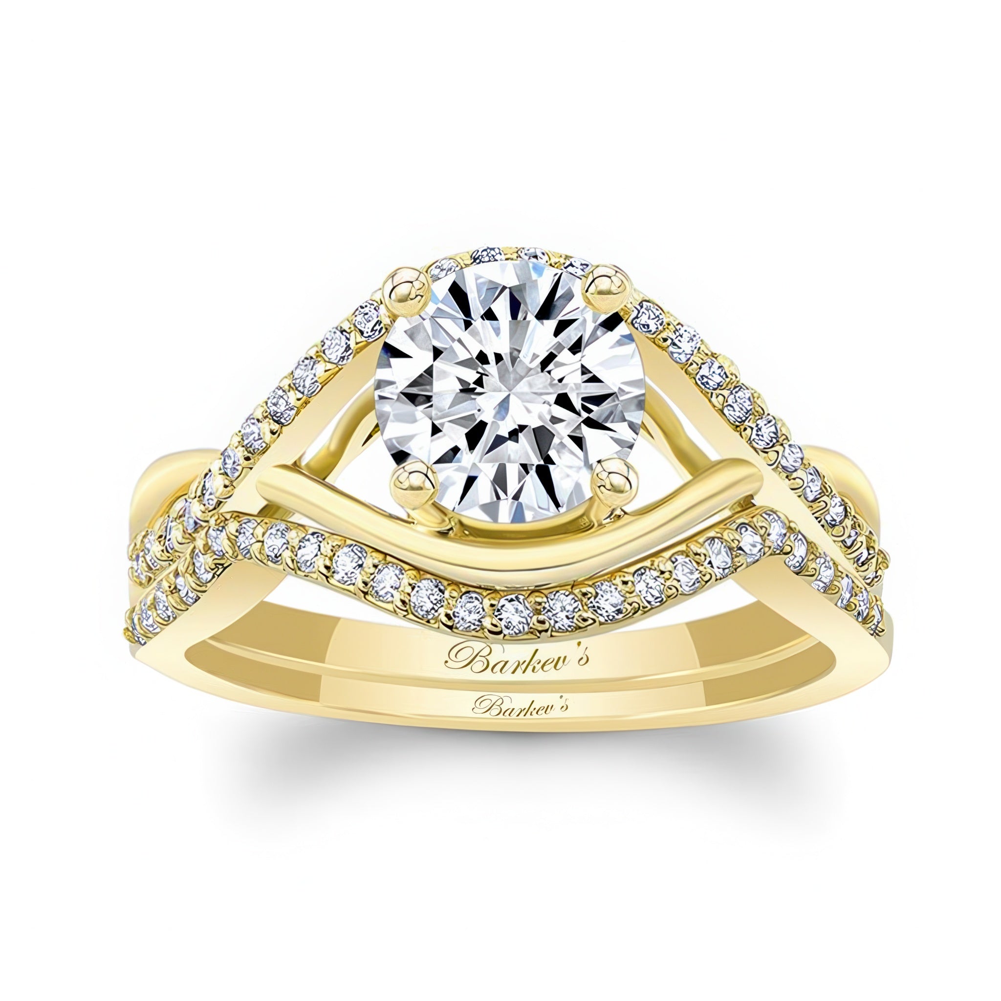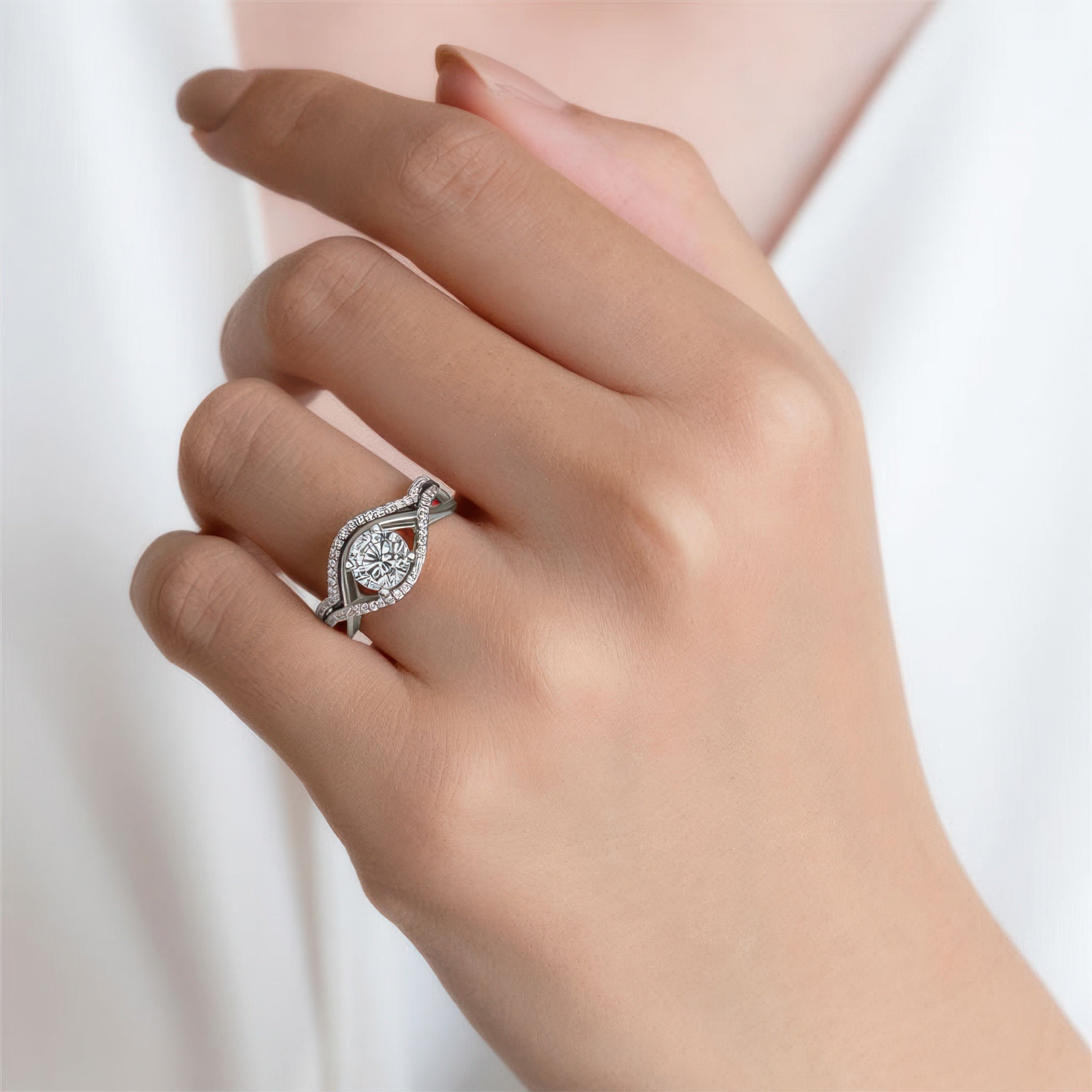 A beautiful moissanite criss cross ring set featuring a curving shank, shared prong set diamond melees and a round center stone. Also comes with a wedding band.