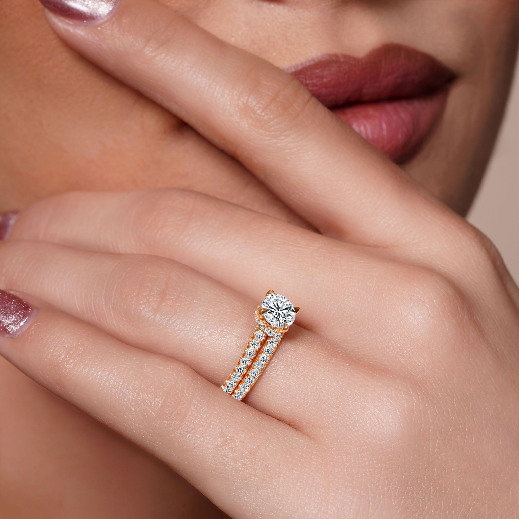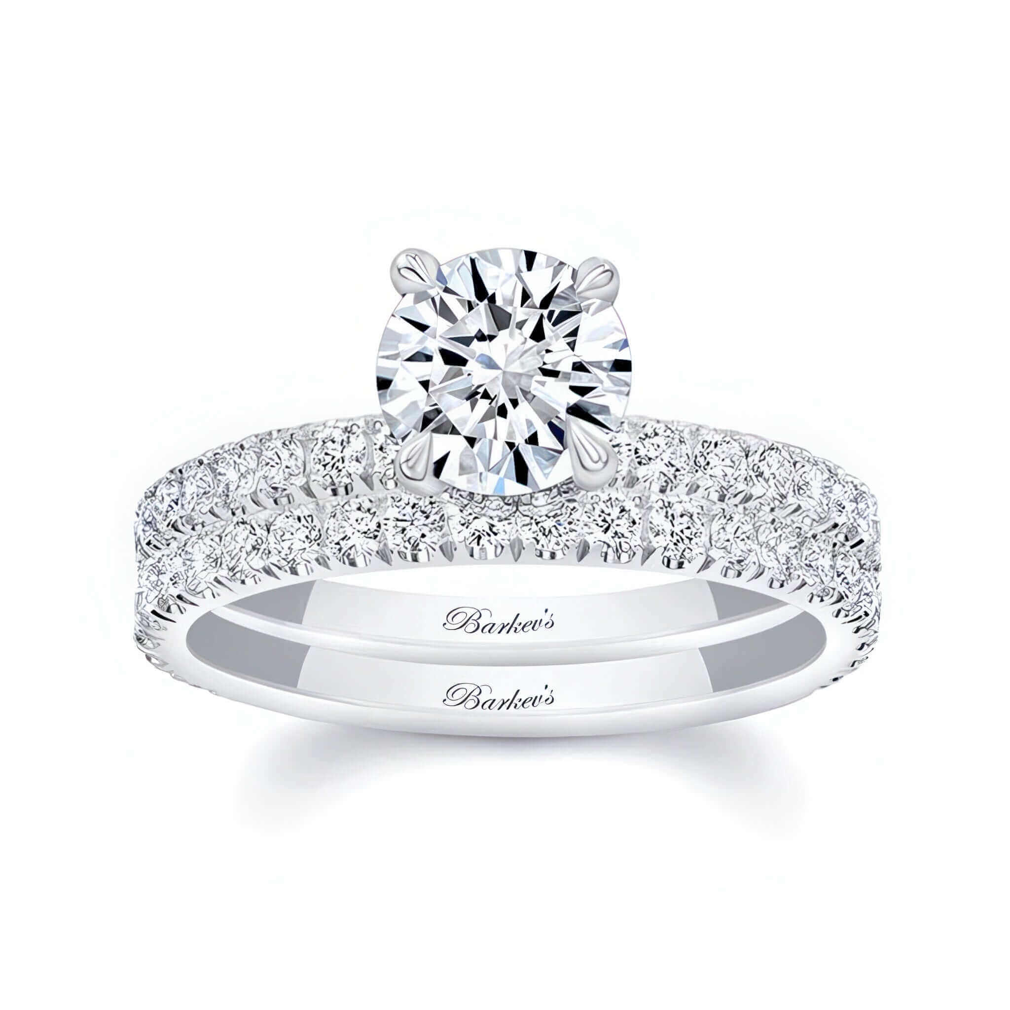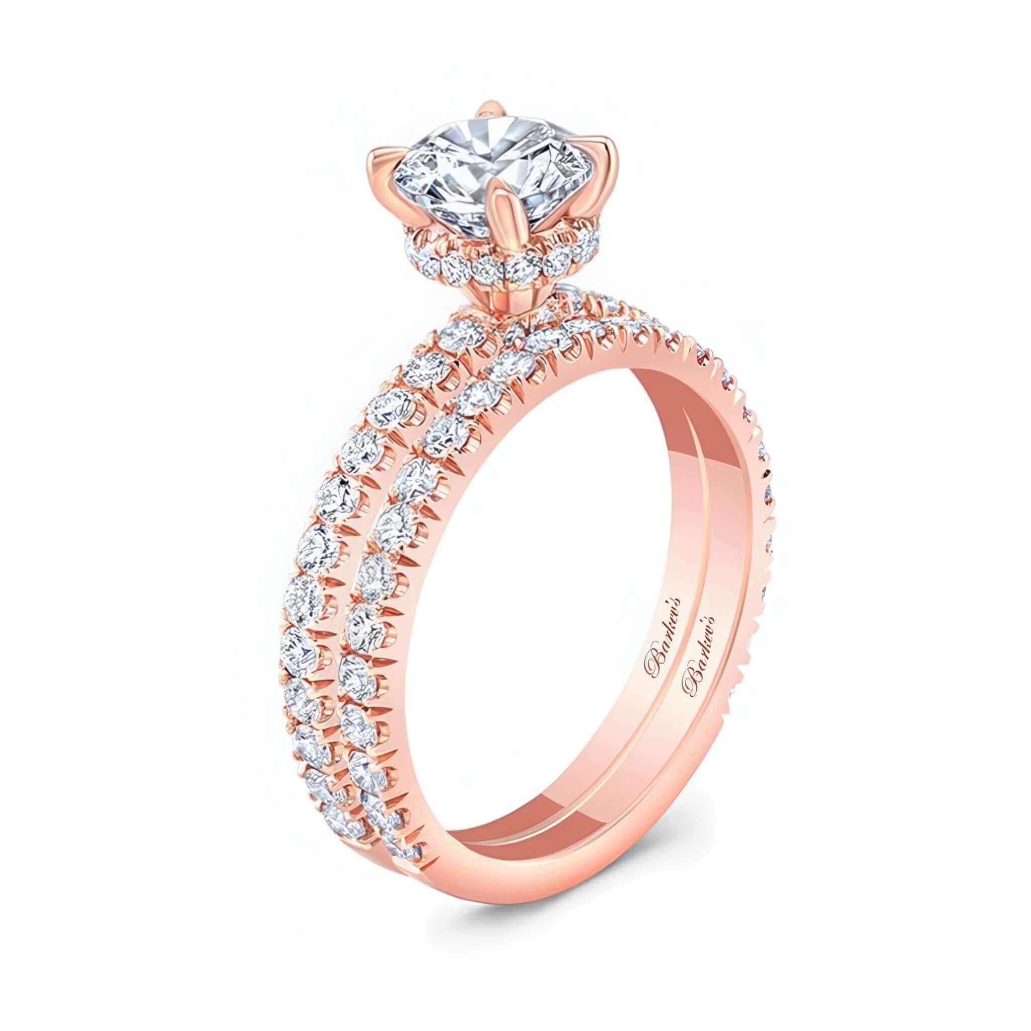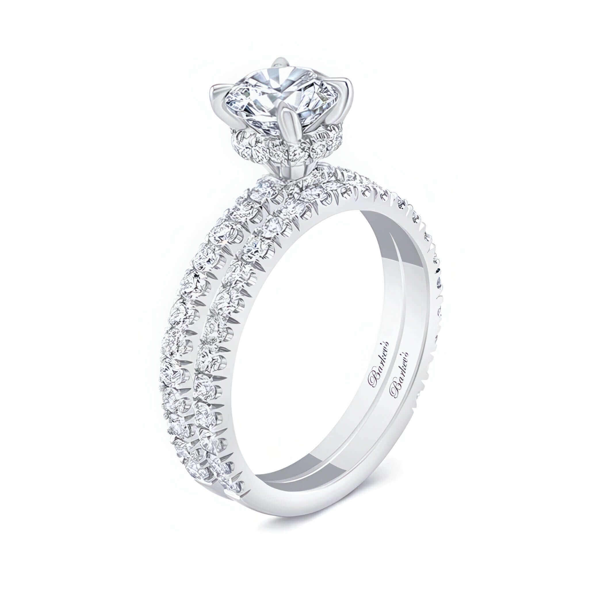 A brilliant moissanite halo wedding set featuring a prong set round center with a french cut pave diamond halo underneath it and more diamonds cascading down the shank. Comes with a matching diamond wedding band.