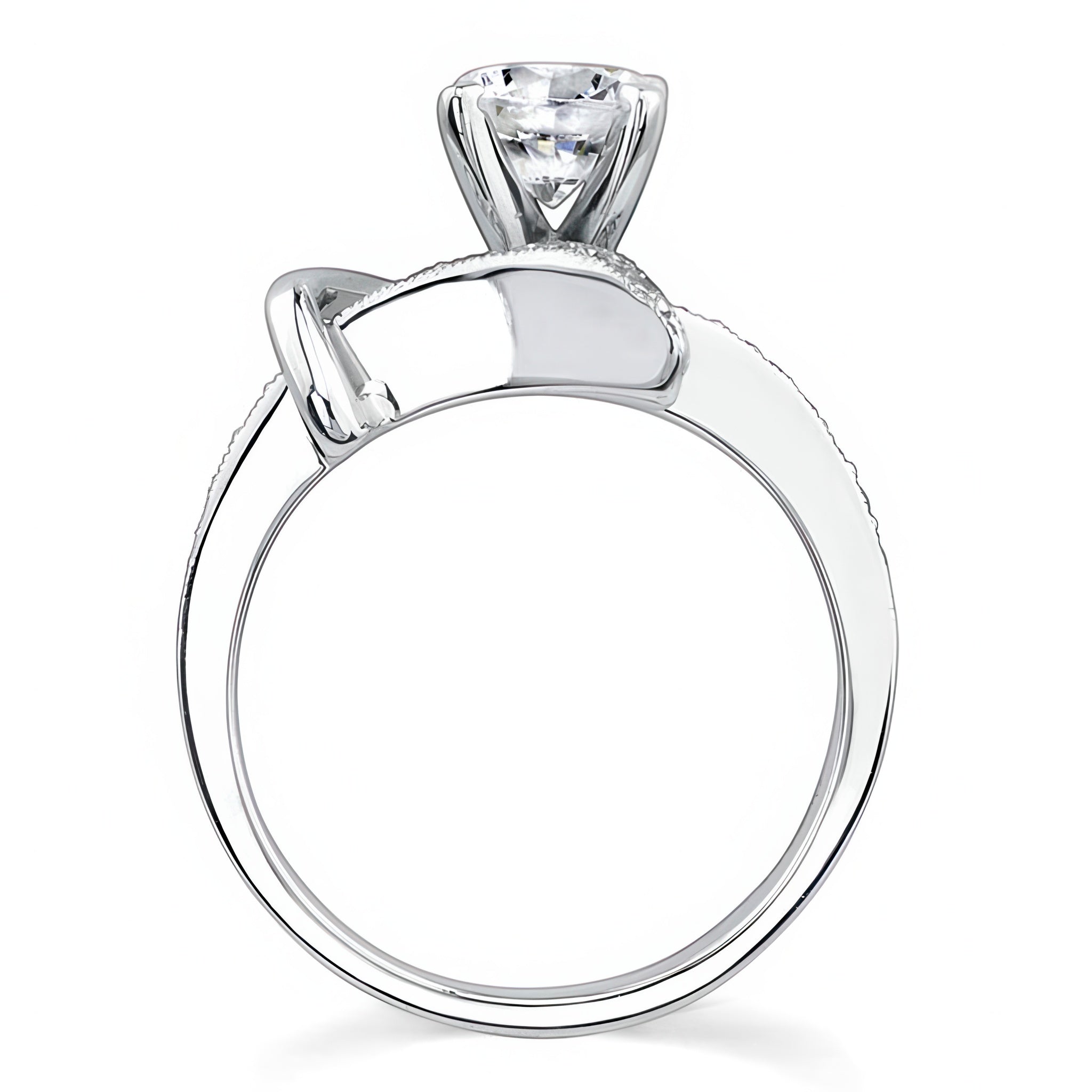 This unique moissanite milgrain engagement ring sports an offset shank and an unusual wire trim encircling the round center with pave set diamonds.