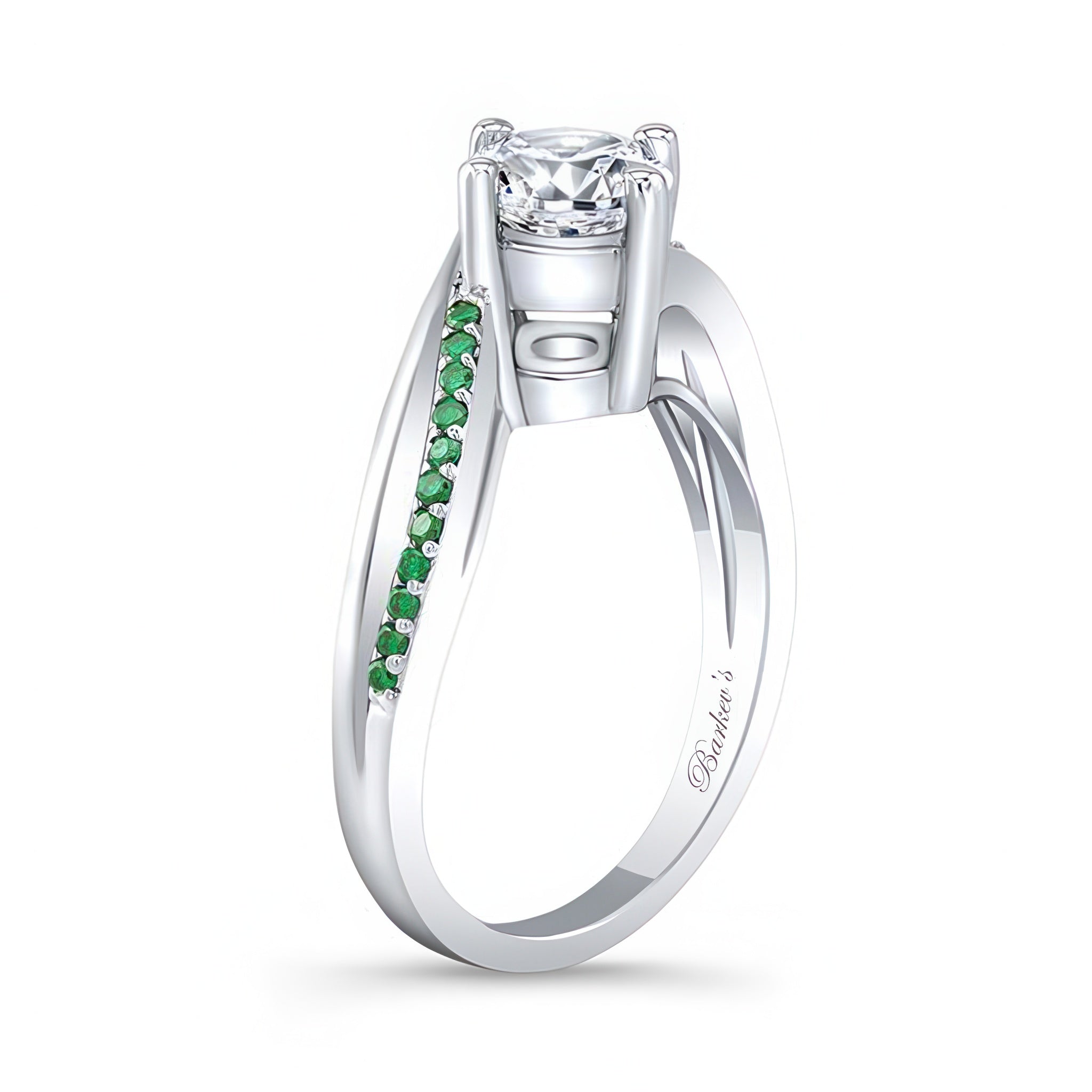 A moissanite split shank engagement ring with emeralds featuring a round center nestled between separated swirls adorned with emeralds for an extra touch of brilliance.