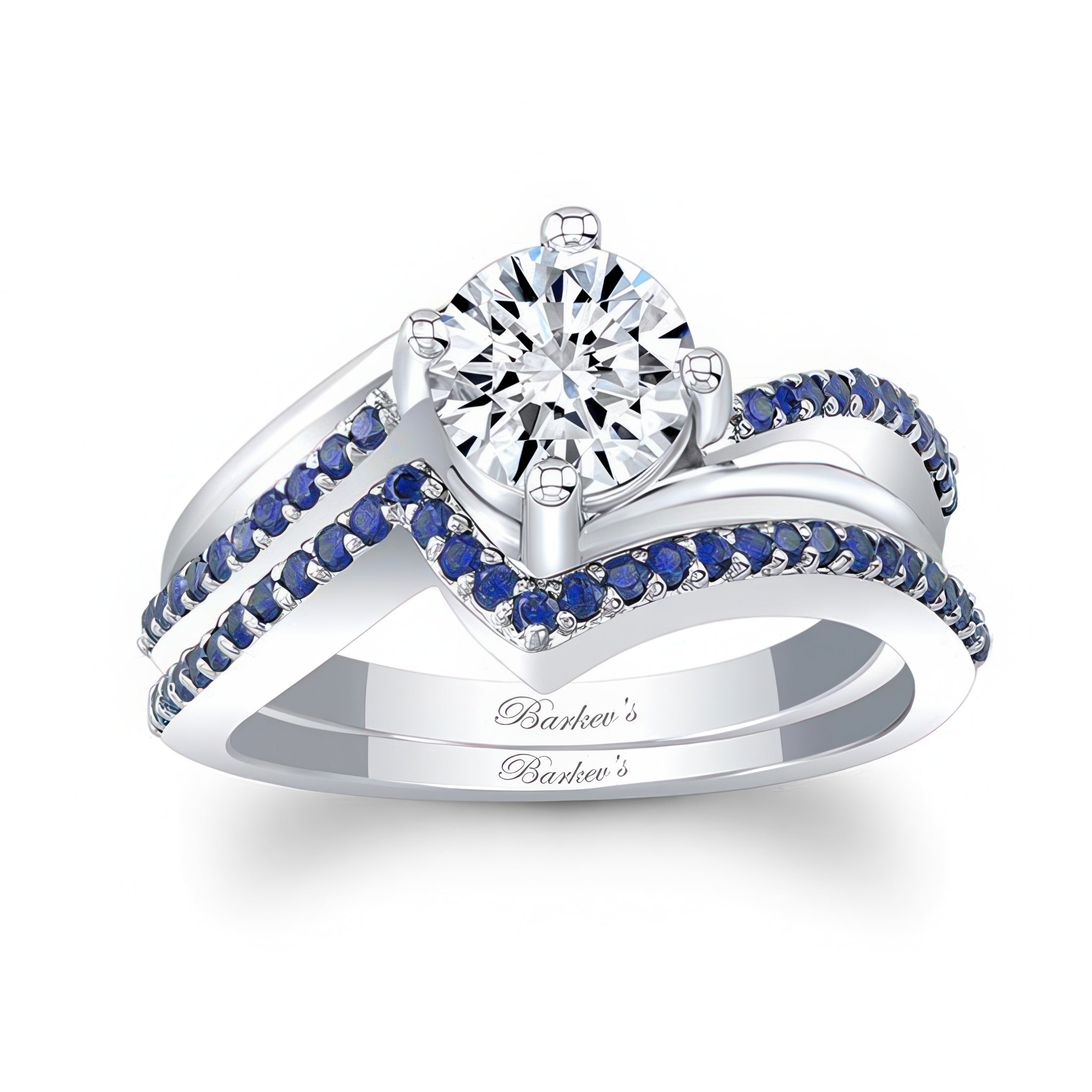 A moissanite split shank wedding set with blue sapphires featuring a round center nestled between separated swirls adorned with blue sapphires for an extra touch of brilliance. Comes with a matching wedding band.