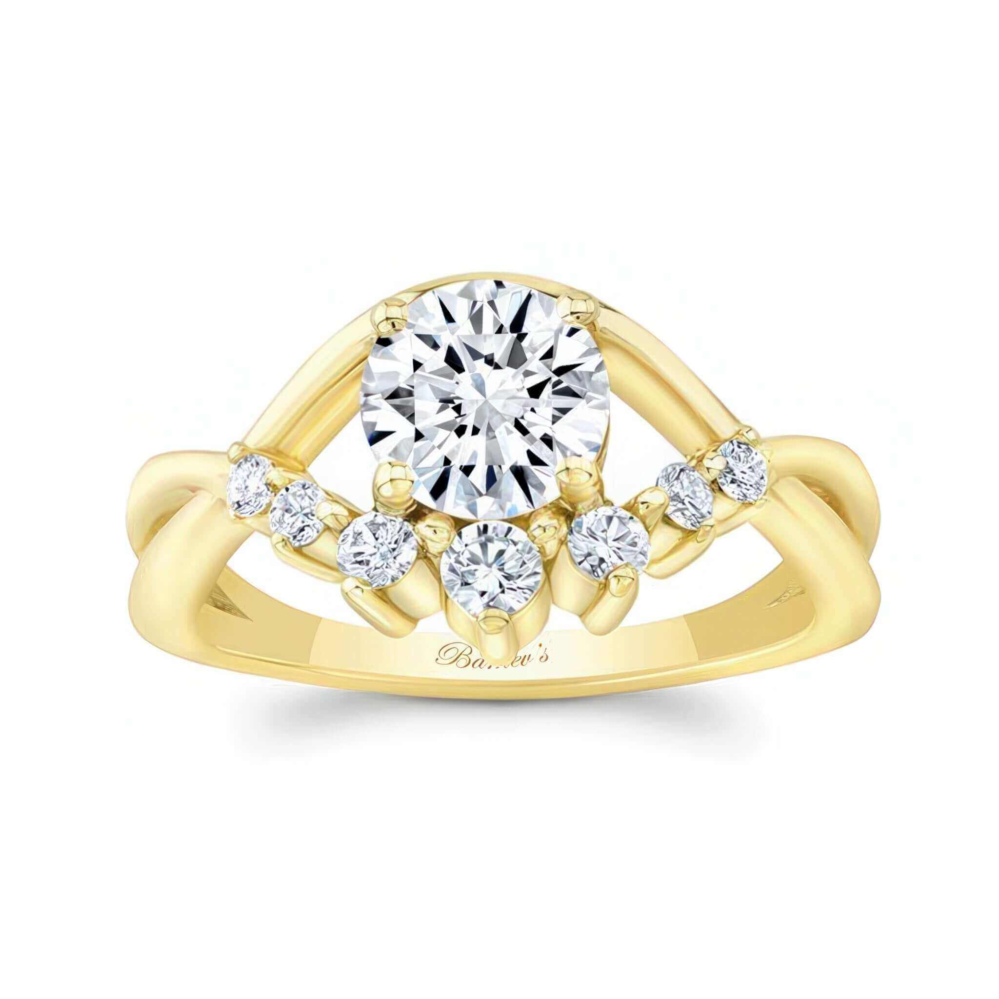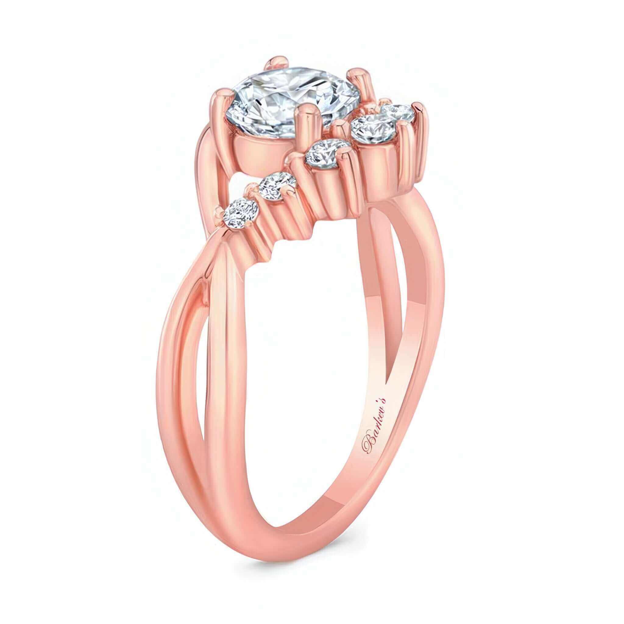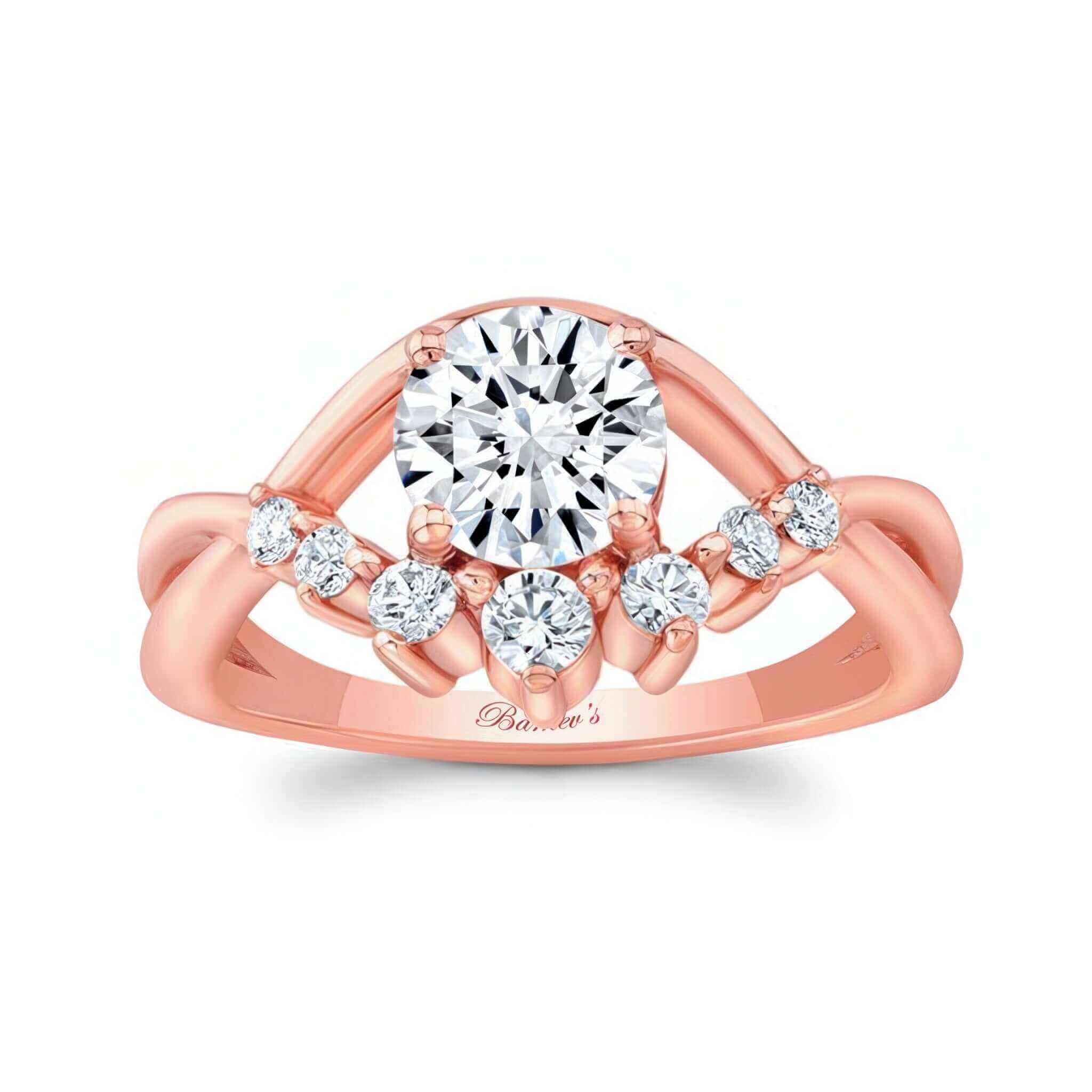 This moissanite unique engagement ring grabs attention with a flare swirling on one side adorned with shared prong set diamonds and a round center stone.