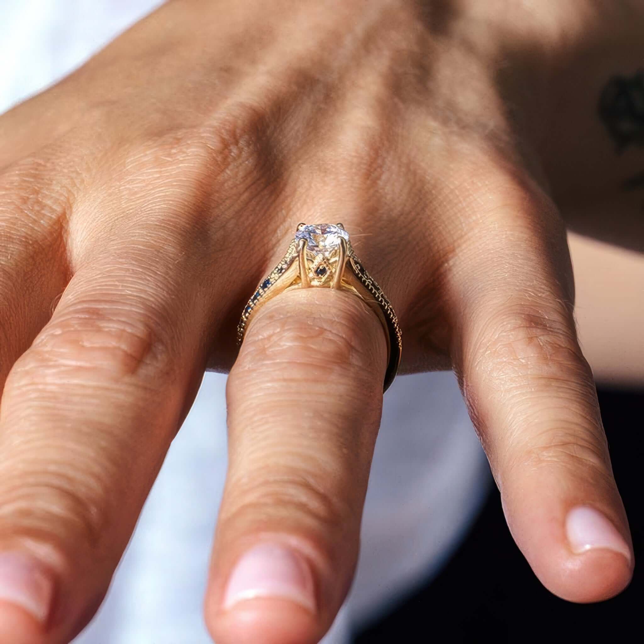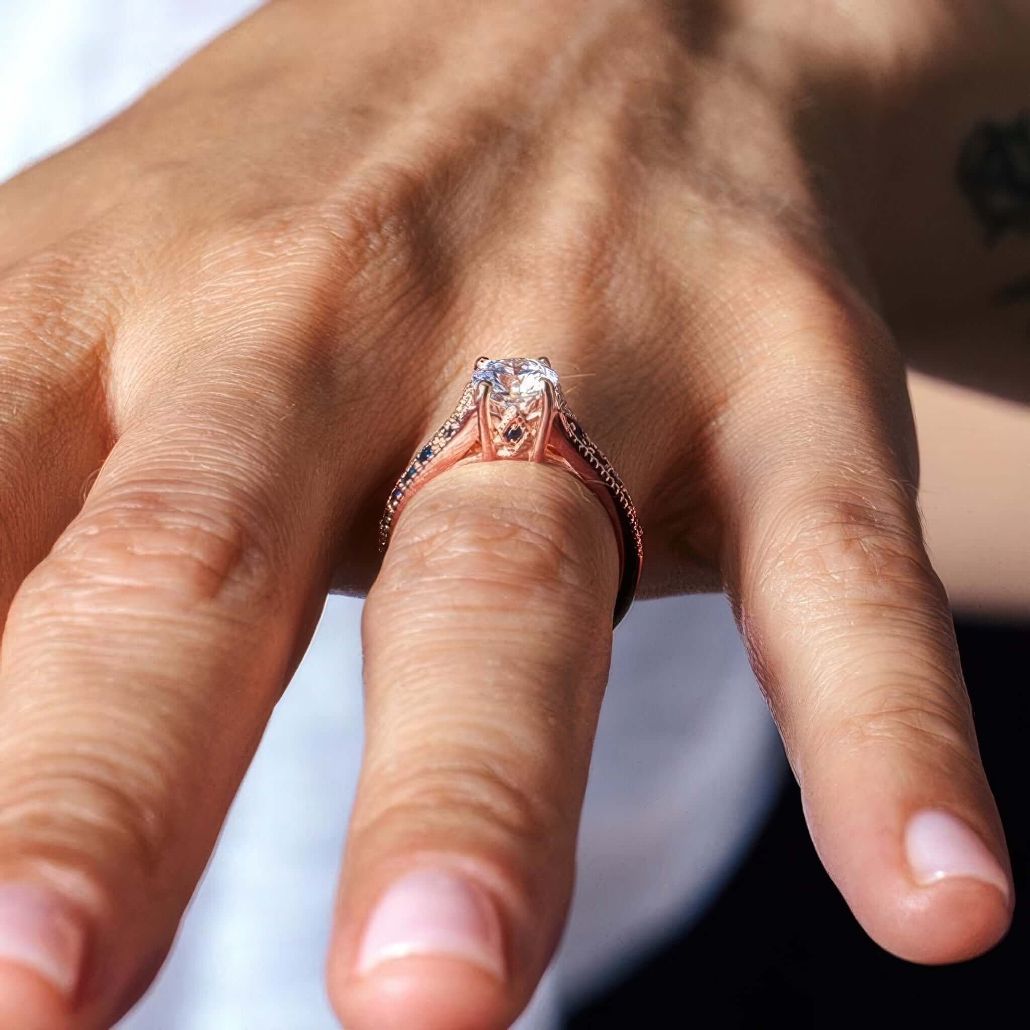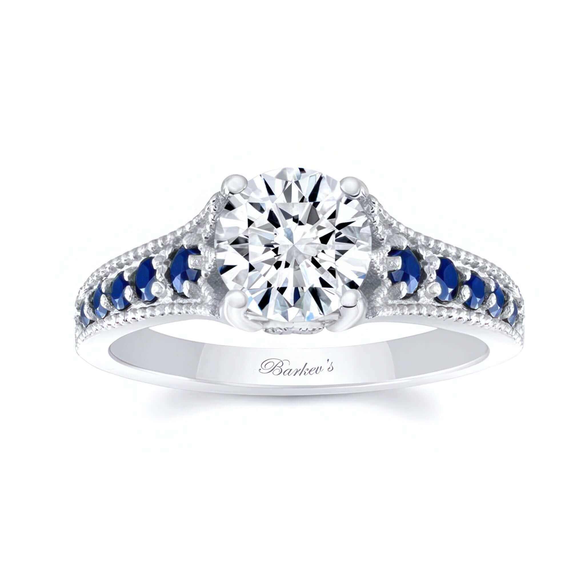 This beautiful moissanite vintage ring with blue sapphires features a prong set round center with shared prong set blue sapphires on the sides and a milgrain finish for a vintage look.
