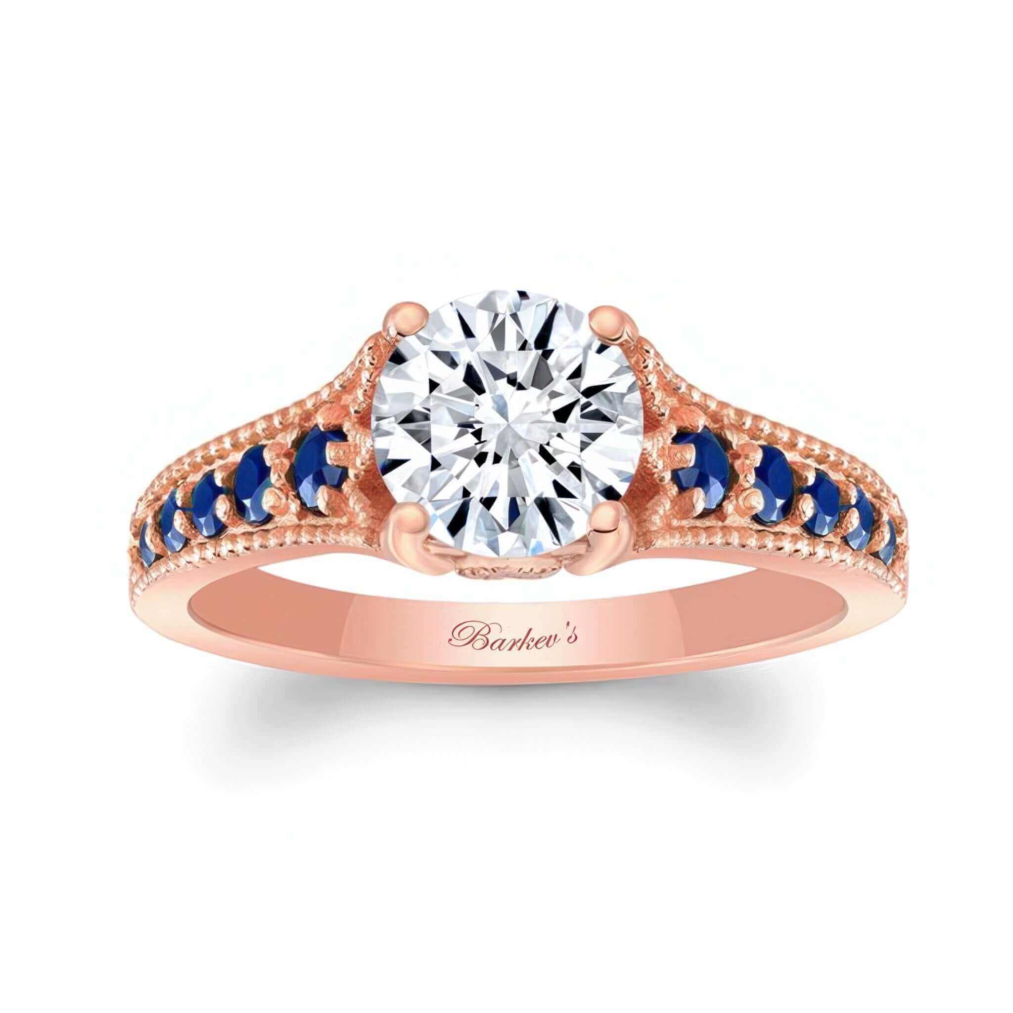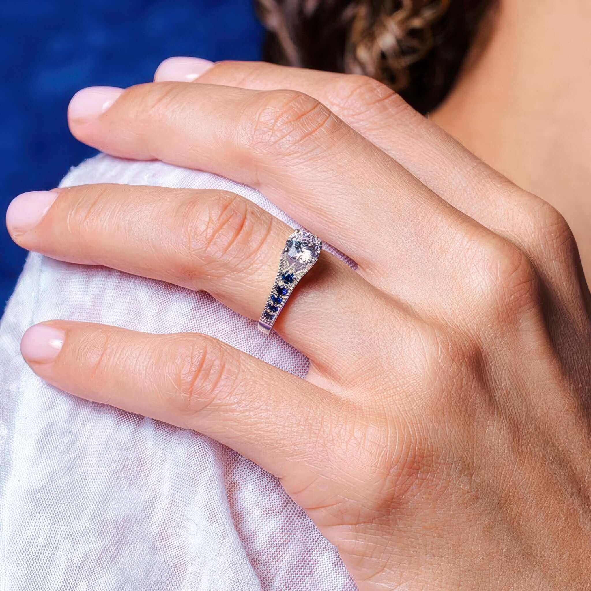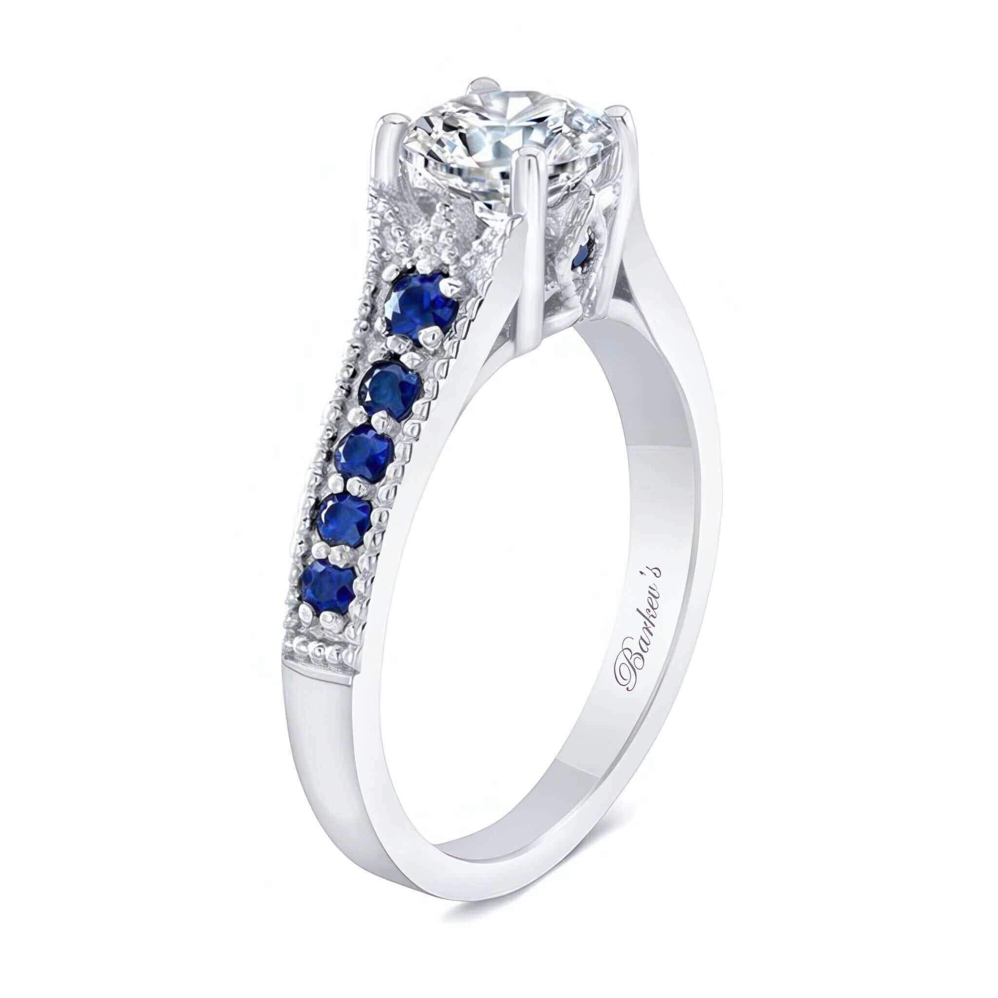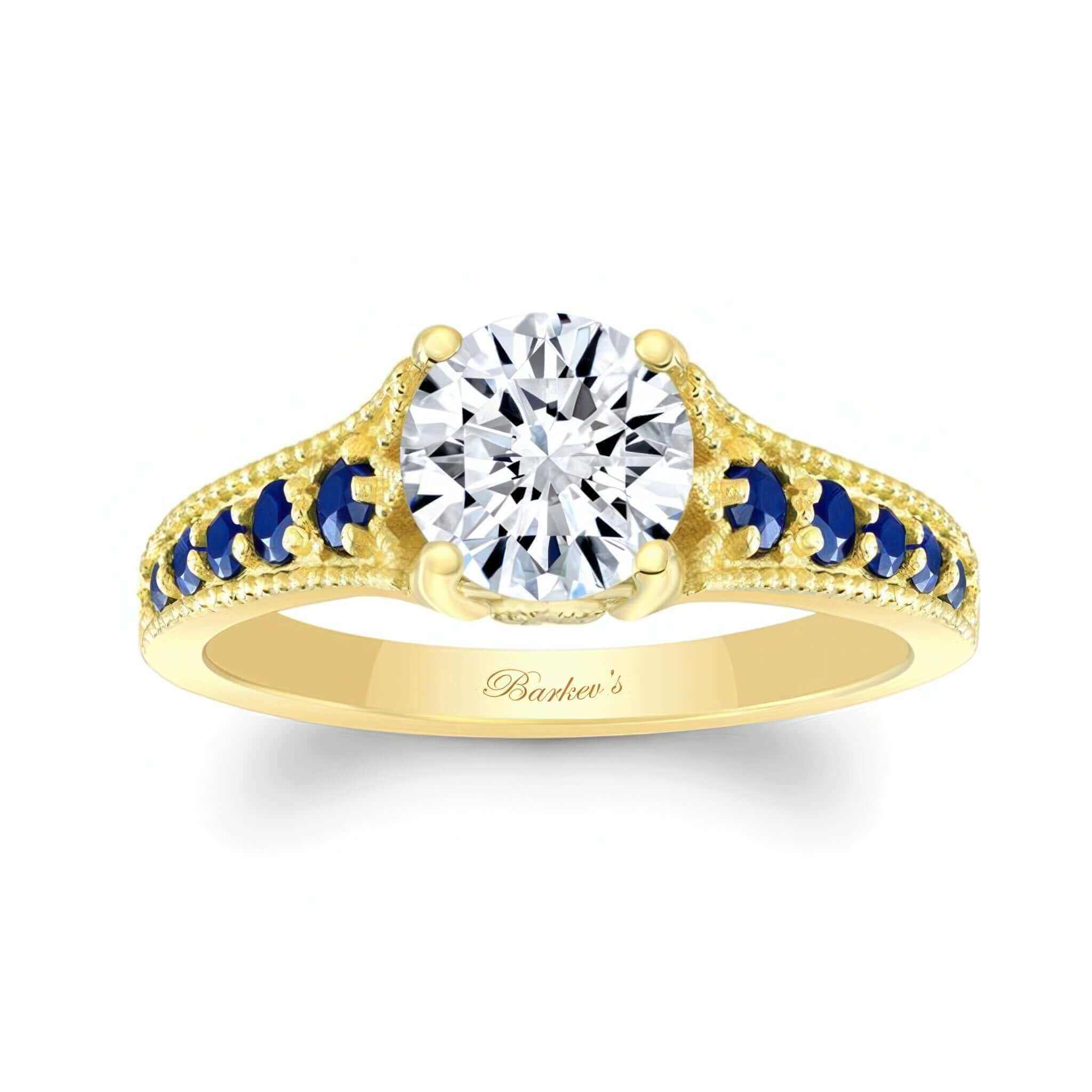 This beautiful moissanite vintage ring with blue sapphires features a prong set round center with shared prong set blue sapphires on the sides and a milgrain finish for a vintage look.