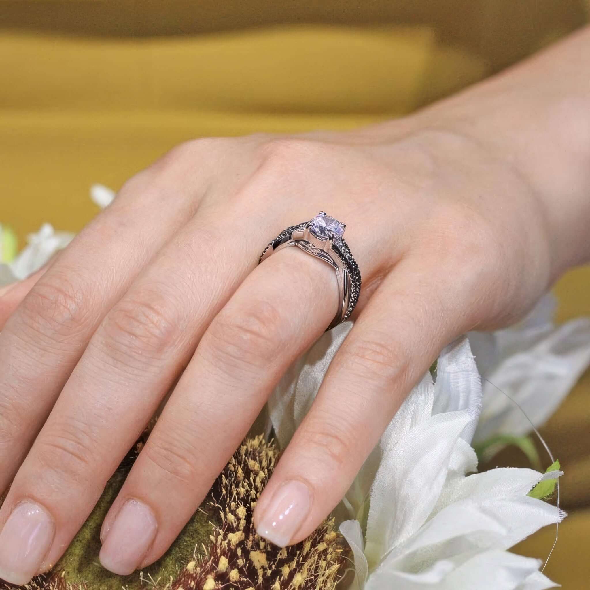 A simple one carat moissanite black diamond accent bridal set featuring a round center, a criss crossing split shank and shared prong black diamonds on the sides. Comes with a matching wedding band.