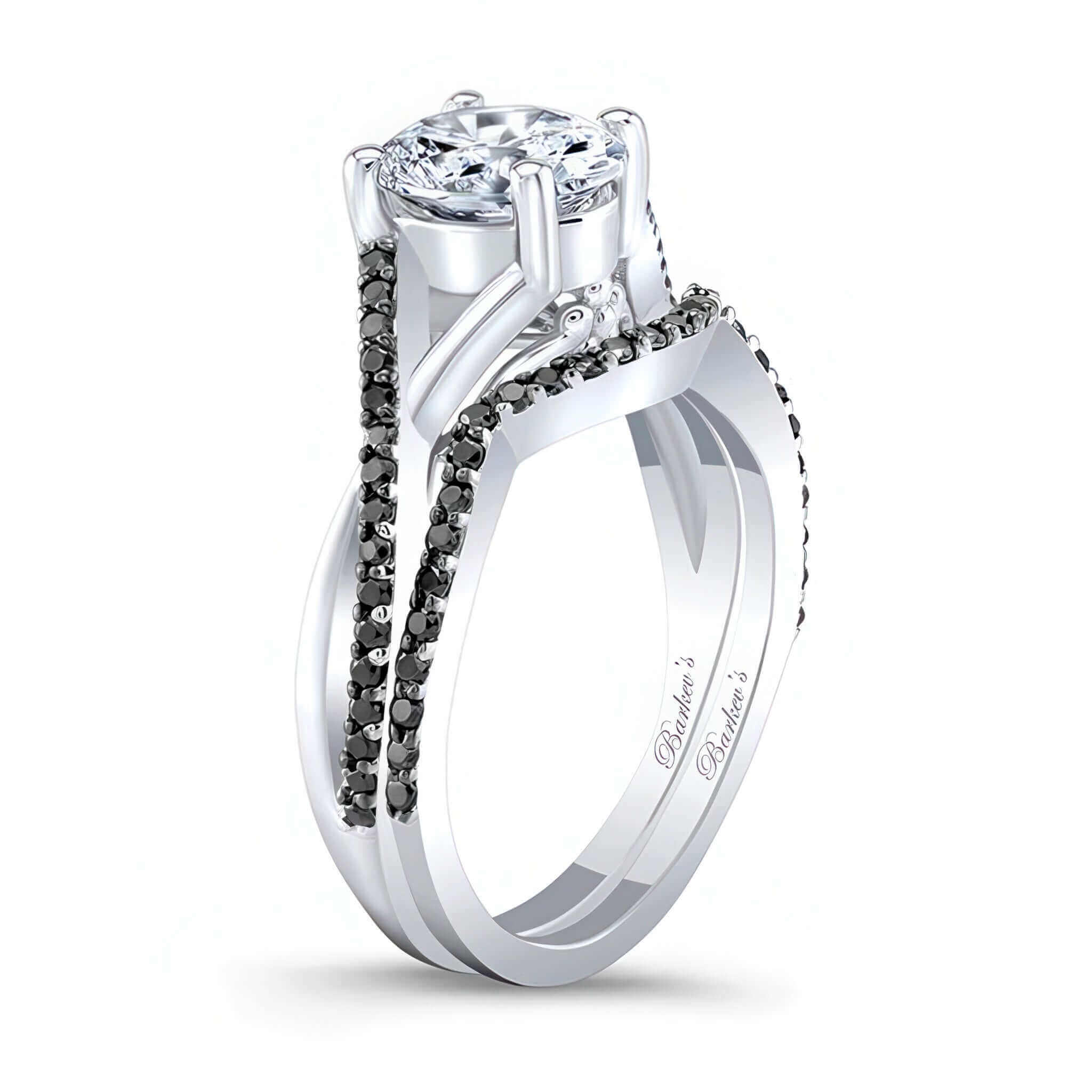 A simple one carat oval moissanite black diamond accent bridal set featuring an oval center, a criss crossing split shank and shared prong black diamonds on the sides. Comes with a matching wedding band.